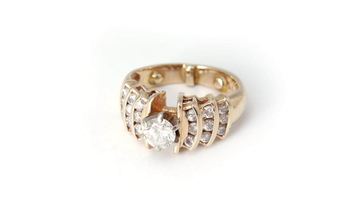 .9O CTW DIAMOND RING: 14K yellow gold ring centers one round brilliant cut diamond of approx. .40 Ct., rated SI2 in clarity and H in color. An additional 18 round full cut diamonds total approx. .50 Ct. The diamonds average SI in clarity and H-I in color. The center diamond is prong set. The small diamonds are channel set. Weight: 5.8 grams. Size: 4.5