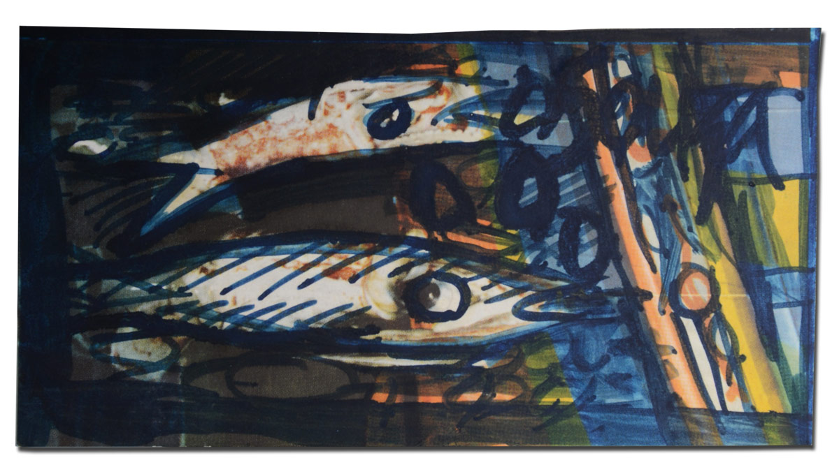 SOUZA, Francis Newton, (Indian, 1924-2002): Mixed Media on Magazine Paper of Fish, 3'' x 5 3/4'', signed upper right, unframed.