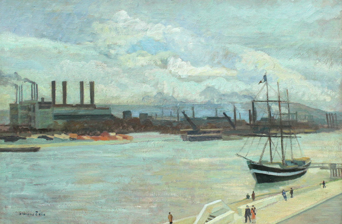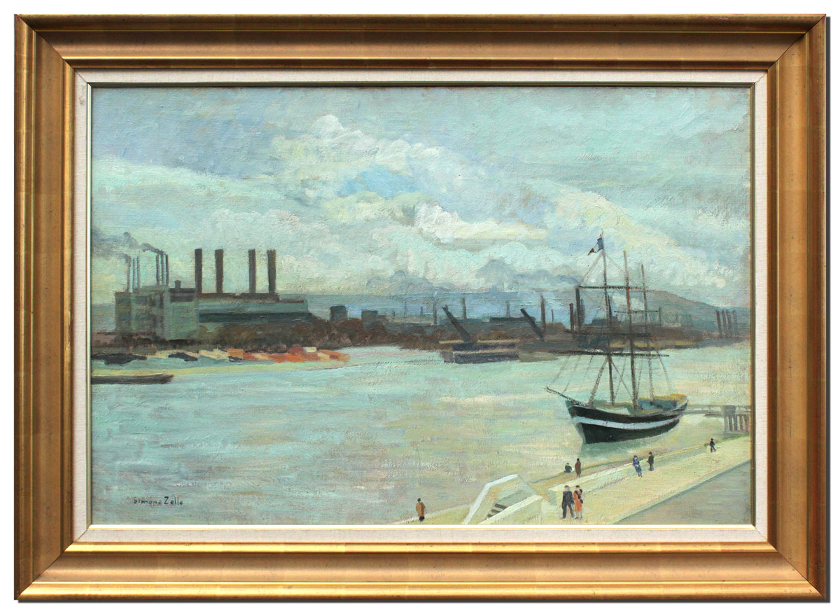 ZELLE, Simone,(European, 20th Century): Industrial Harbor Scene, Oil/Canvas, 21 1/4'' x 32'', signed lower left, fine contemporary gilded frame 27 3/4'' x 39 1/2''.
