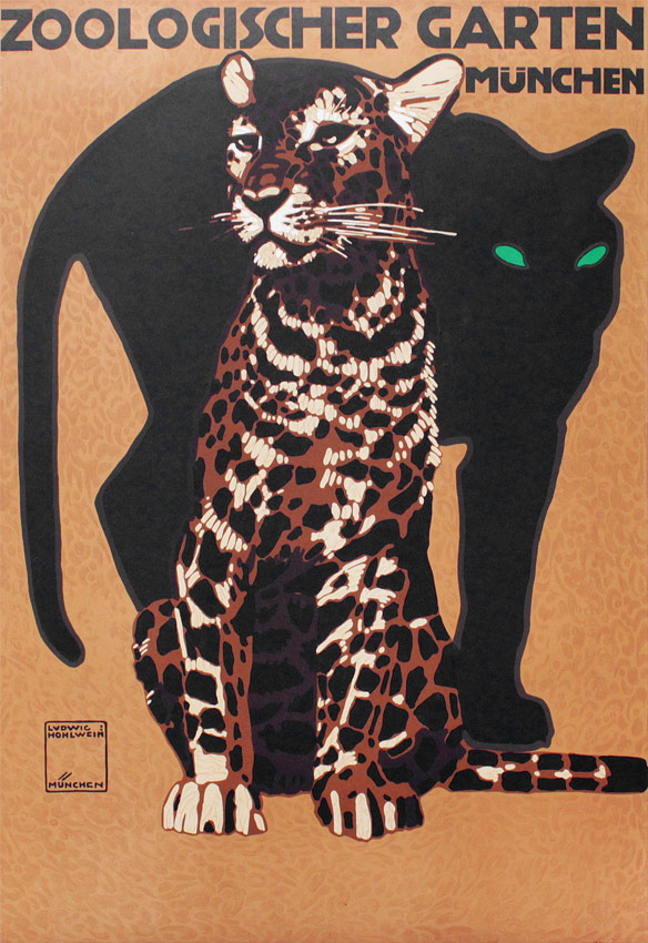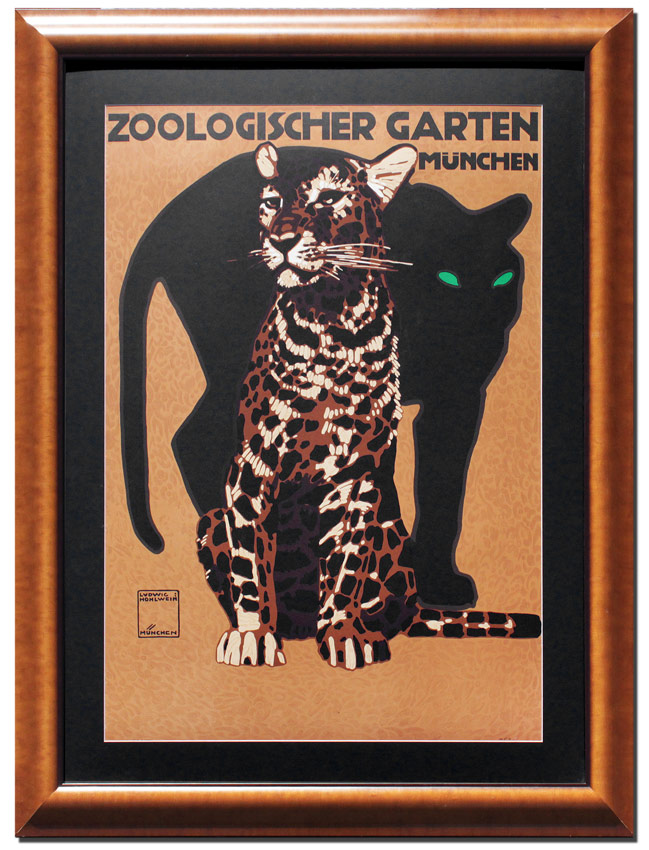 HOHLWEIN, Ludwig ''After'', (German, 1874-1949): ''Zoologischer Garten Munchen (Leopard)'', Printed for Re Society Limited by S Atelier, New York, City, 1997, inspired by the poster created by Ludwig Hohlwein, art work particulars and authenticity affixed verso, Sight size 46'' x 33'', custom wood frame and matting, 60 1/2'' x 47''.
