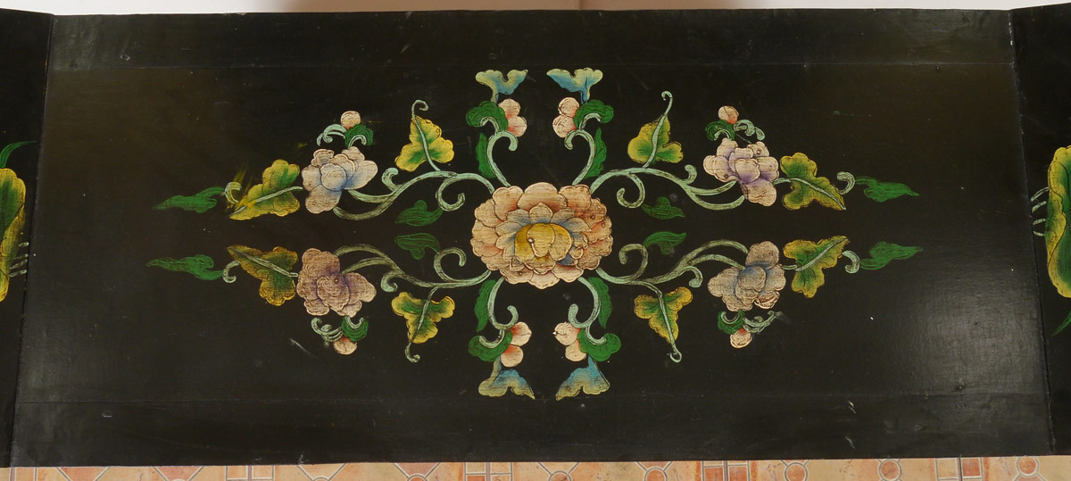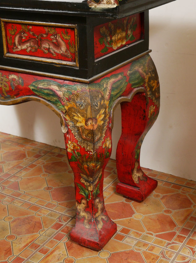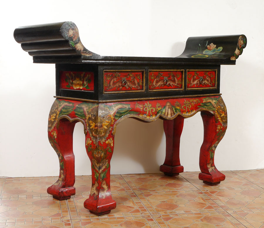 PAINT DECORATED CHINESE ALTAR TABLE: Black lacquer top, red lacquer base with floral motif all over, masquerons at top of legs. Shaped top over 3 drawers, shaped legs. Age unknown. 38'' h. x 56'' x 17 1/2''