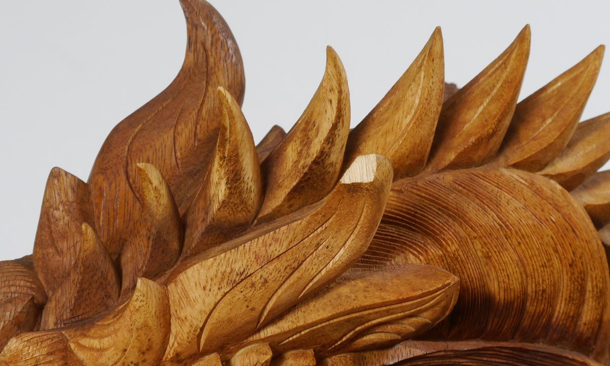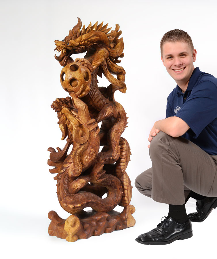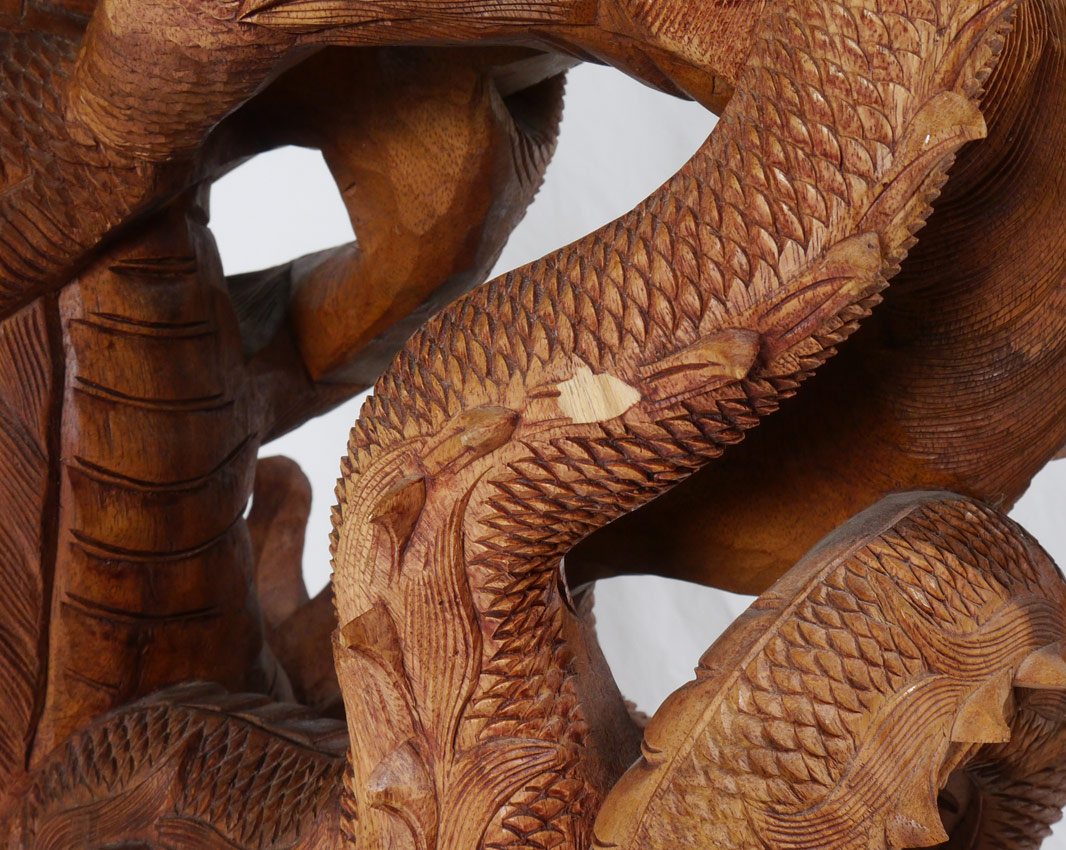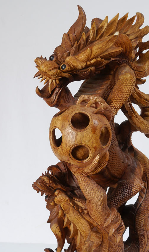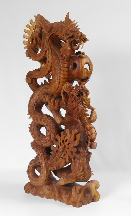 CARVED SUAR WOOD SCULPTURE OF COMBATIVE DRAGONS: Exceptional detail with one dragon clenching a mystery ball in it's claw. Actual age unknown. 43 1/2'' tall x 7 1/2'' w x 17 1/2''.
