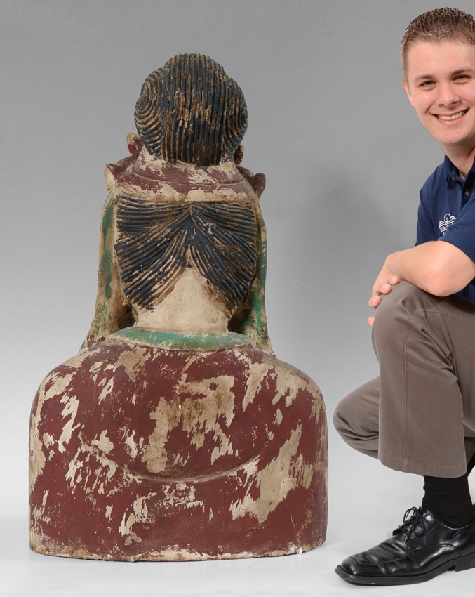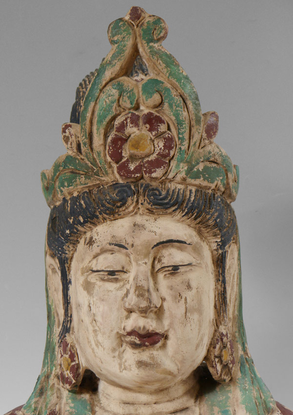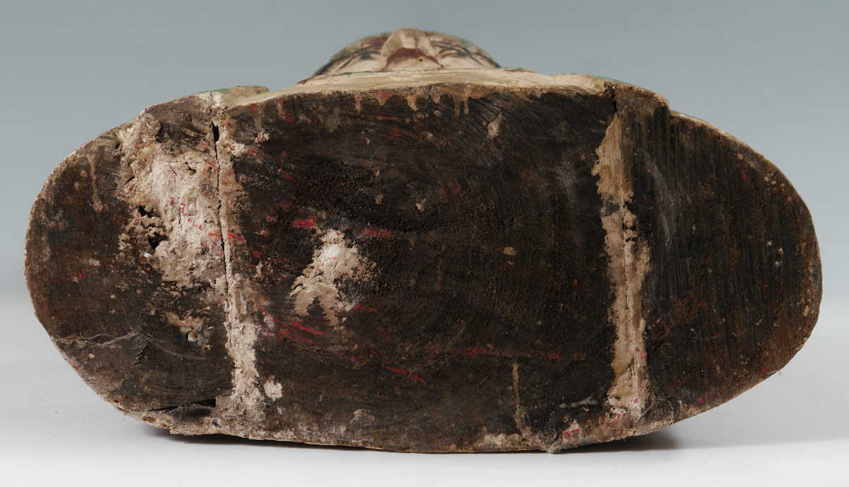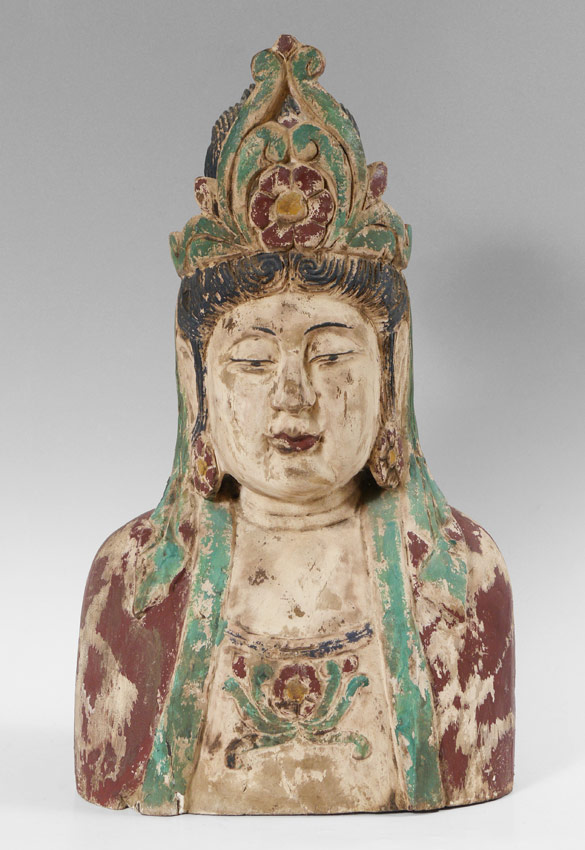 CARVED WOODEN POLYCHROME BUST OF BUDDHA: Actual age unknown. 31 3/4'' h. x 17'' x 10''.