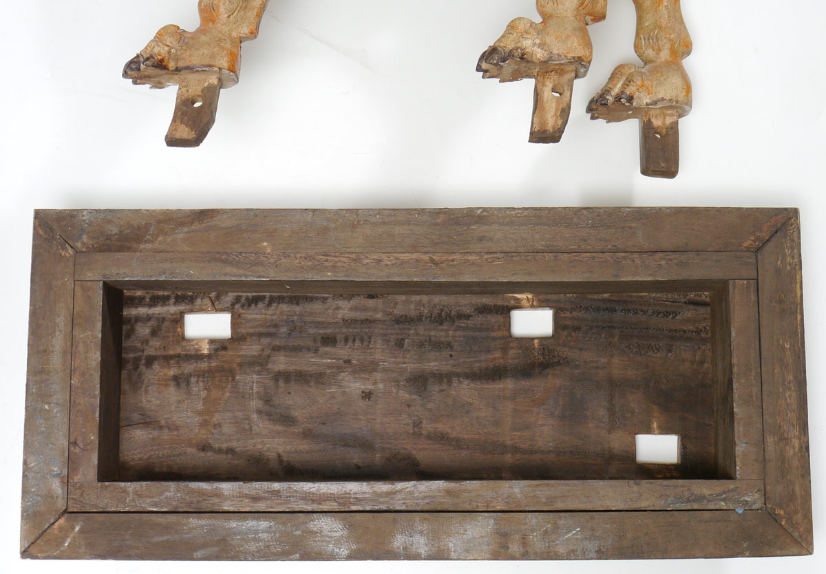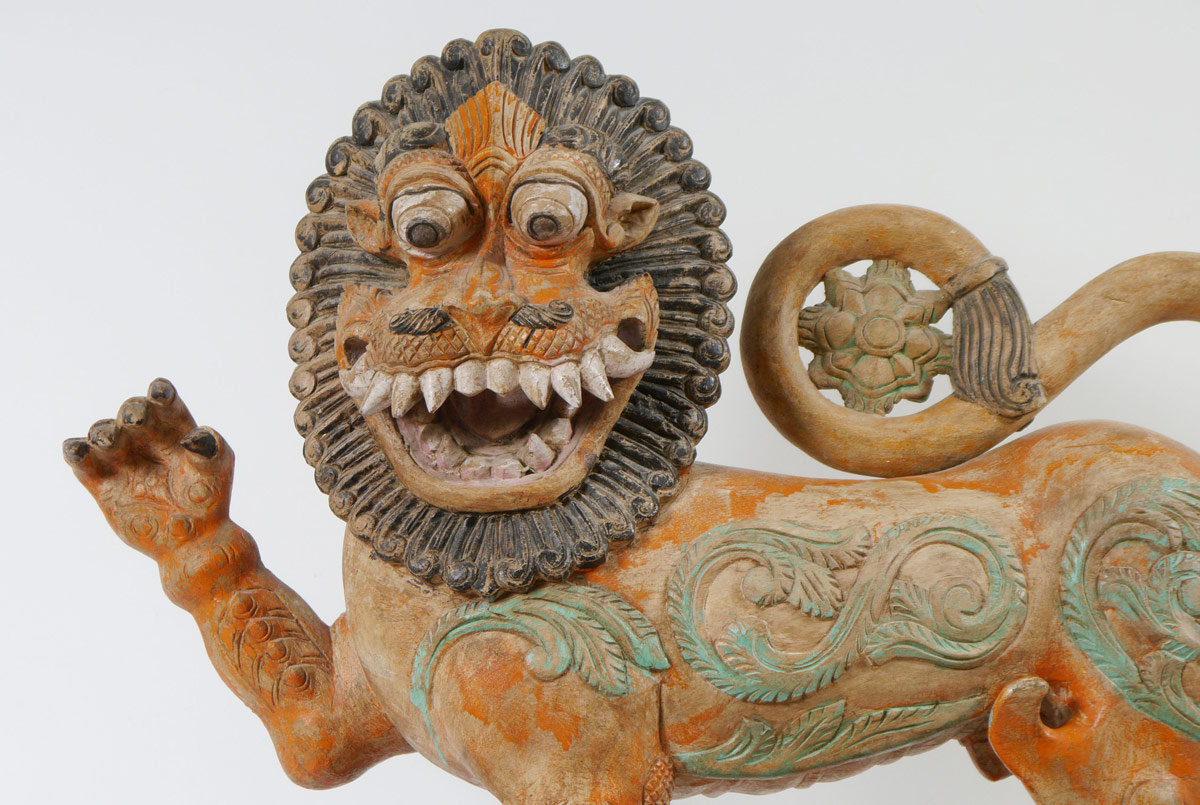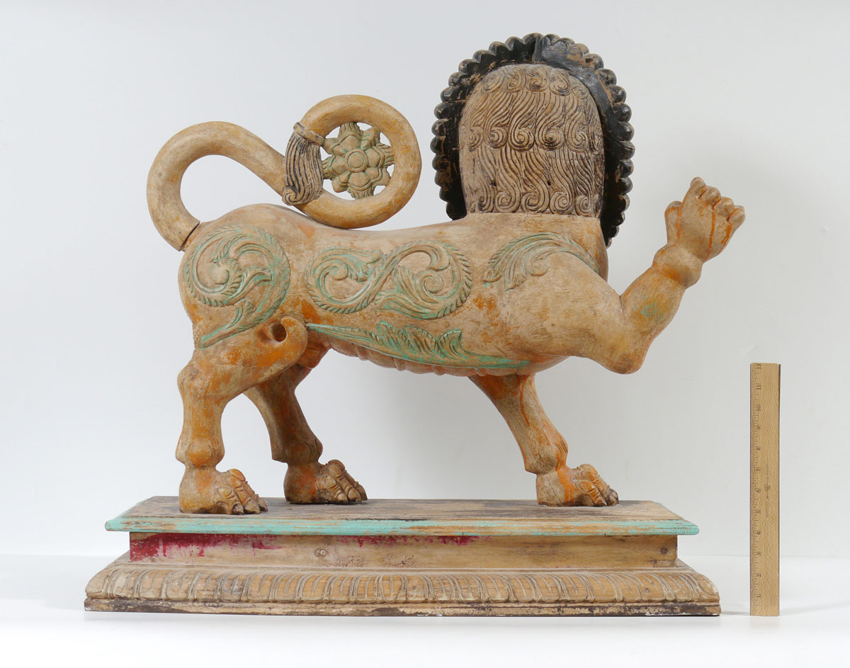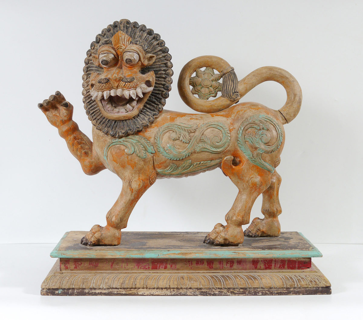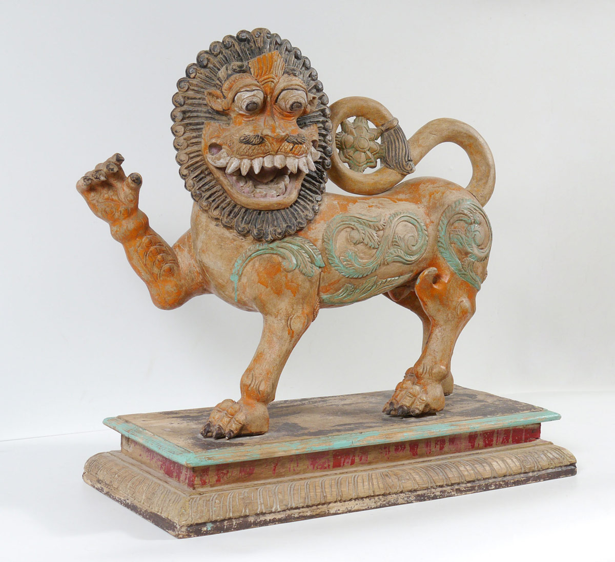 POLYCHROME CARVED TIBETAN TEMPLE LION: Carved wood lion with exaggerated mask with wood base. Polychrome paint decorated, age unknown. Overall 29'' h. x 30'' x 13 3/4''.