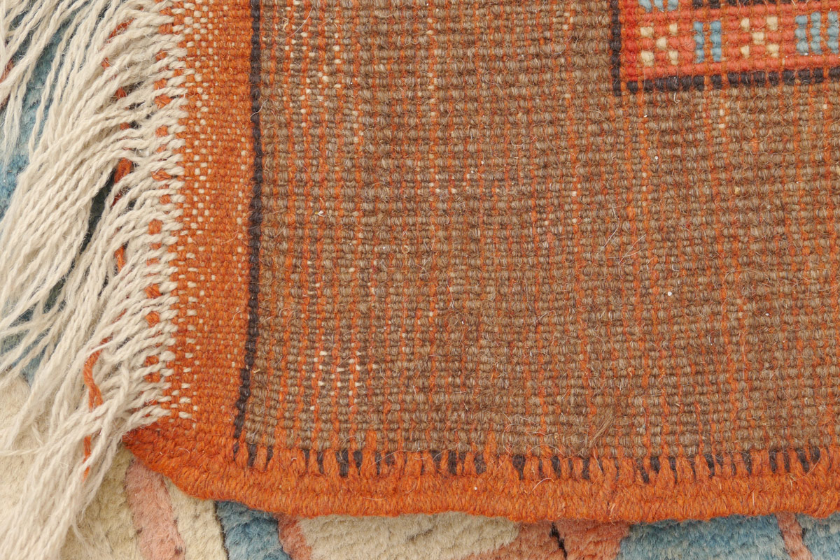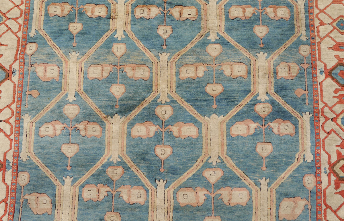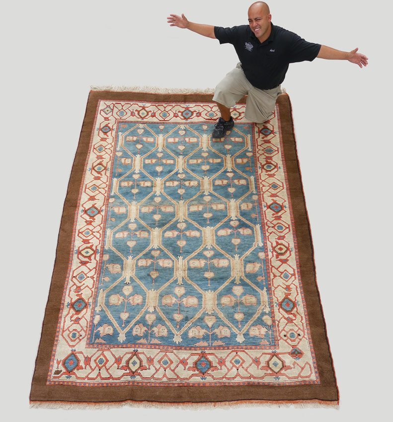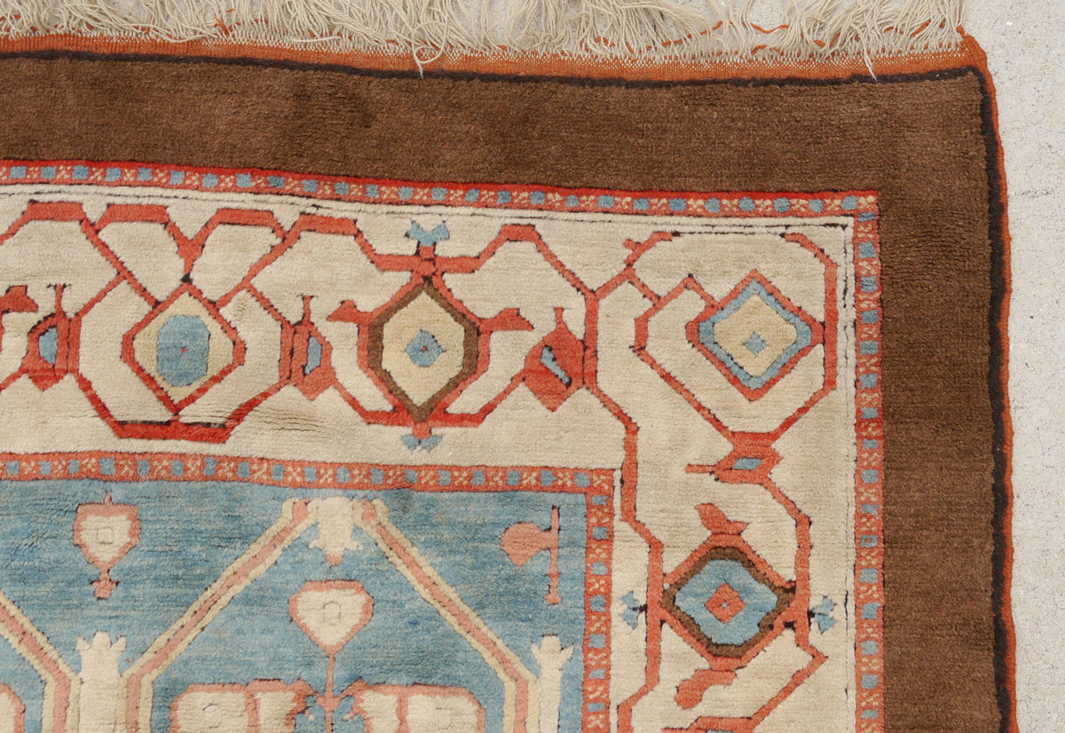 APPROX. 20-35 YR. OLD TURKISH HAND KNOTTED WOOL RUG, 6' 9'' x 10': This rug has an unusual color palette for most hand made rugs but it is one that would be good for modern decorating. The field is an aqua blue with an overall pattern of lattice like panels done in pale peach and ivory. The rug has two main borders, the inner one has an ivory field with red, brown and aqua blue motifs and the outer border is a solid brown. Condition is good.