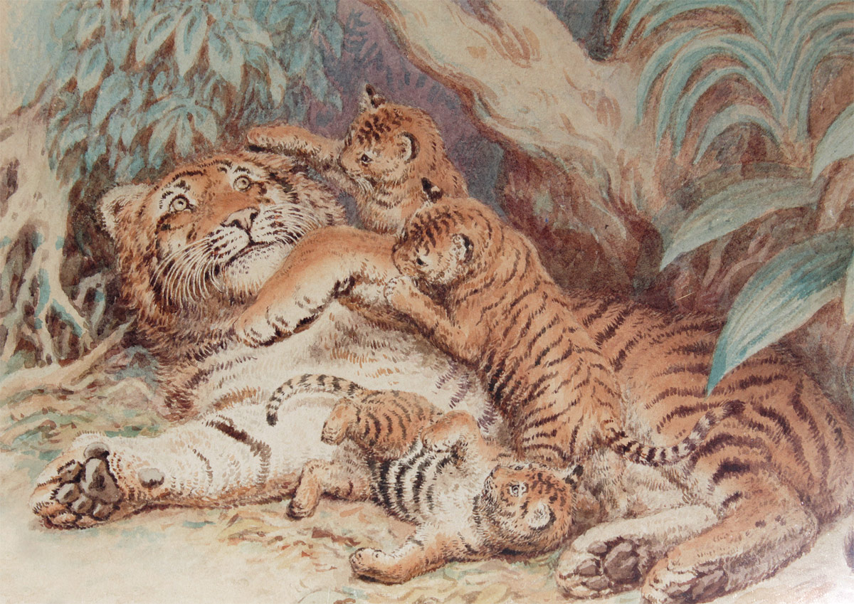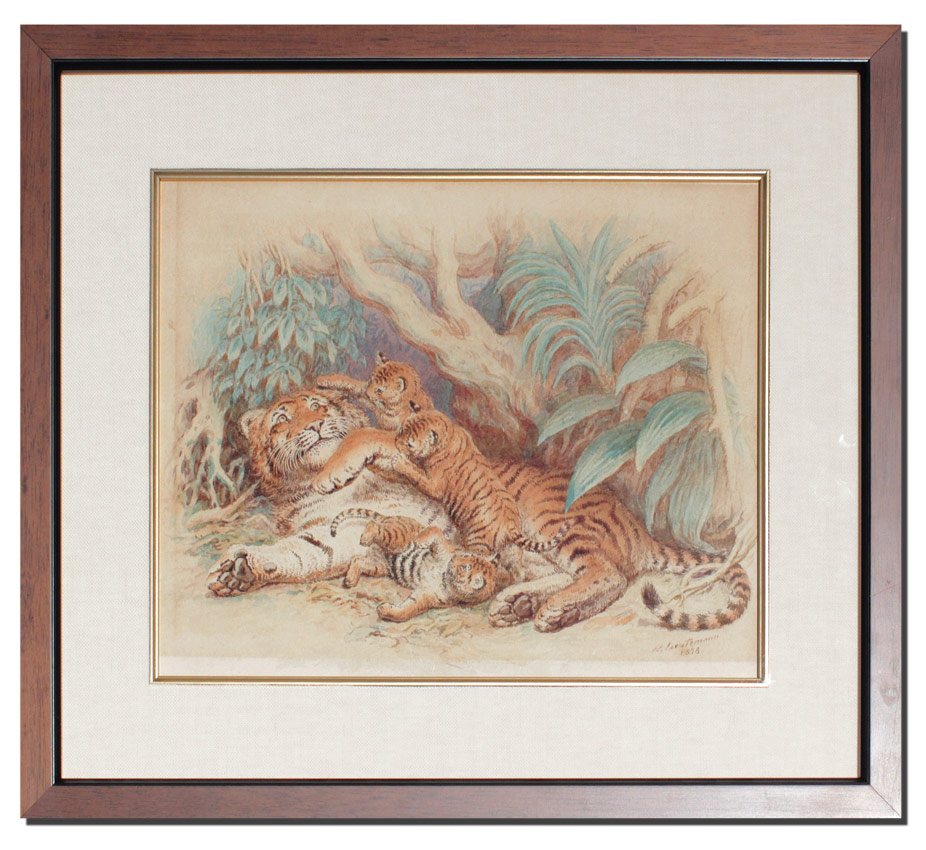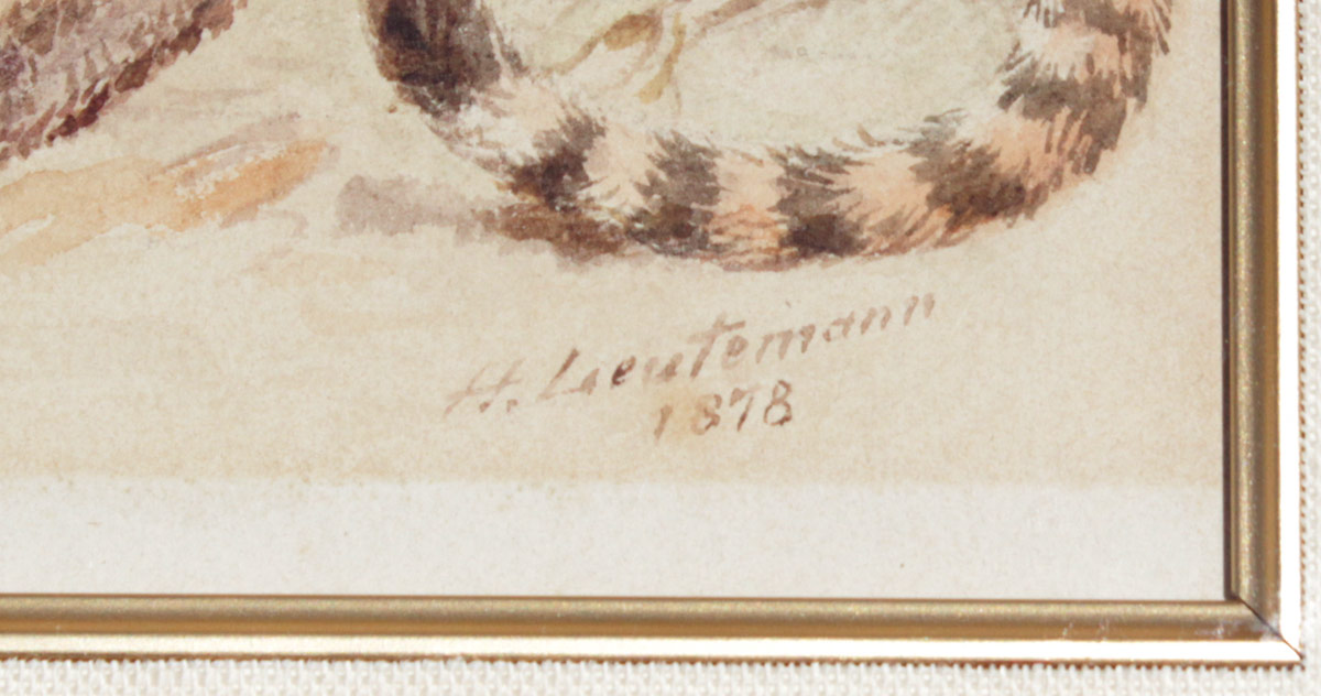 LEUTEMANN, Gottlob, (German, 1824-1905): Tiger with Playful Clubs, Watercolor, Sight size 11 1/4'' x 12 1/4'', signed lower right, dated 1878, contemporary frame 18 1/4'' x 21''.