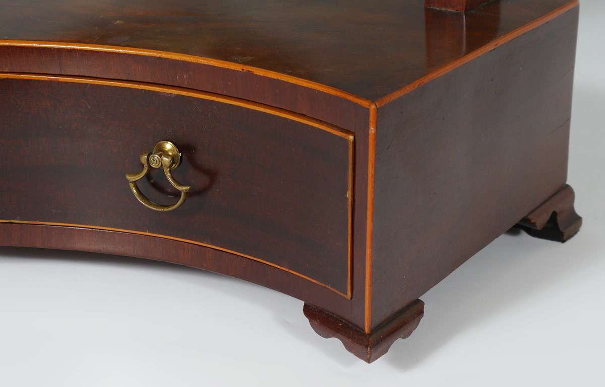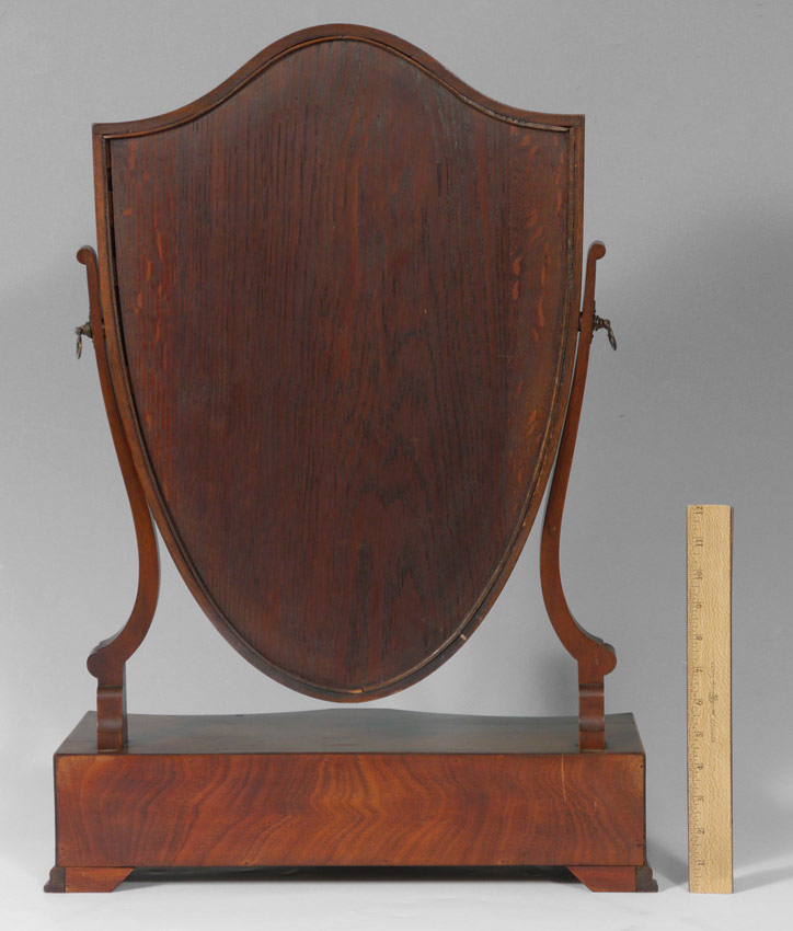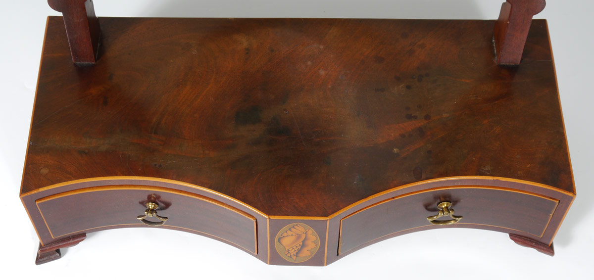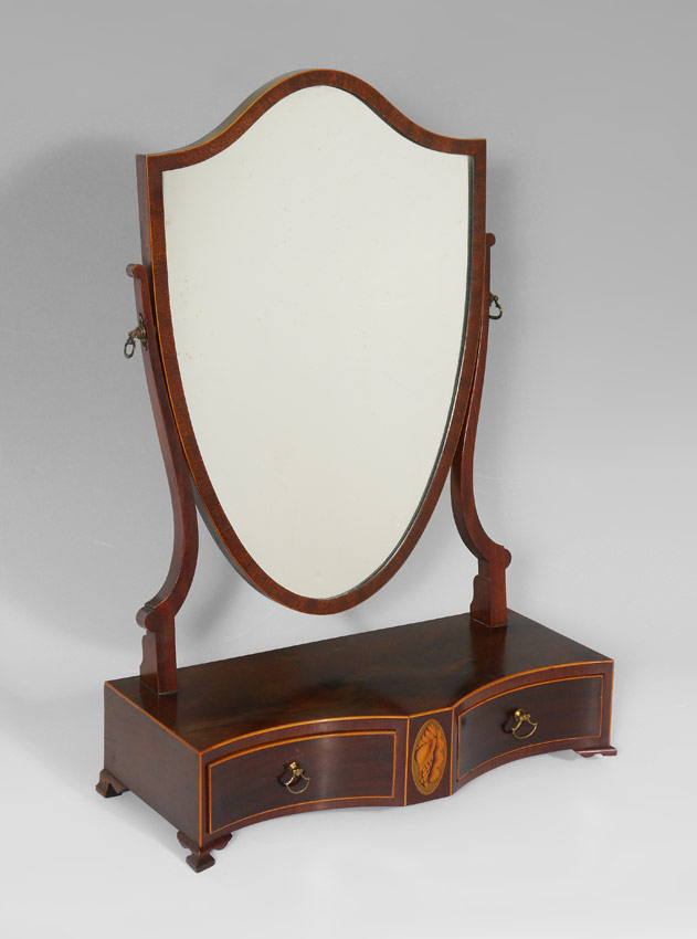 MAHOGANY INLAID SHAVING MIRROR: Shield shaped mirror over shaped 2 drawer base with central shell inlay medallion. String inlay top and drawer edges. Overall 26 3/4'' x 19 1/4'' x 8 1/2''.