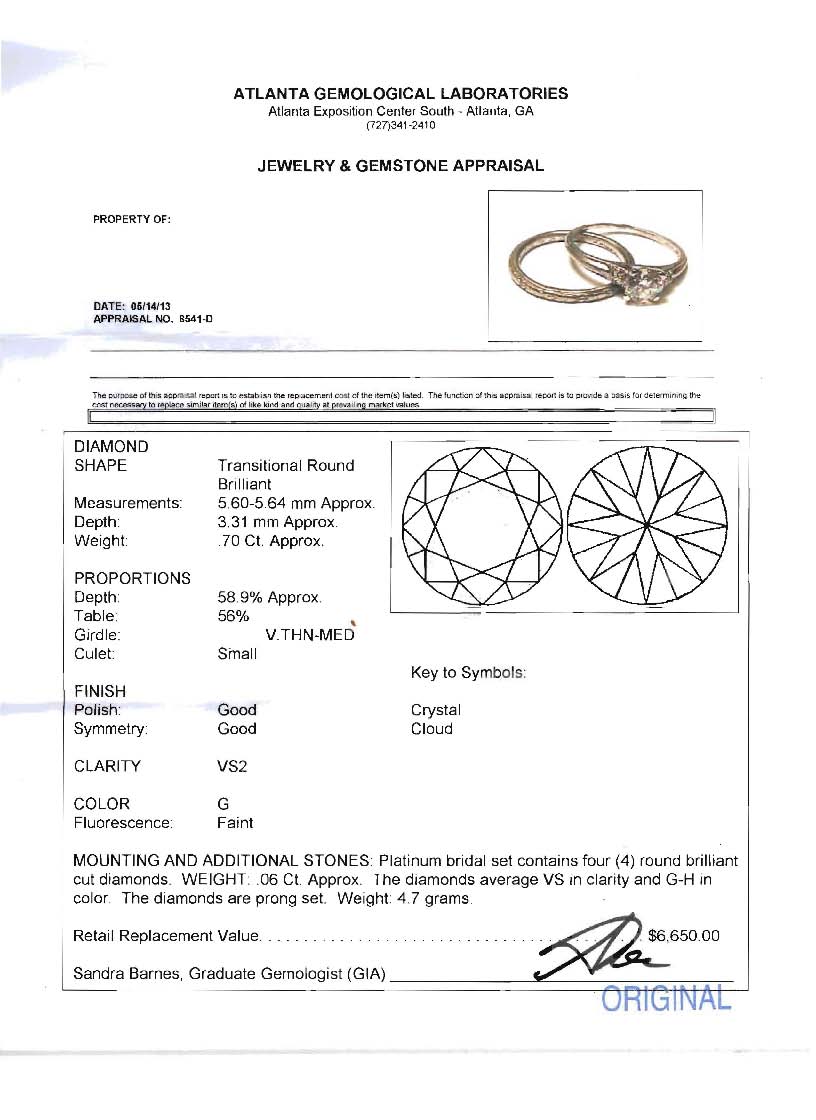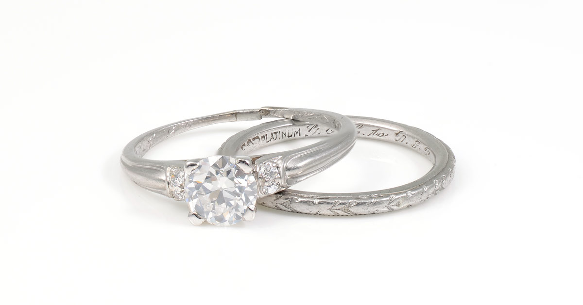 PLATINUM ART DECO ENGAGEMENT BRIDAL SET: Platinum engagement ring and hand chased band. The single round transitional diamond is approx .70 Ct., VS2 clarity and G color. Besides the solitaire are 4 round brilliant diamonds of VS clarity and G-H color. Size 5-5.5. Weight 4.7 grams. Sold with current Atlanta Gemological GIA graduate's appraisal for $6,650.
