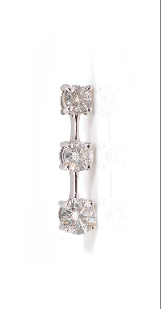 DIAMOND LINEAR PAST PRESENT FUTURE PENDANT: 14K white gold pendant contains three round brilliant cut diamonds totaling approx. 1.00 Ct. The diamonds average SI2-I1 in clarity and H-I in color. The diamonds are prong set. Weight: 1.4 grams.