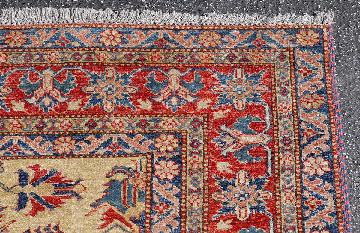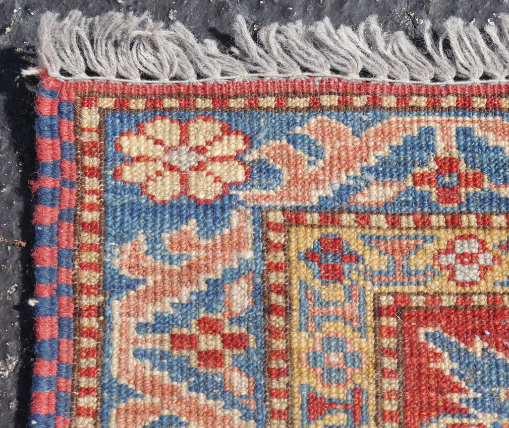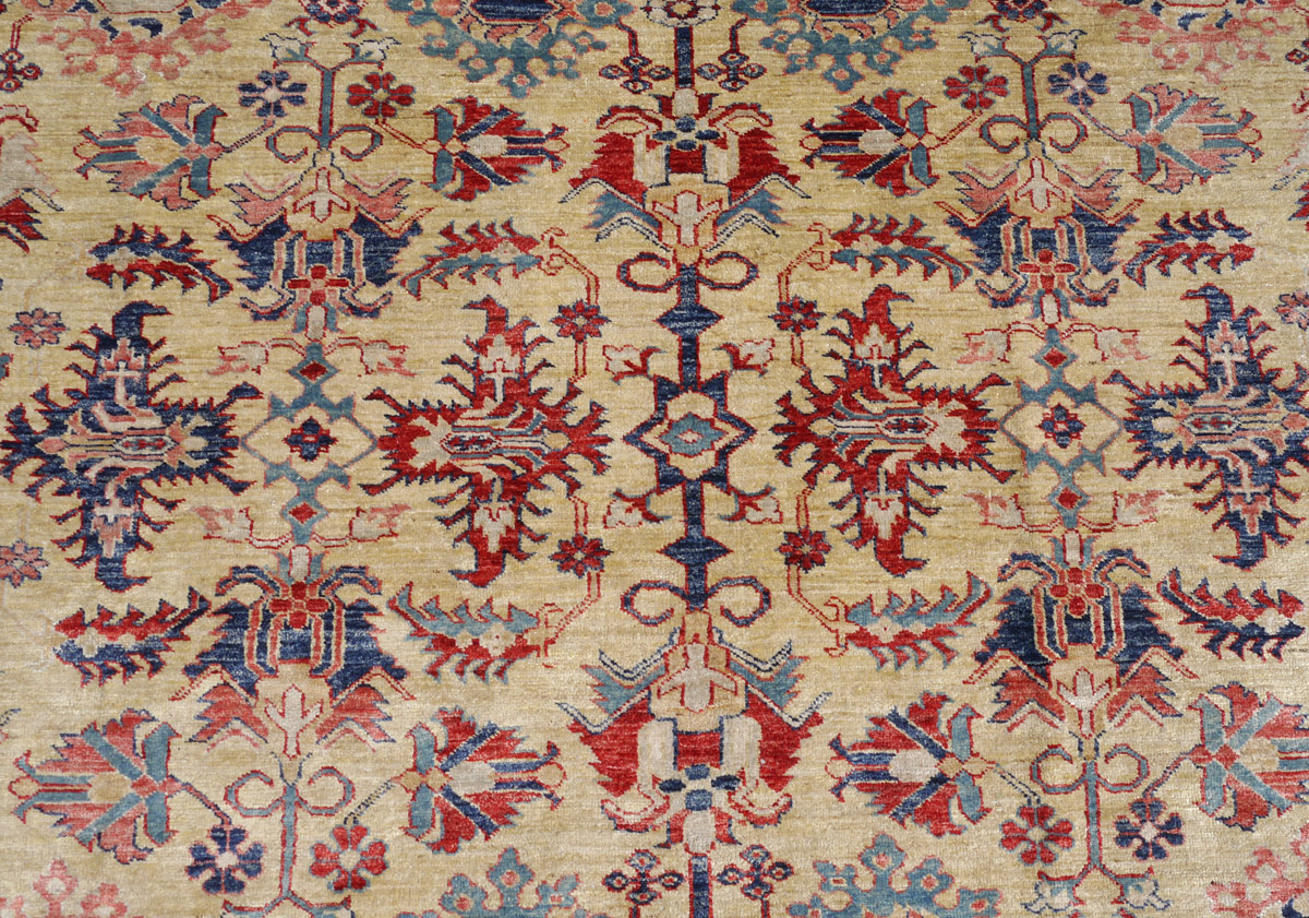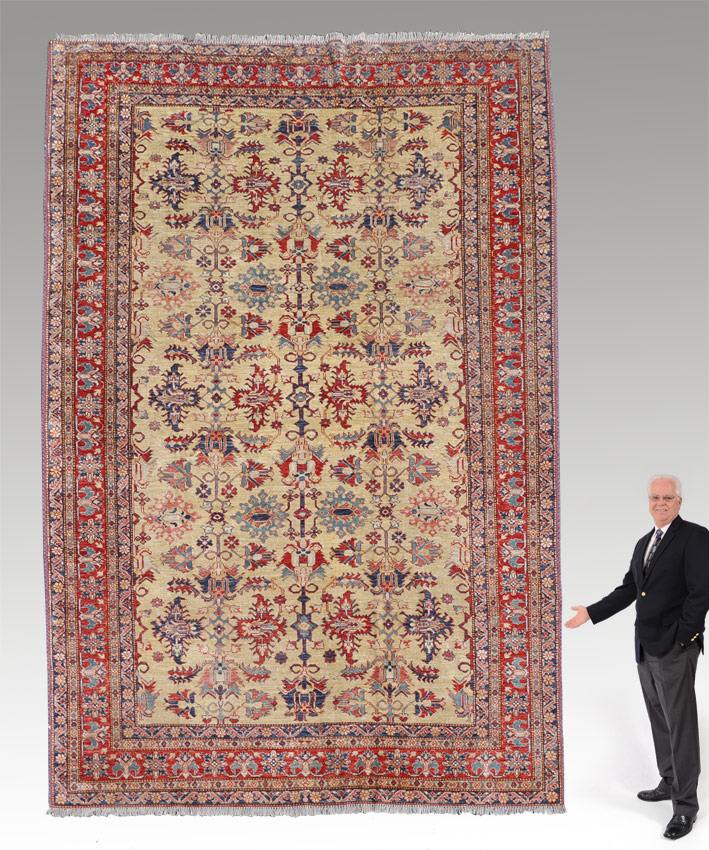 APPROX. 20-35 YR. OLD TURKISH HAND KNOTTED WOOL RUG, 8' 1'' x 11' 9'': This attractive room size rug has an overall design of palmettes and flowers in staggered rows joined by vines. These motifs are geometric for the most part and are done in colors of brick red, medium and dark blue, yellow, and ivory on a pale yellow field. The blue and red ground borders frame the field in the same way a good picture is framed with an equally good frame. Condition is good.