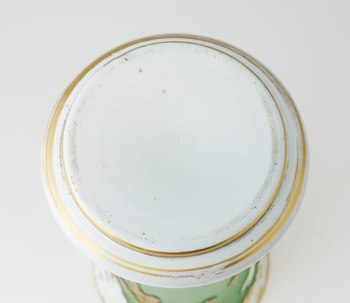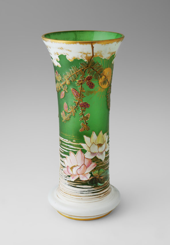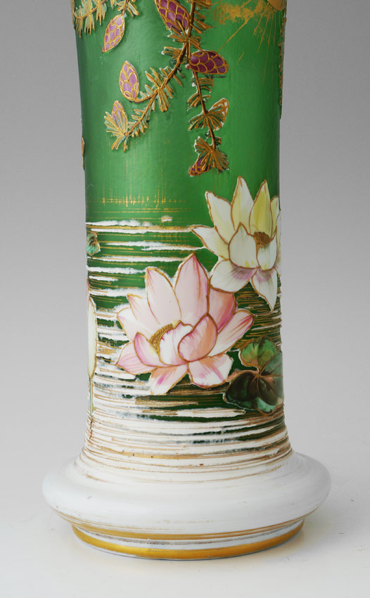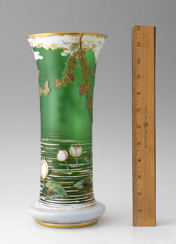 MONT JOYE FRENCH ART GLASS VASE: Cameo cut and enameled glass depicting a water lily filled pond under pine boughs, with the sun shining through. Measures 11.5'' tall.