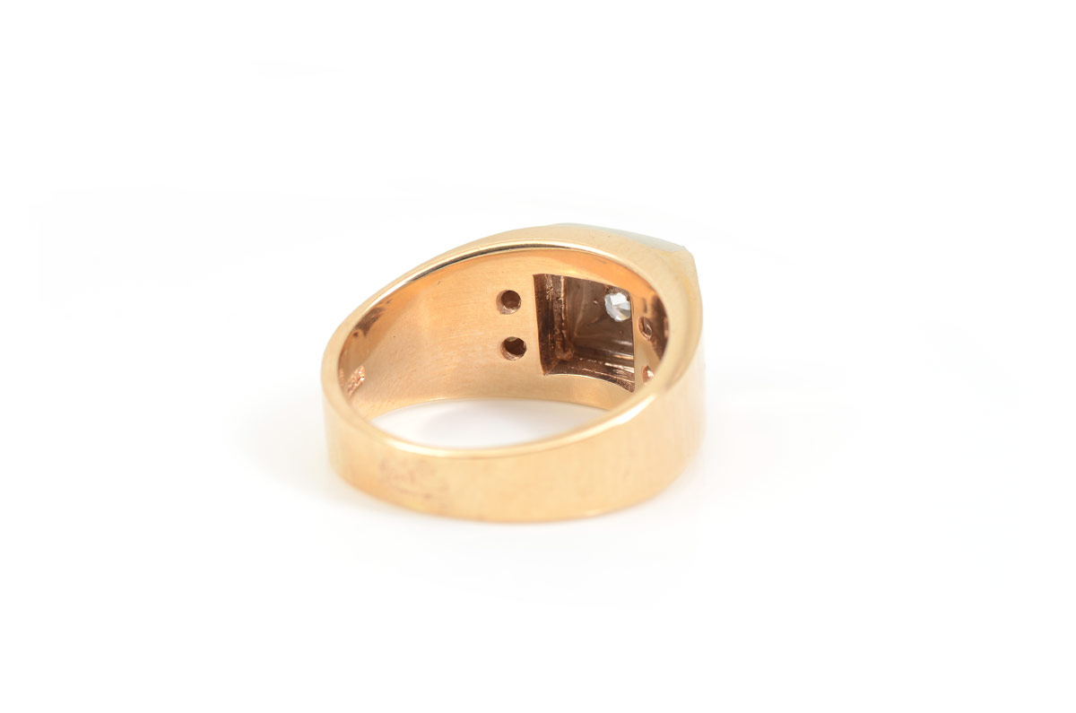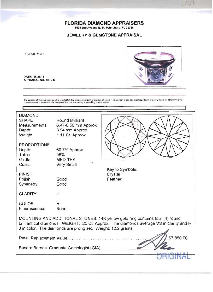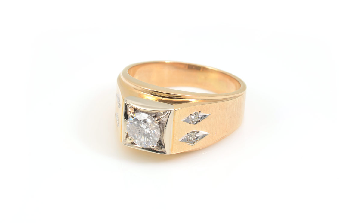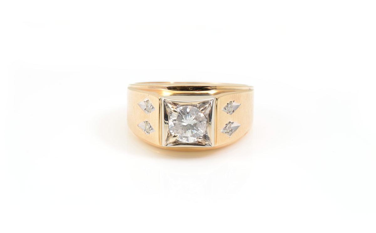 GENTS 1.11 CT DIAMOND RING: 14K yellow gold ring centers an approx. 1.11 Ct round brilliant cut diamond of I1 clarity and H color. The 4 accent diamonds total approx. .20 Ct., average VS clarity and I-J color. Size 11. weight 12.2 grams. Sold with current Florida Diamond Appraisers GIA graduates appraisal for $7,850.
