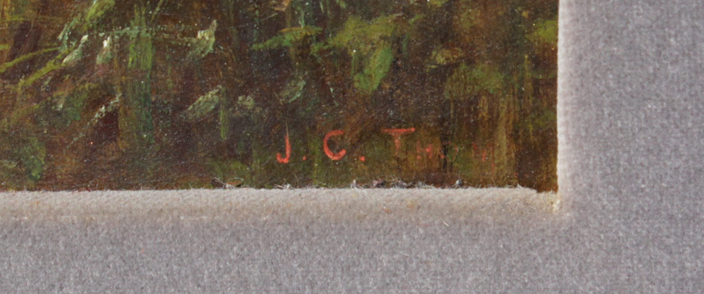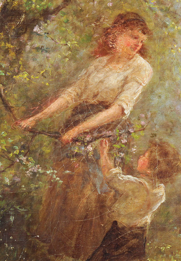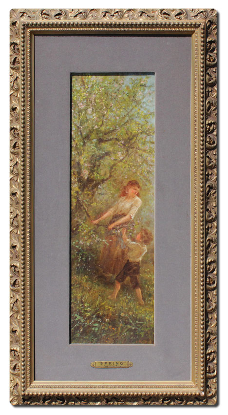THOM, James Crawford, (American, 1835-1898): ''Spring'', Depicts Mother & Child in a Spring Landscape, Oil/Canvas, 26'' x 9'', encased in period gilded gesso frame with wear, 37'' x 19 1/2'', monogrammed lower right.
