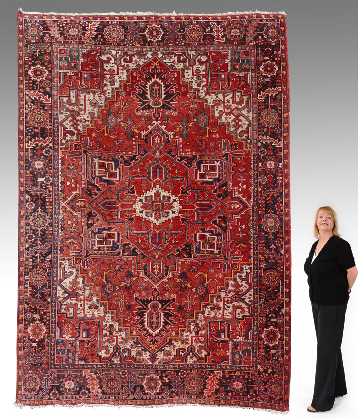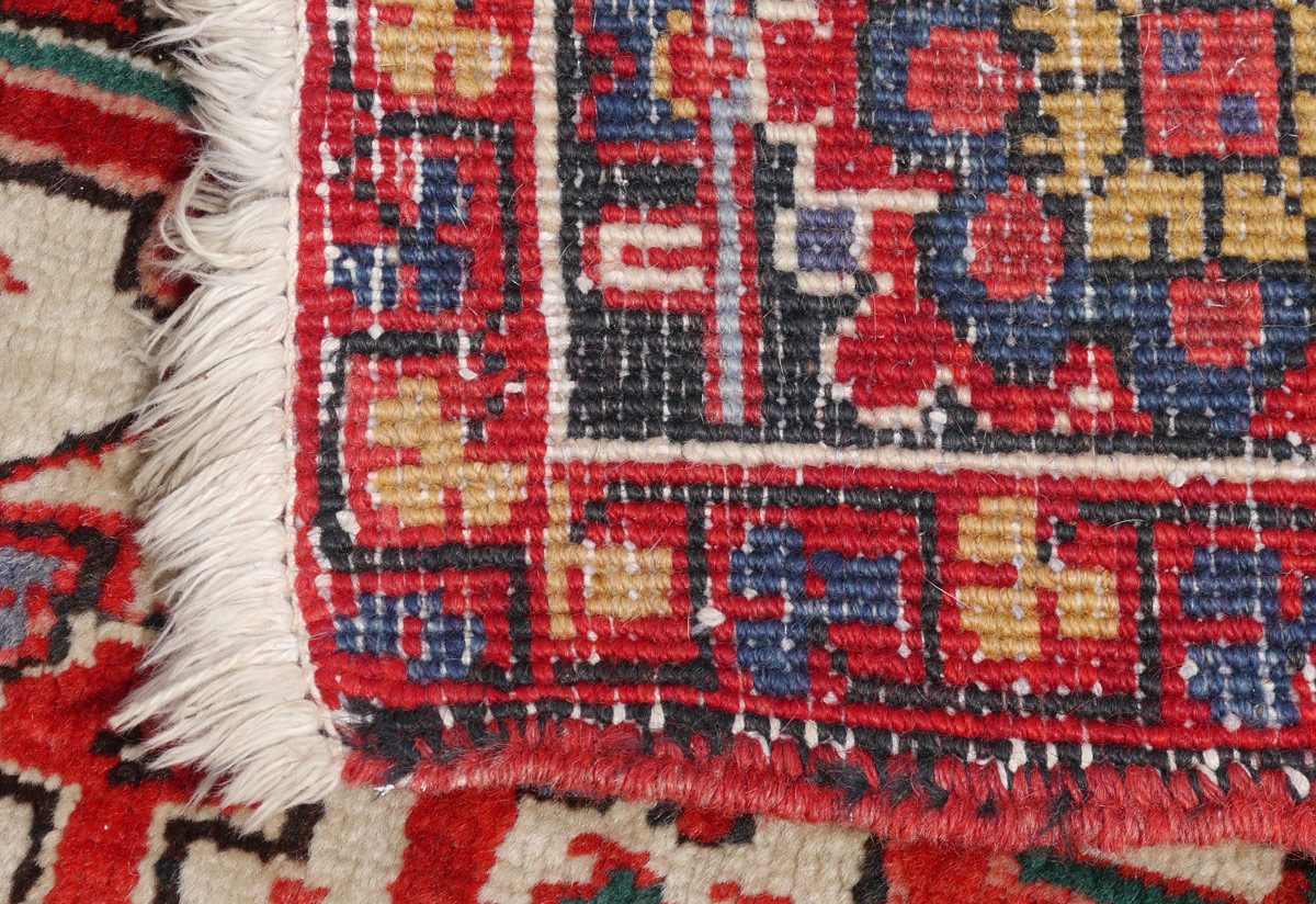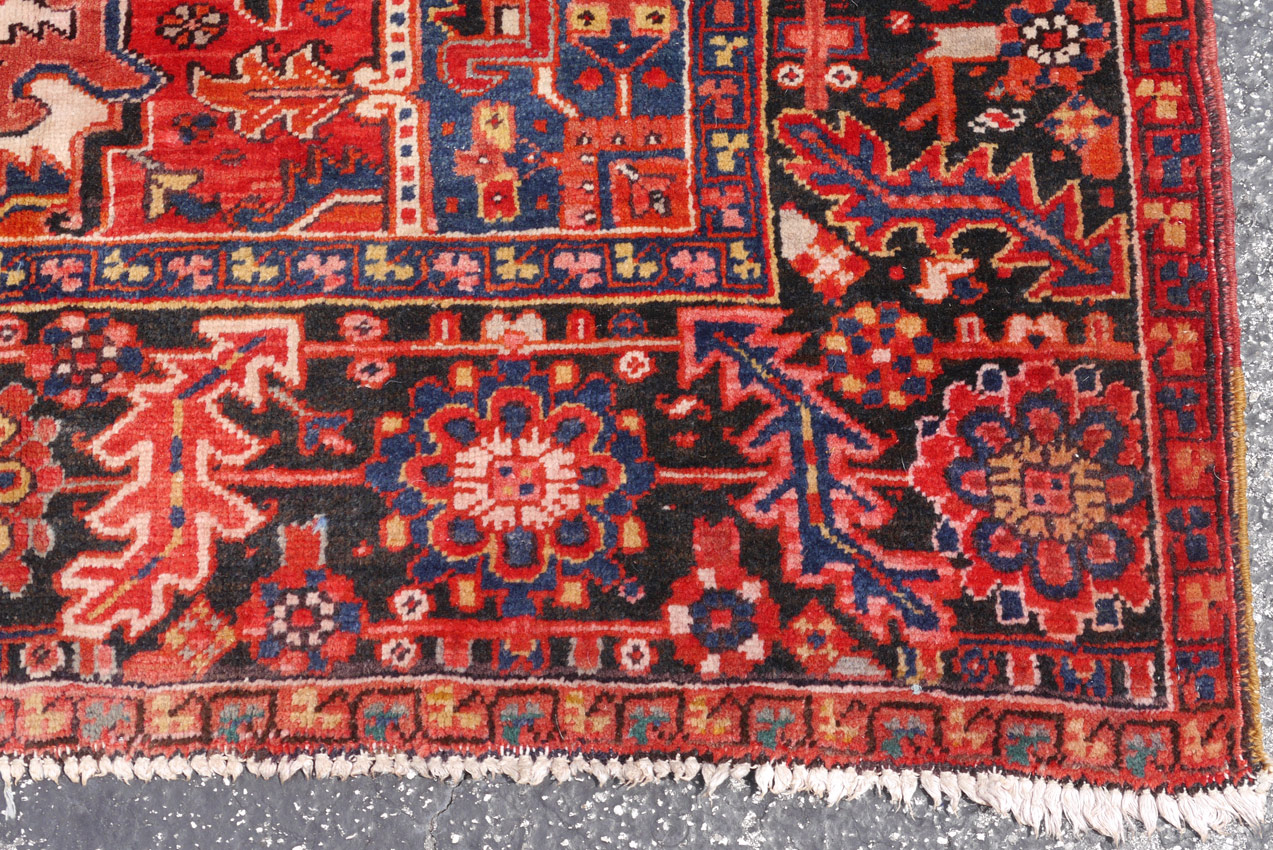 APPROX. 50-75 YEAR OLD PERSIAN HERIZ HAND KNOTTED WOOL RUG, 8' x 11' 4'': This good looking rug has traditional colors and geometric designs found in rugs from the Heriz region of Iran. The central medallion has spandrels hanging from the top and bottom that are outlined in black. The brick red field and the medallion are covered with geometric shaped motifs in color of pale yellow, rose, blue, and are accented by white and black. The corners of the field are composed of quarters of the medallion separated by white from the rest of the field. The main border of the field completes the rug with its use of the same colors and motifs found in the rug on a black ground.