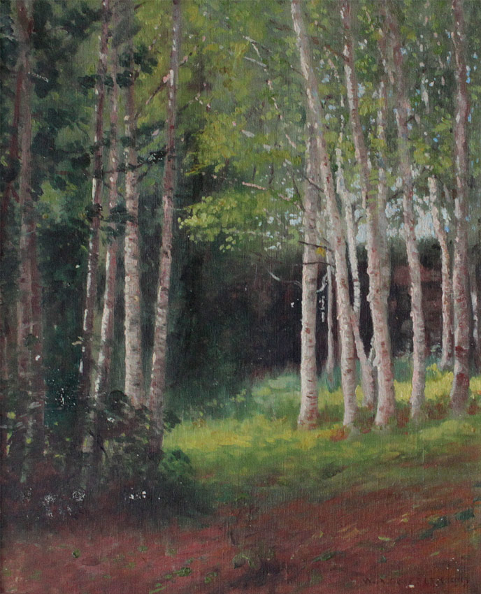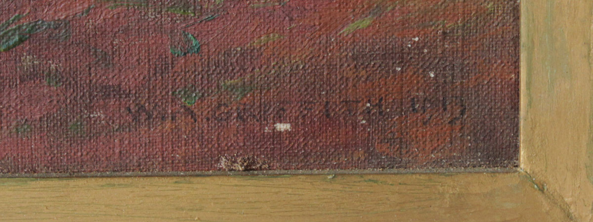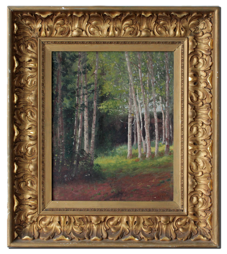 GRIFFITH, William Alexander, (American, 1866-1940): ''Clearing in the Forest'', Oil/Canvas, 17'' x 14'', signed lower right, dated 1913, encased in a heavy gilded and carved foliate motif frame with wear, 26'' x 23 1/2''.