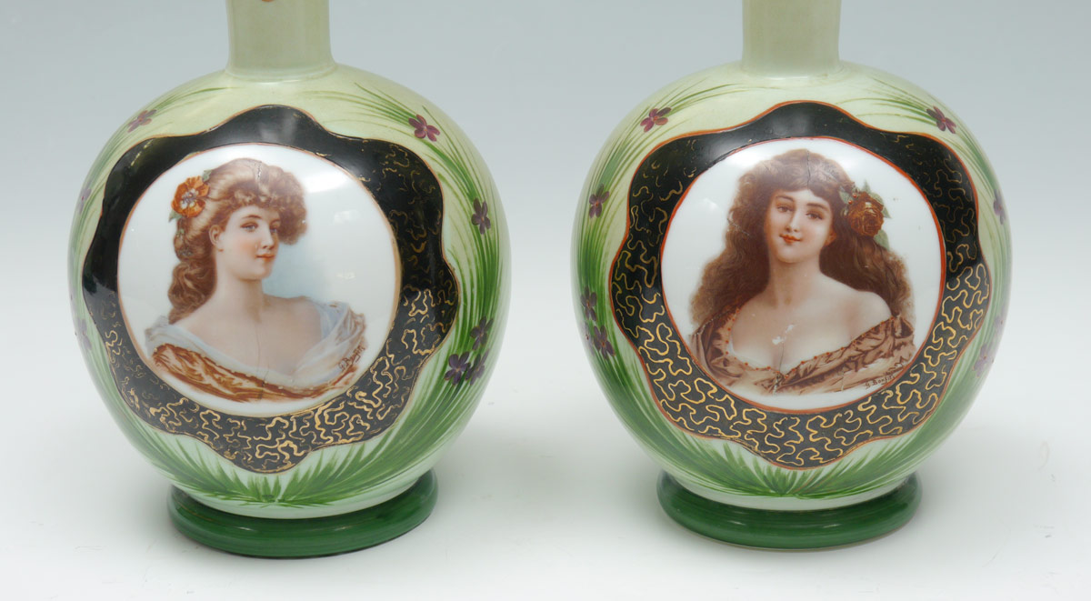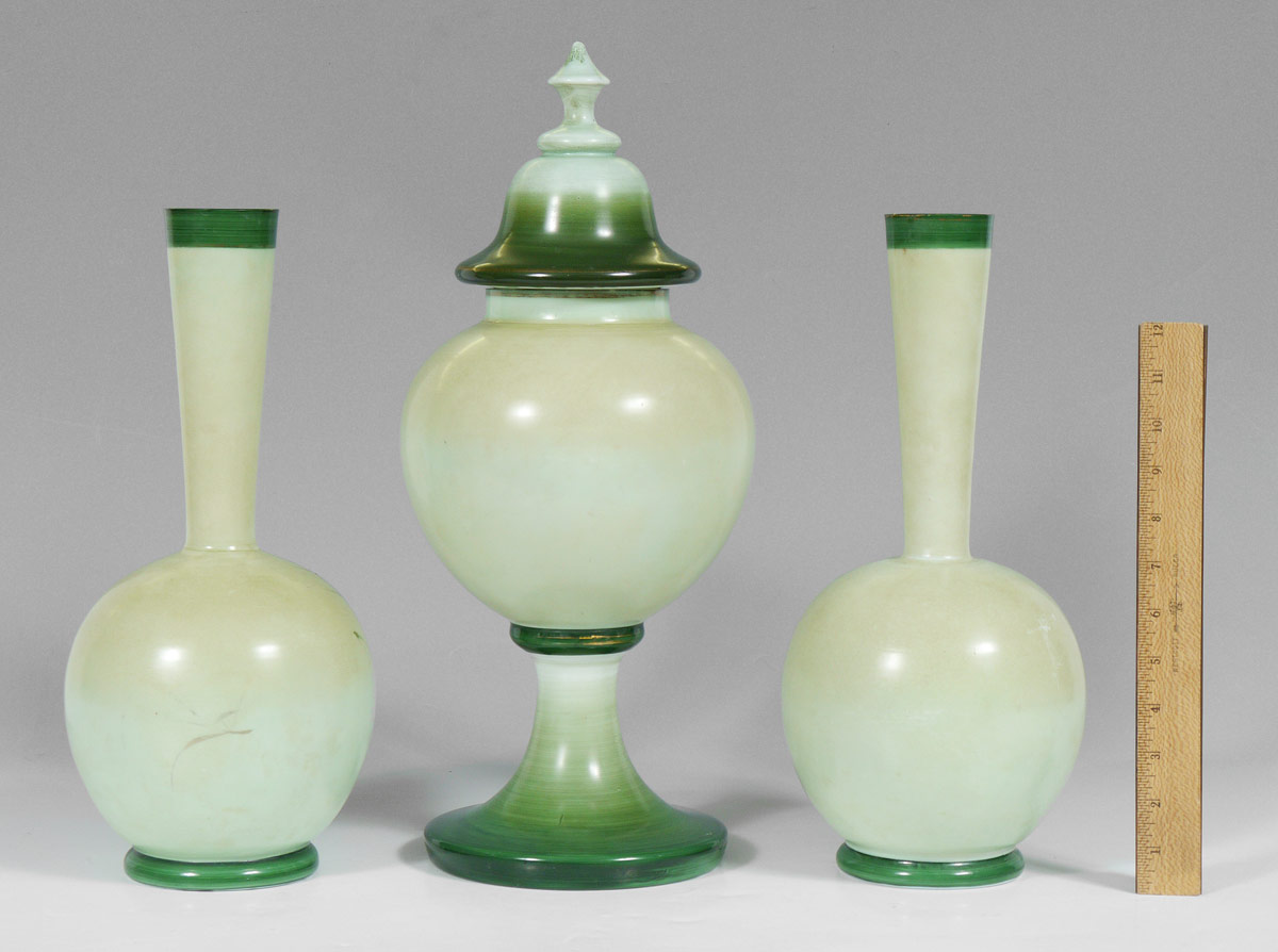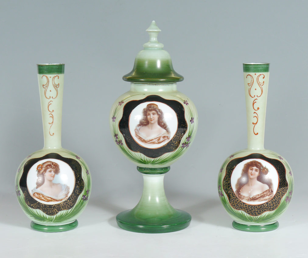 3 PIECE SIGNED BRISTOL GLASS PORTRAIT GARNITURE SET: To include a covered urn and 2 vases. Green ground over white glass with floral and gilt decoration. Transfer portraits on each with vase portraits signed G. Bonfits. Urn 18'' h. x 7 3/4'', vases 14 1/2'' x 6 1/2''.