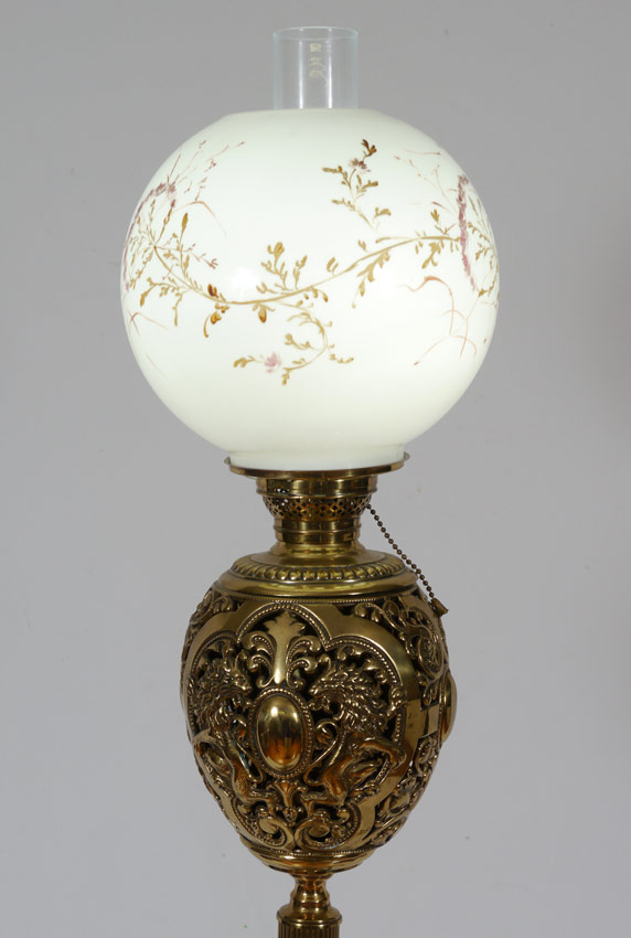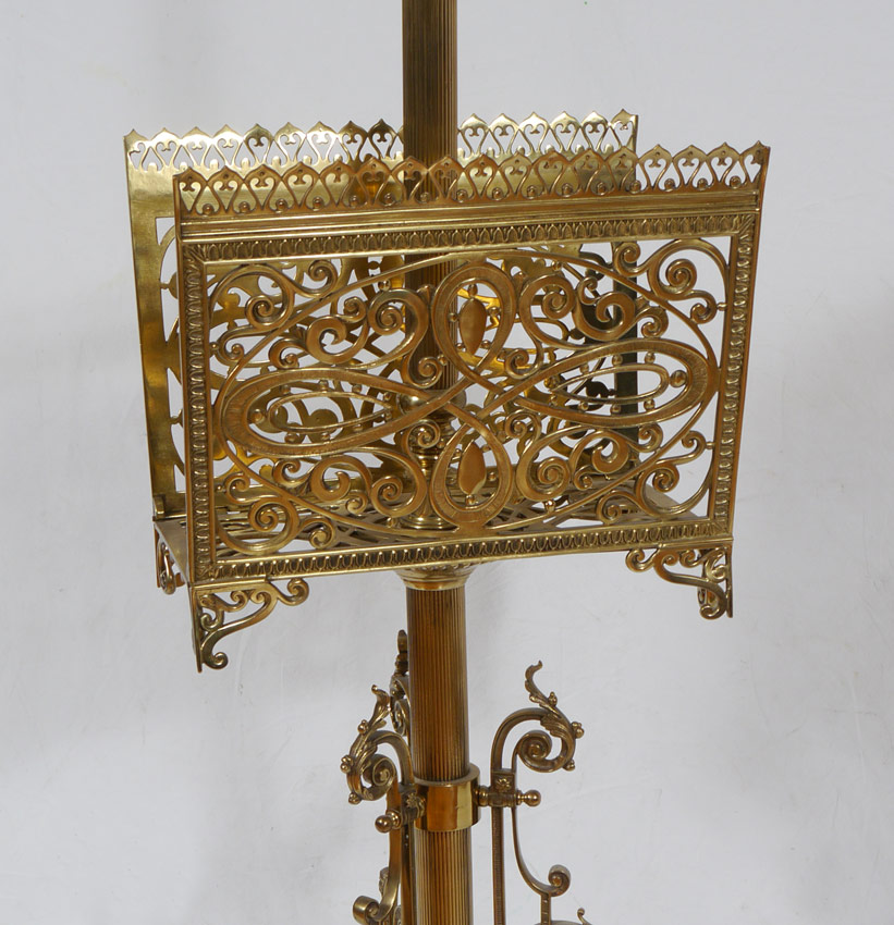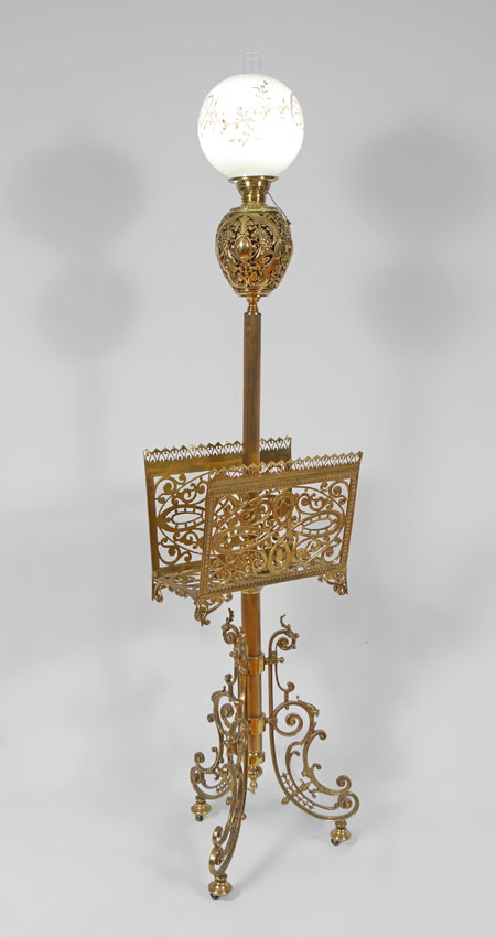 VICTORIAN ERA BRASS PIANO FLOOR LAMP: Top with open work featuring lions and masquerons, fluted shaft, sheet music holder rack in center. 3 cast leg and feet on castors. Sold with glass globe shade, chimney. Single socket fixture. Overall measures 72'' h. x 15 1/2'' x 18''.