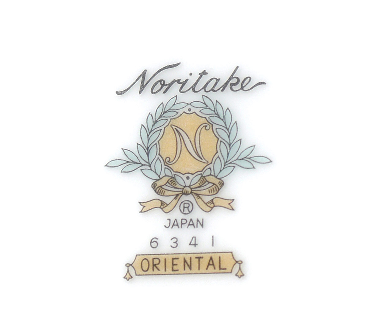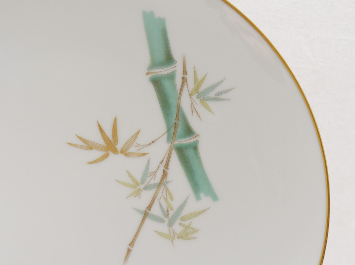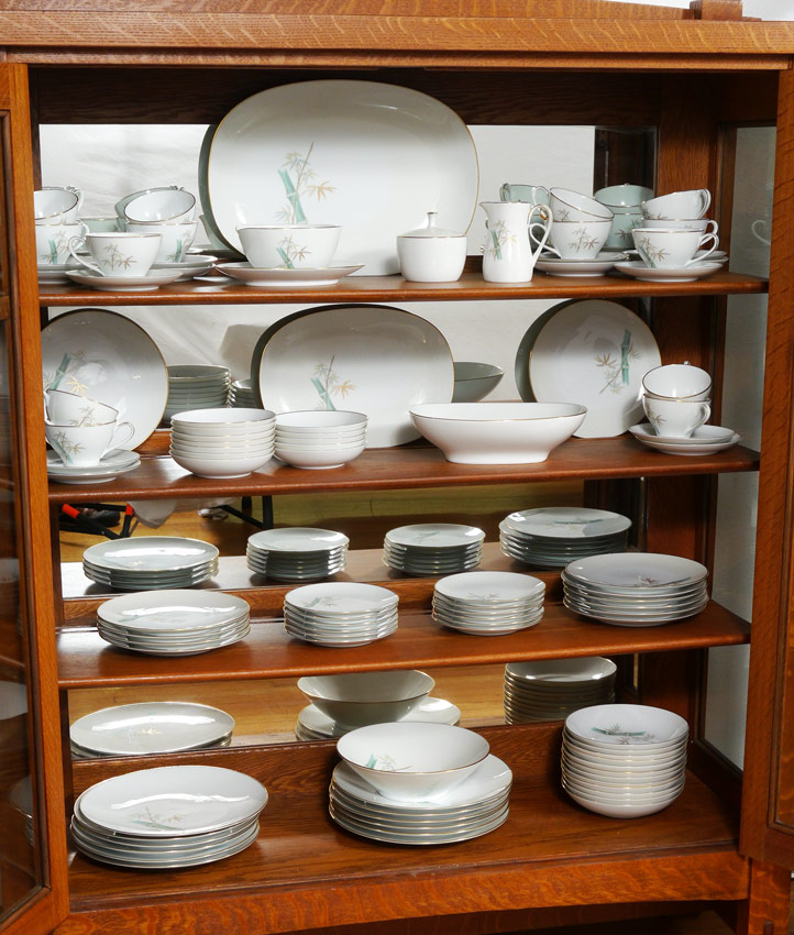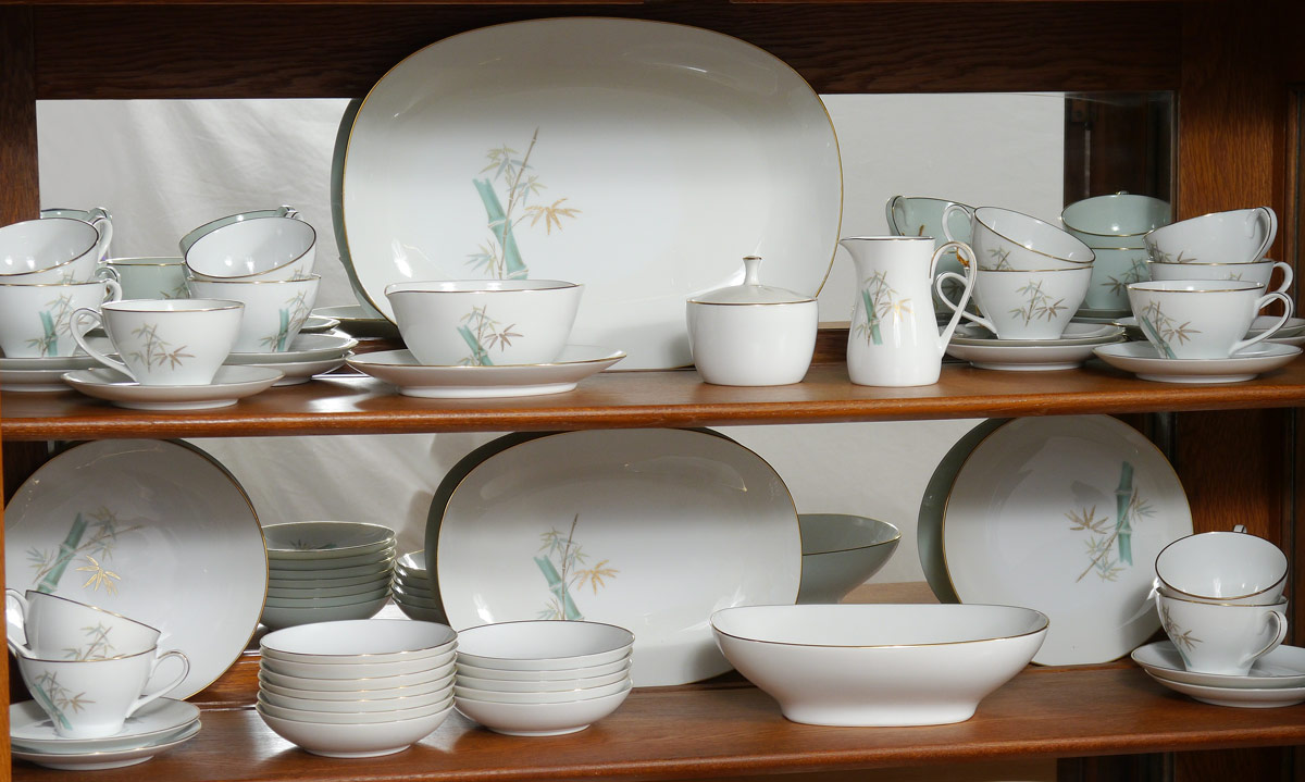 NORITAKE ORIENTAL BAMBOO PATTERN CHINA SERVICE FOR 12: Complete service for 12, approx. 95 pieces in the ''Oriental'' pattern by Noritake to include 12 dinner plates (10 1/2''), 12 salad plates, 12 bread plates, 12 soup bowls, 12 dessert bowls, 14 tea cups and 14 saucers, platter (15 1/4'' x 11''), open vegetable and under plate, gravy boat, open creamer, covered sugar, serving bowl (9'' dia.).