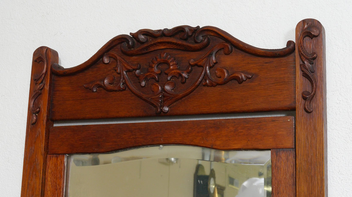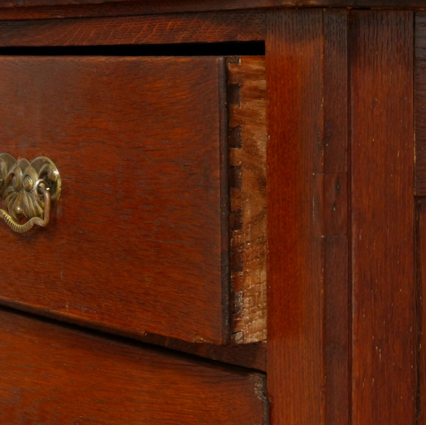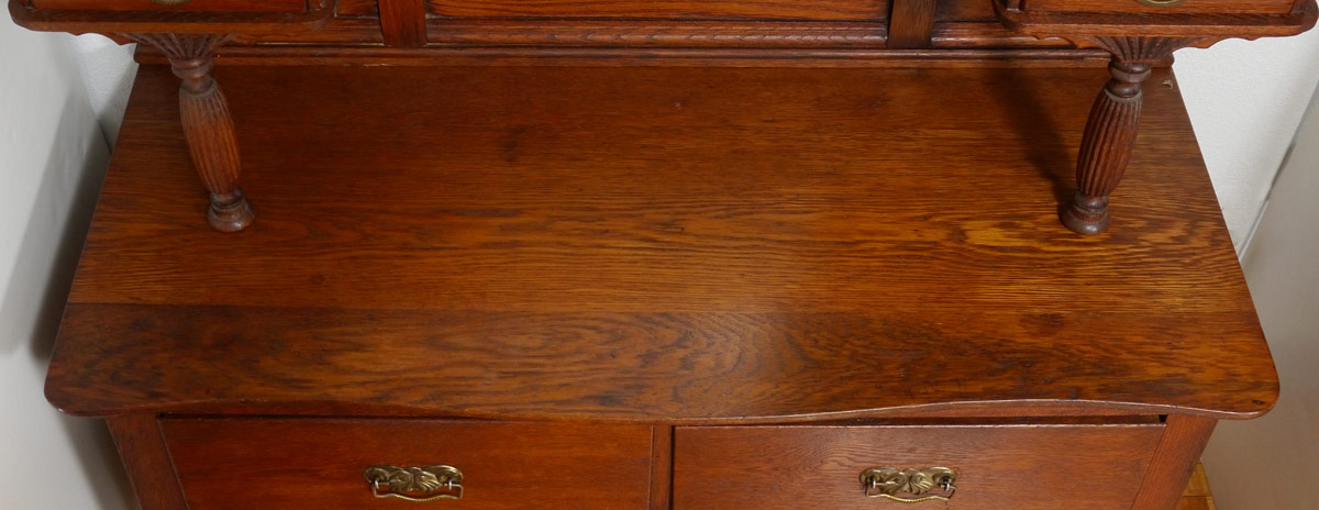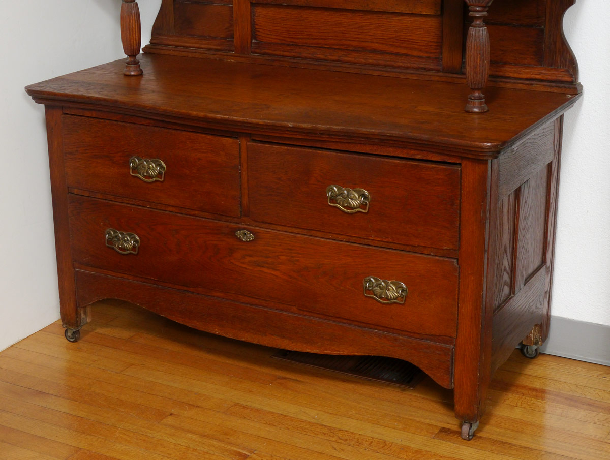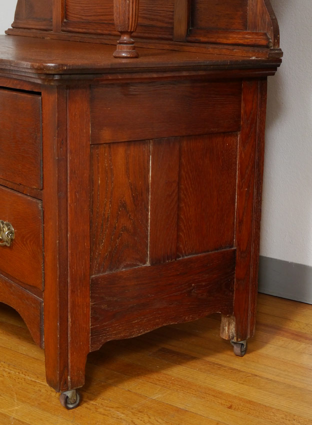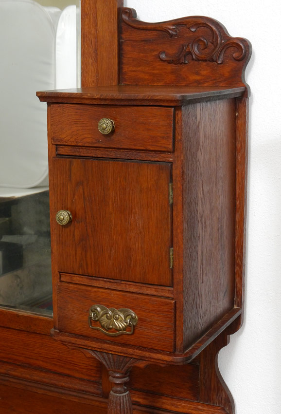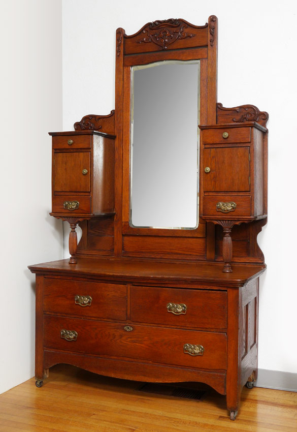 AMERICAN OAK DOUBLE BONNET TOP DRESSER: Early 1900's oak dresser with central beveled swing mirror between two bonnet boxes with drawers. The lower chest has two drawers over full length drawer. Measures approx. 83'' tall x 42'' x 22''.