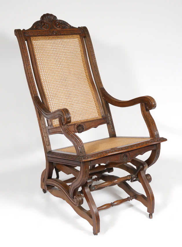 HUNZINGER QUALITY CARVED PLATFORM ROCKER: Carved crest and frame, caned back and seats, on castors. Approx. 47'' h. x 23 1/2'' x 33''.