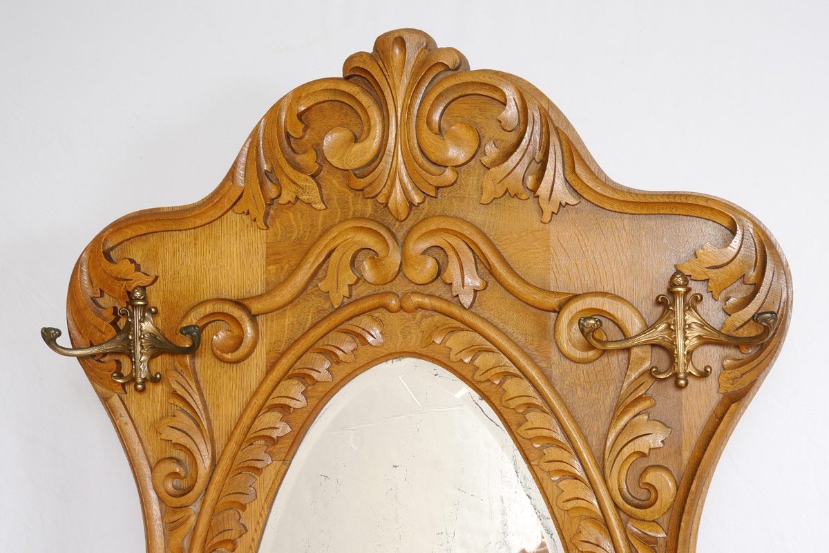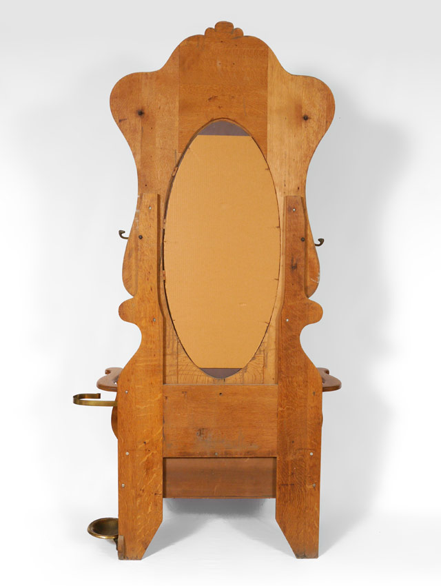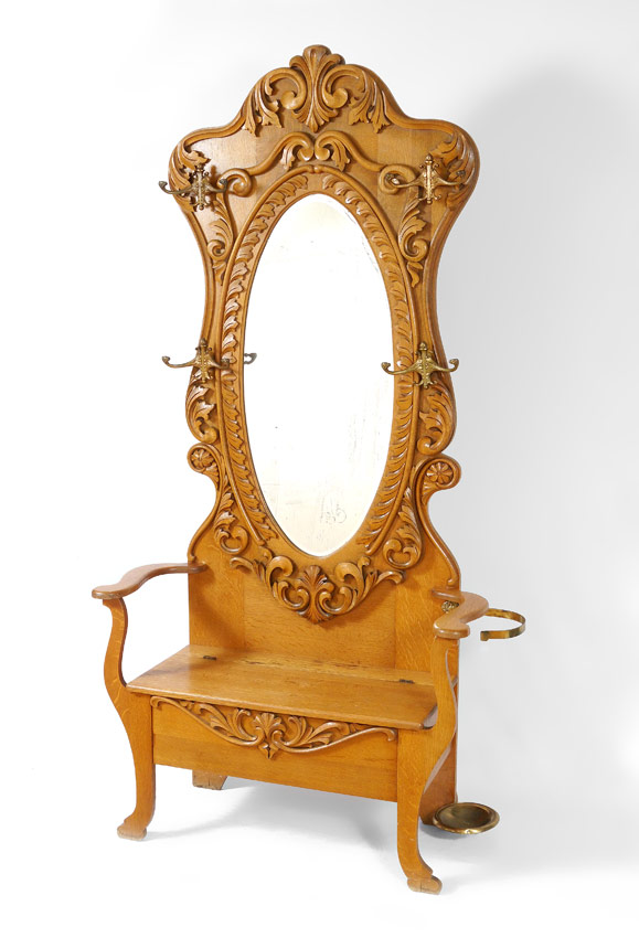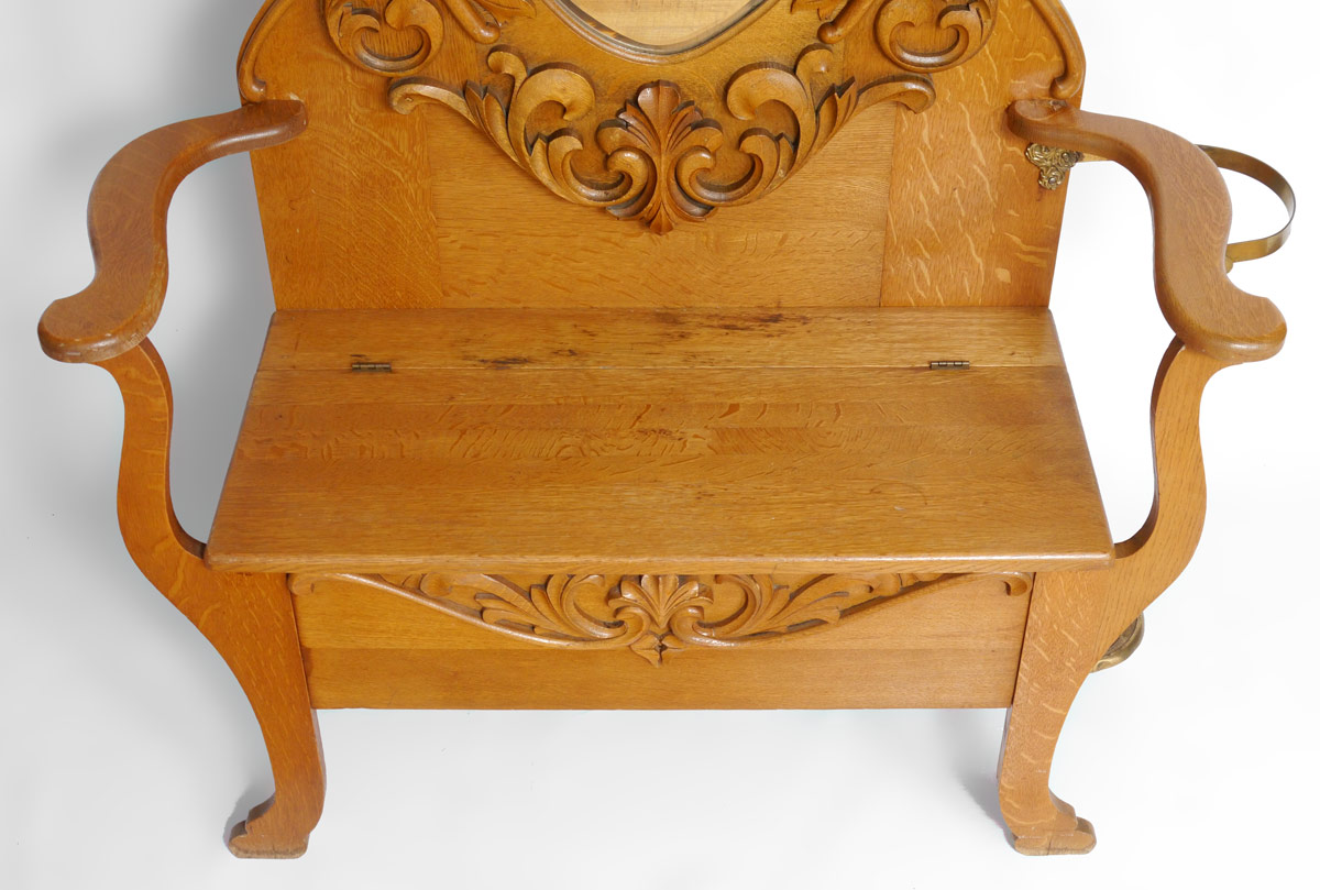 AMERICAN QUARTER SAWN OAK HALL TREE: Central oval mirror framed in applied carvings and four double hooks all over a lift top bench with arms and umbrella holder with tray. Measures approx. 84'' tall x 40'' x 16''.