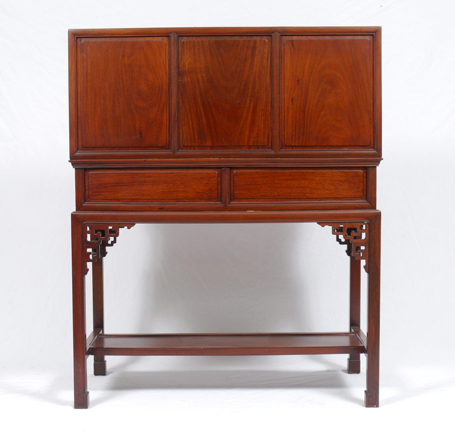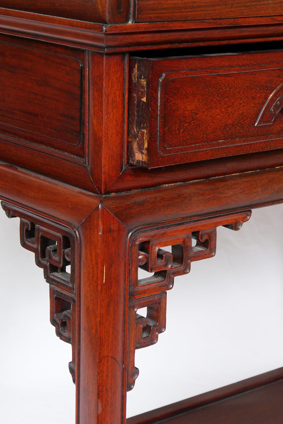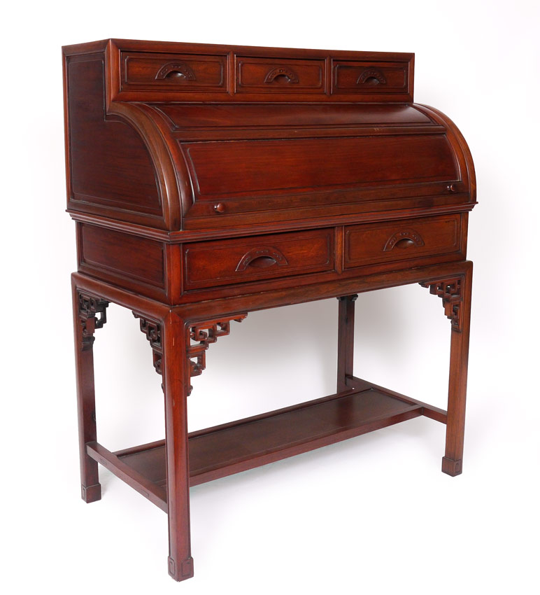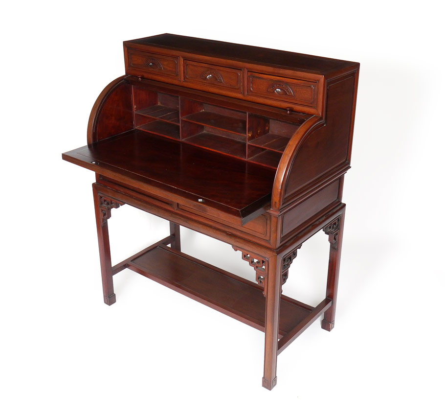 CHINESE CHIPPENDALE STYLE ROSEWOOD CYLINDER ROLL TOP DESK: 3 drawers over cylinder roll front, opens to slide out writing surface and pigeon holes. 2 lower drawers, applied carved decoration inside corners, open lower shelf. 44'' h. x 35 3/4'' x 18 3/4''