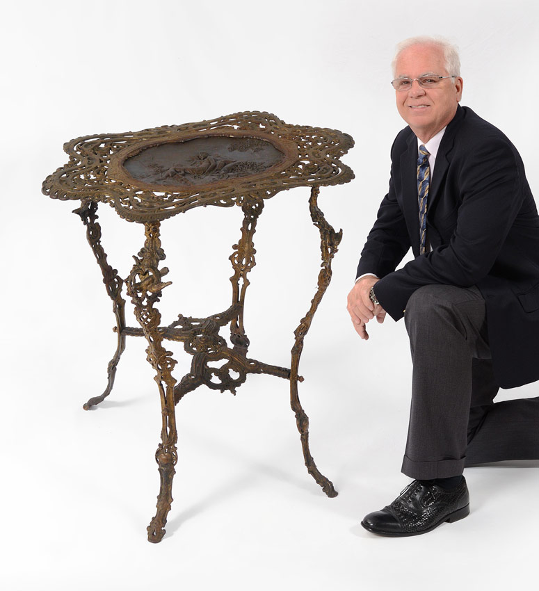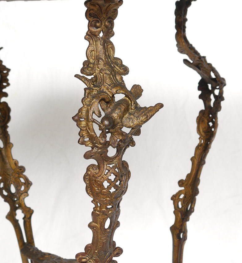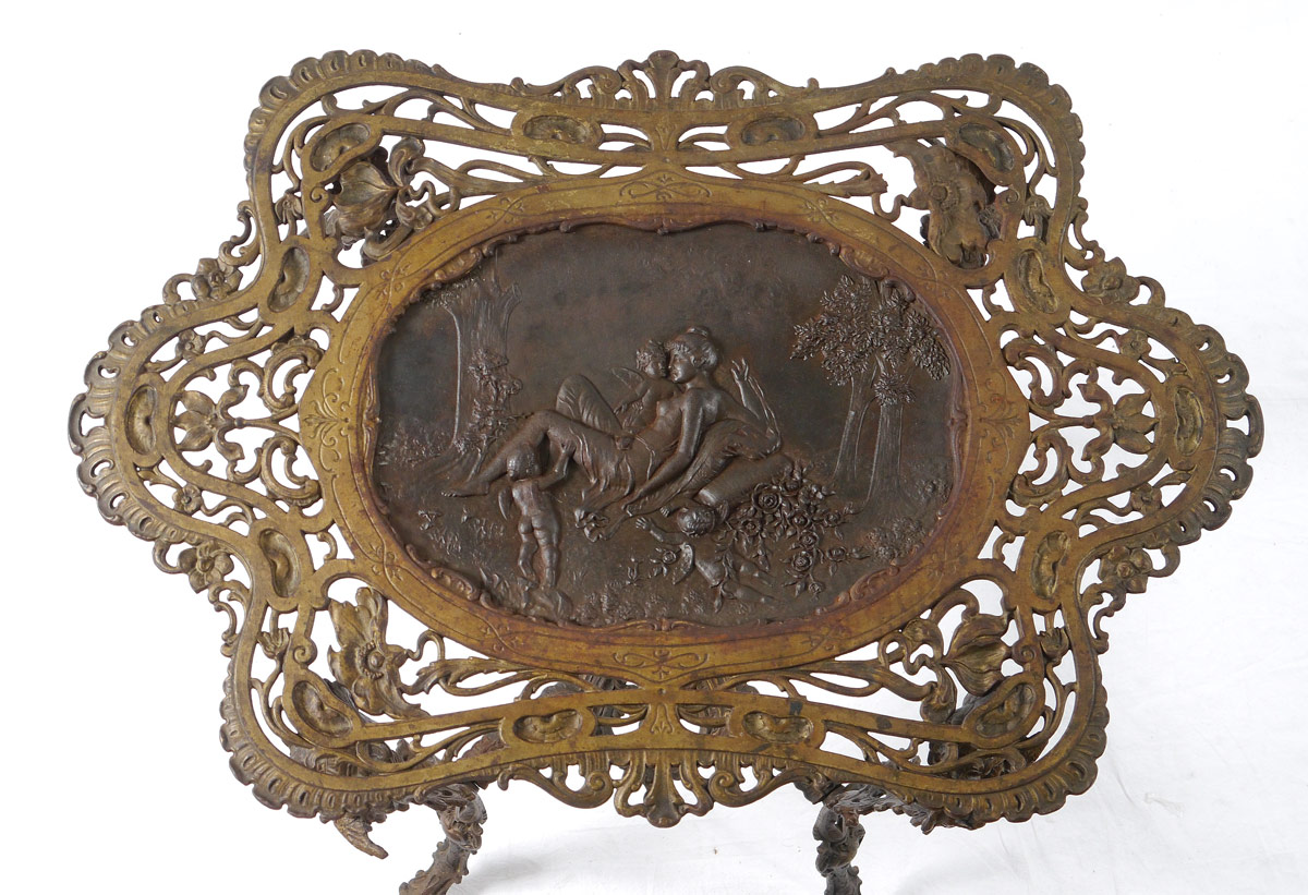 GILT METAL & BRONZE TABLE: Shaped and pierced top is centered by an inset plaque with maiden and cherubs, adorable birds to top of each of the four legs, shaped and pierced X stretcher in a floral & foliate motif, 29 1/2''h., top 29'' x 19'', feet flare out to 18'' x 23''.