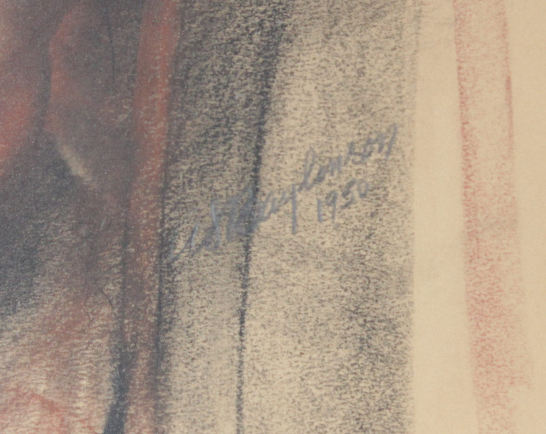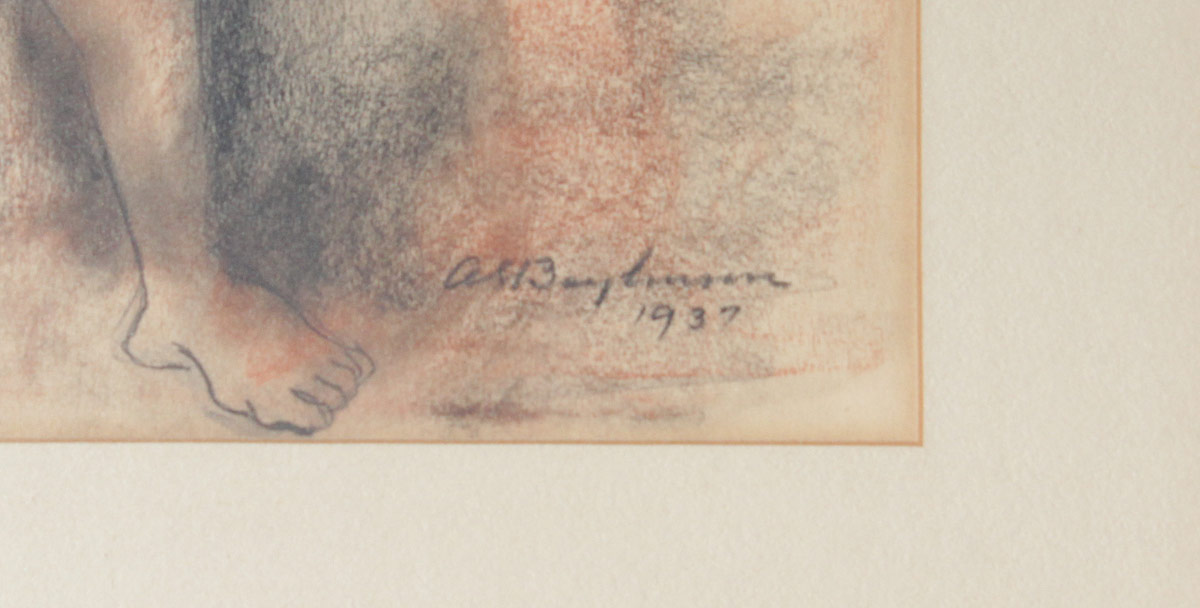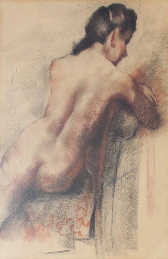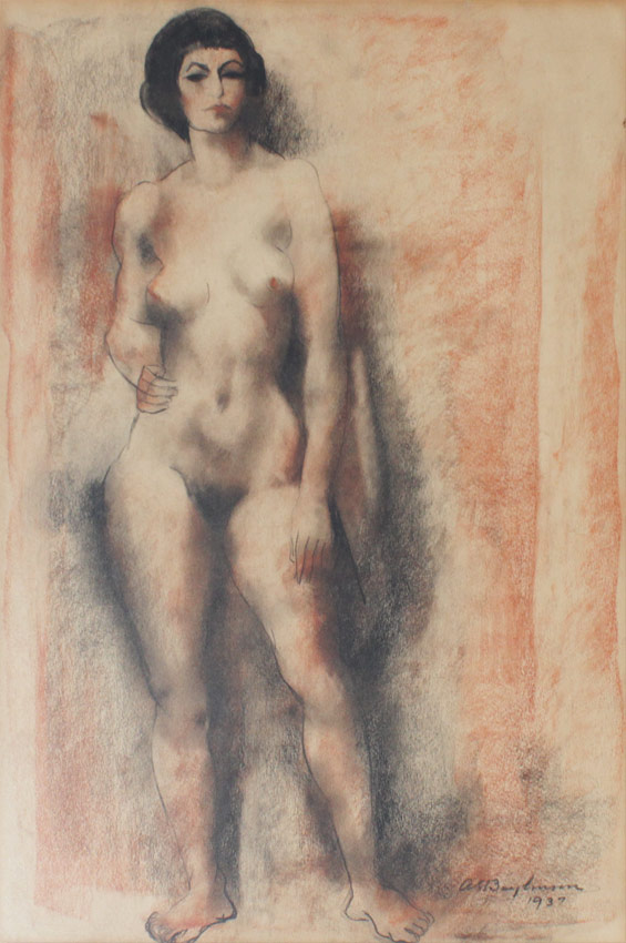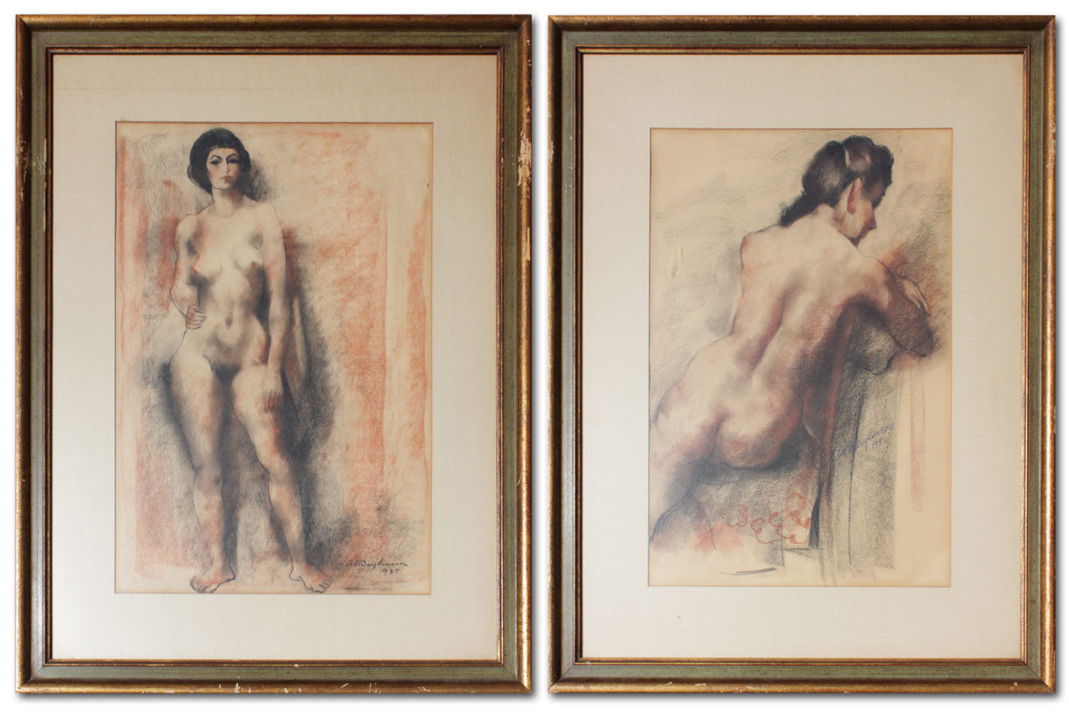 BAYLINSON, Abraham Soloman, (Russian-American, 1882-1950): : 1) Seated Female Nude from the Rear, Sanquine Charcoal/Charcoal, Sight size 19'' x 15 1/4'', signed lower right, dated 1950, encased in gilded and painted frames with wear, 20 1/2'' x 22 1/2''. 2) Full Standing Deco Era Frontal Nude, Sanquine Charcoal/Charcoal, Sight size 19 1/2'' x 13 1/2'', signed lower right, dated 1937, gilded and painted frame with wear 28 1/2'' x 22 1/2''.
