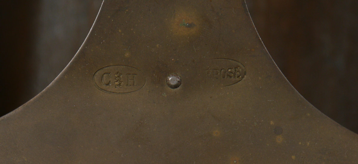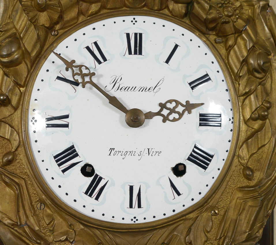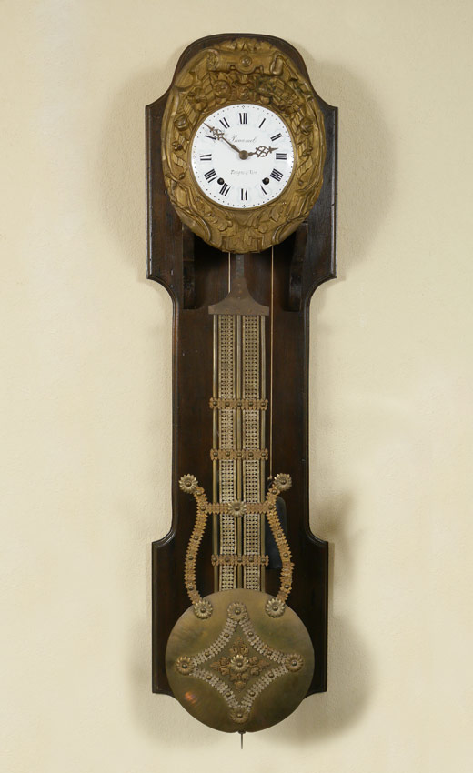 FRENCH MORBIER WAG ON THE WALL CLOCK: Case with embossed brass bezel, enamel dial with Roman numerals, marked Beaumel, Torigni-S-Vire. Time and gong strike movement. Large pendulum with pierced brass and applied decoration. Sold with wood wall mount. Case 17'' x 13'' x 7 1/2'', pendulum 42'' x 12'', wall mount 28'' h. x 15'' x 6 1/2''.