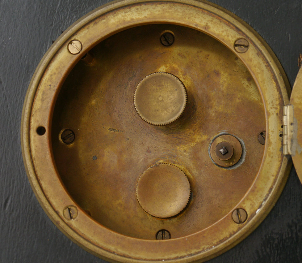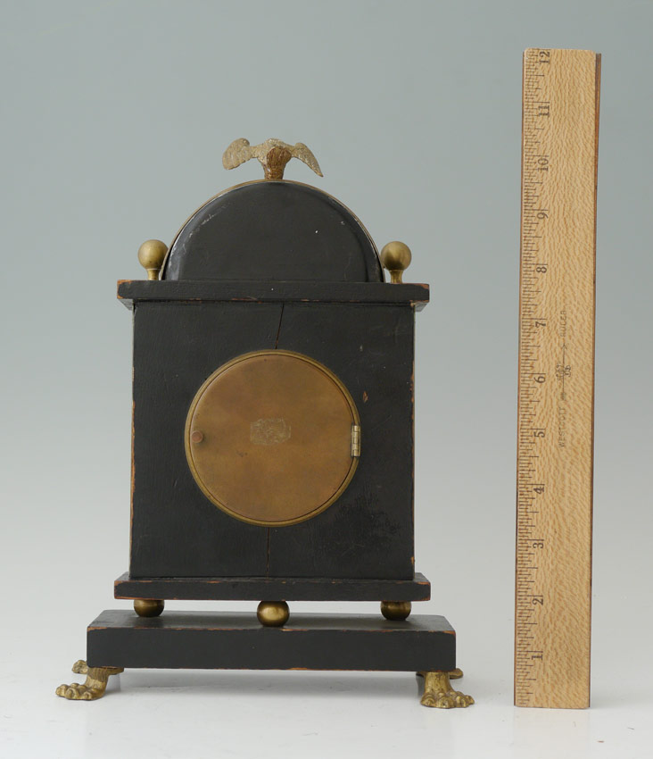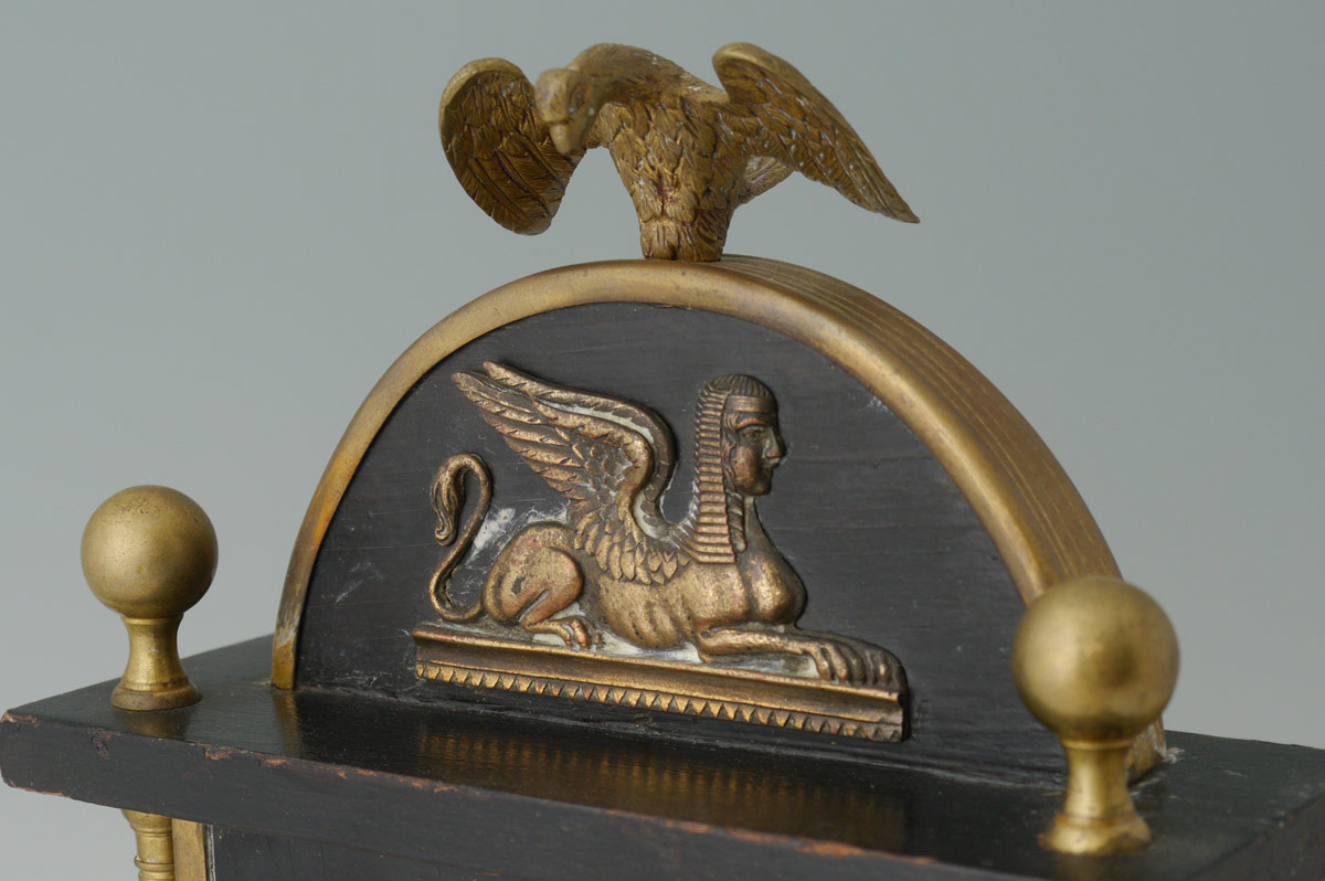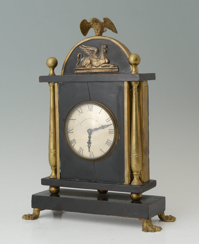 E. F. CALDWELL EGYPTIAN REVIVAL DESK CLOCK: Winged eagle finial over applied sphinx decoration. Ebonized wood case with brass columns, paw feet. Metal dial with Roman numerals, marked E. F. Caldwell & Co. Inc. New York. Back wind time only movement. Overall 10 1/2'' h. x 7 3/4'' x 3 1/2''.