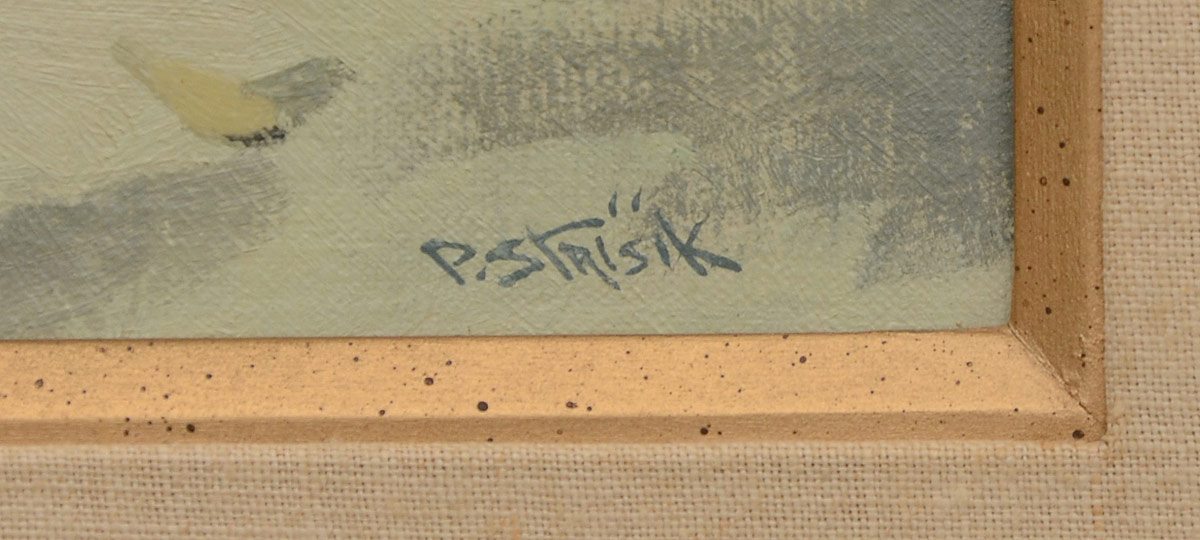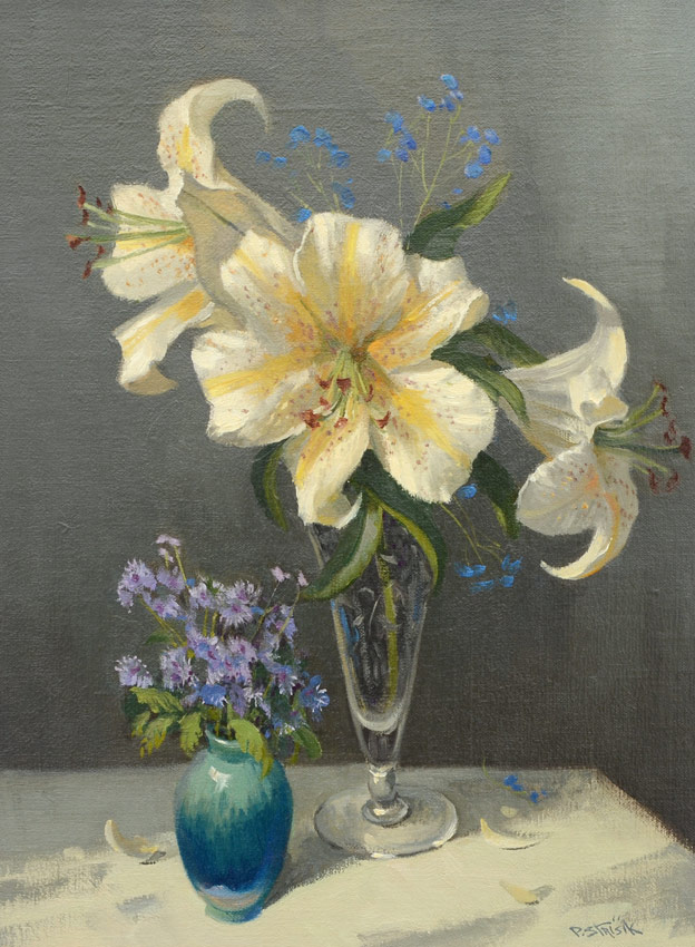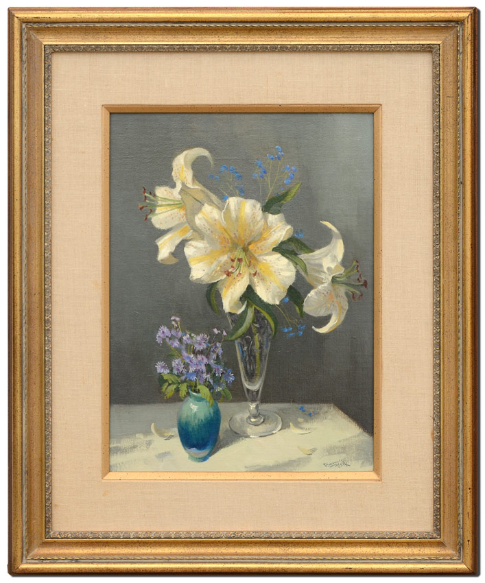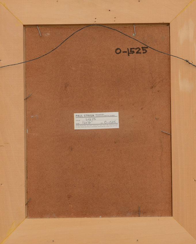 STRISIK, Paul, (American, 1918-1998): ''Lilies'', Oil/Masonite, 16'' x 12'', signed lower right, gold frame, 25'' x 20 1/2'', Rockport, Massachusetts label affixed verso.