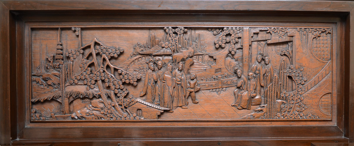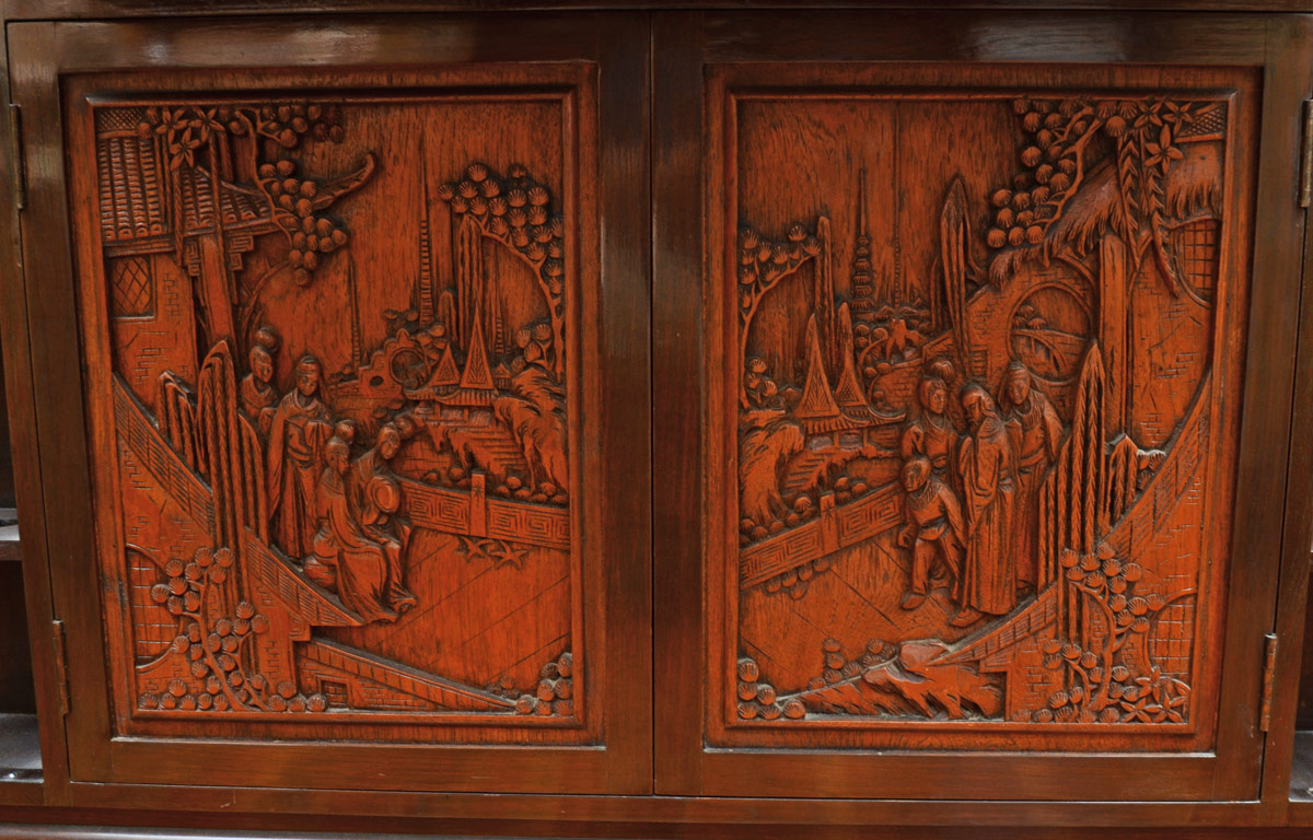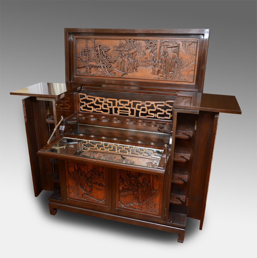 CARVED ORIENTAL LIFT TOP BAR: Carved panels front and sides featuring outdoor genre scenes. Lift top, 2 top doors open to reveal fall front with mirrored base interior, glass storage and carved decoration. 2 lower doors with slide out shelf with bottle storage. Corner side doors with shelves and stemware storage. 42 3/4'' h. x 44'' x 19''