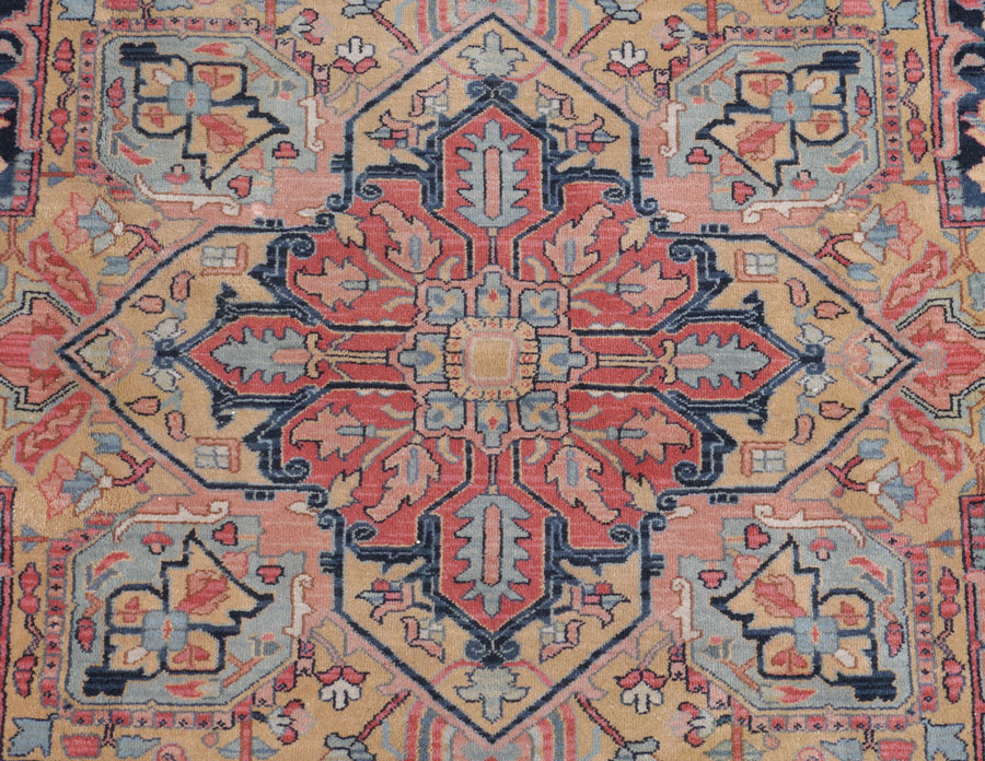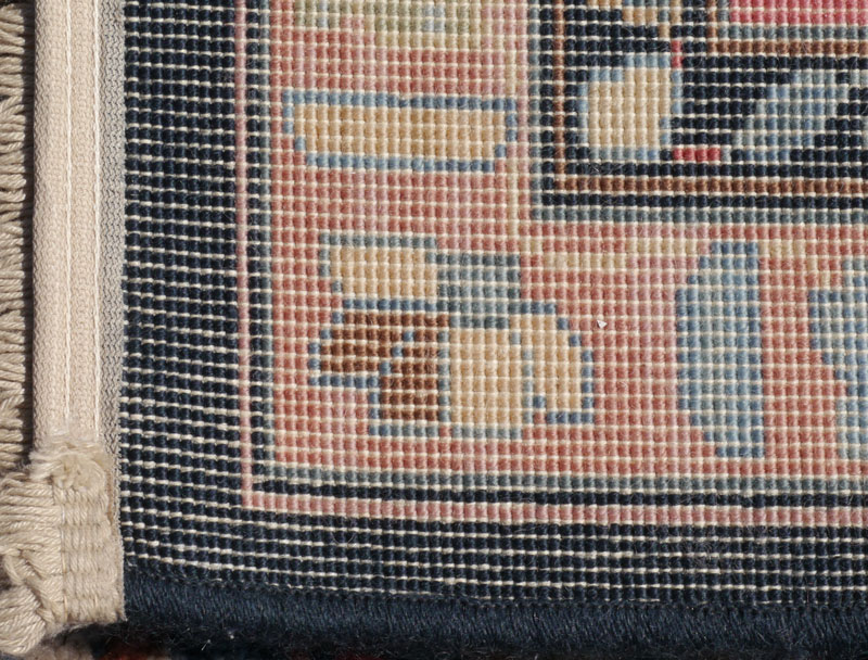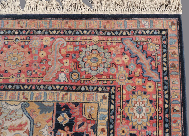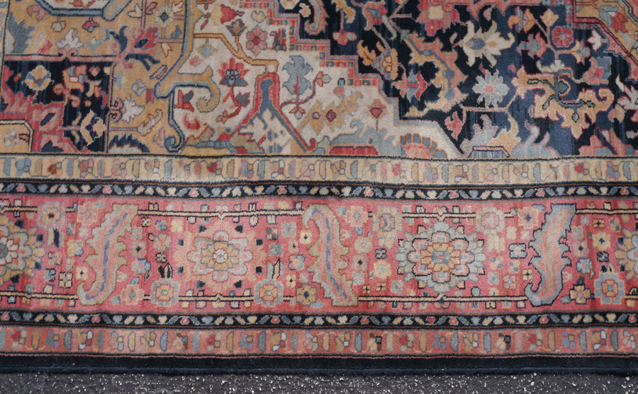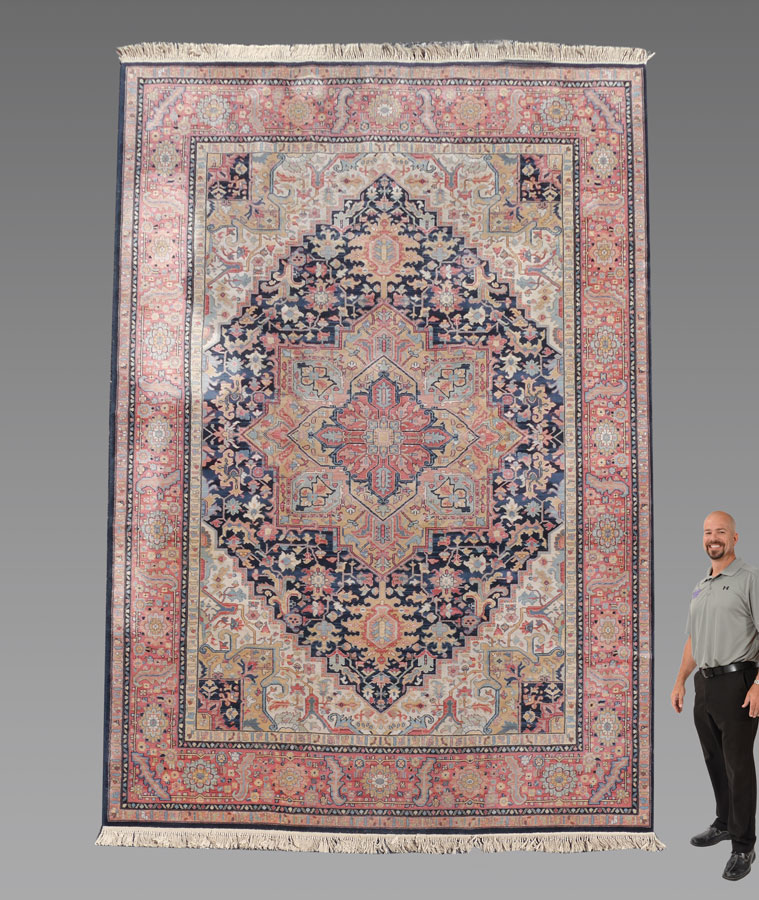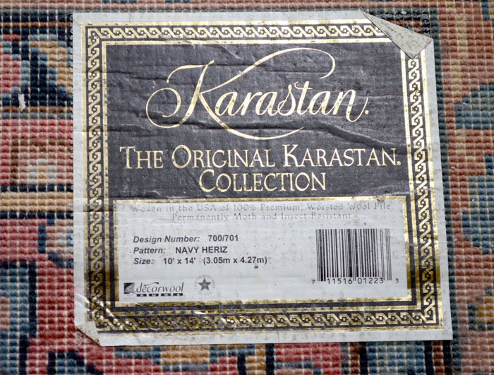 MACHINE MADE KARASTAN, **** NOTE CORRECT SIZE 10' X 14' *****: This beautiful carpet has a Heriz medallion design in soft blues, salmon pink, pale yellow, and a black central oval ground with white ground corners. The salmon pink colored main borders complete the rug. This rug probably cost $3000 to $4000 originally. Condition is good.