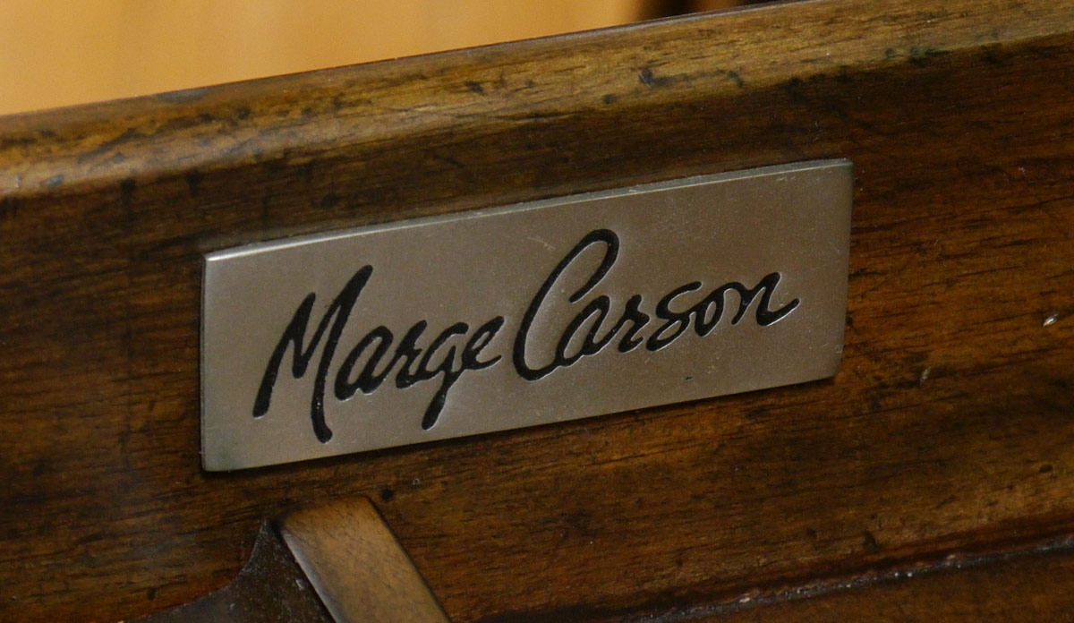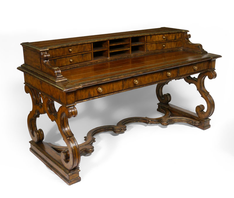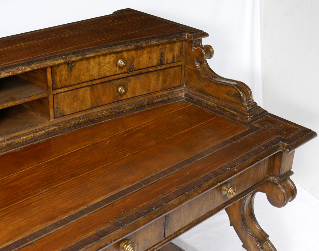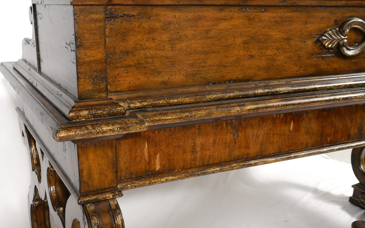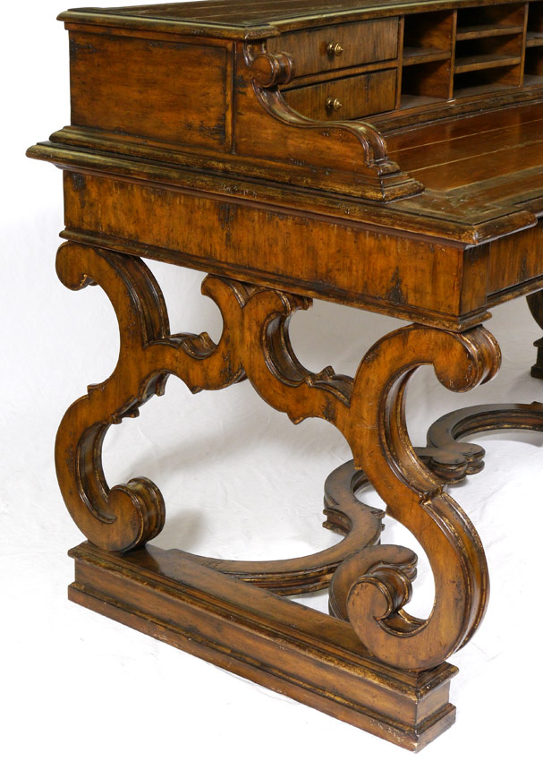 MARGE CARSON ITALIAN STYLE DESK: Top with 4 drawers and pigeon holes, wood writing surface over 3 drawers. Distressed and antiqued finish with gold. Carved and shaped legs and stretcher. Marge Carson plaque inside middle drawer. 38 1/2'' h. x 68'' x 32''.