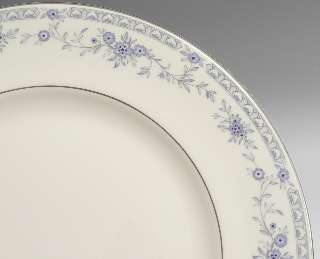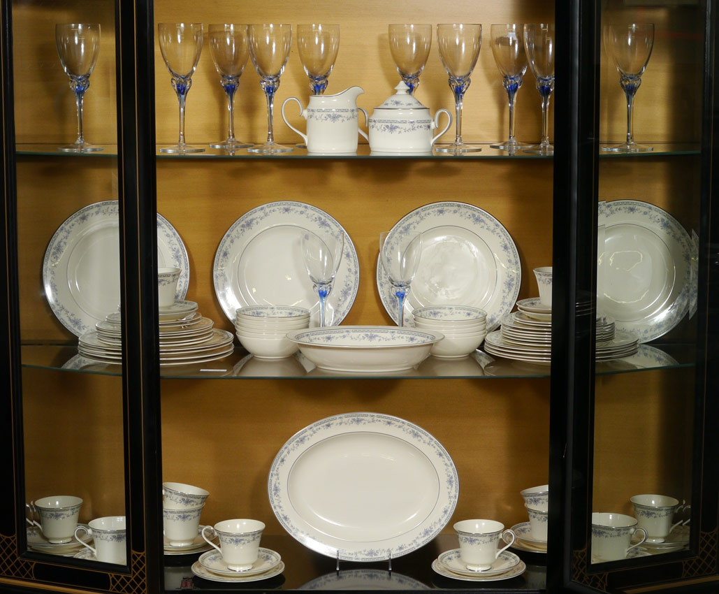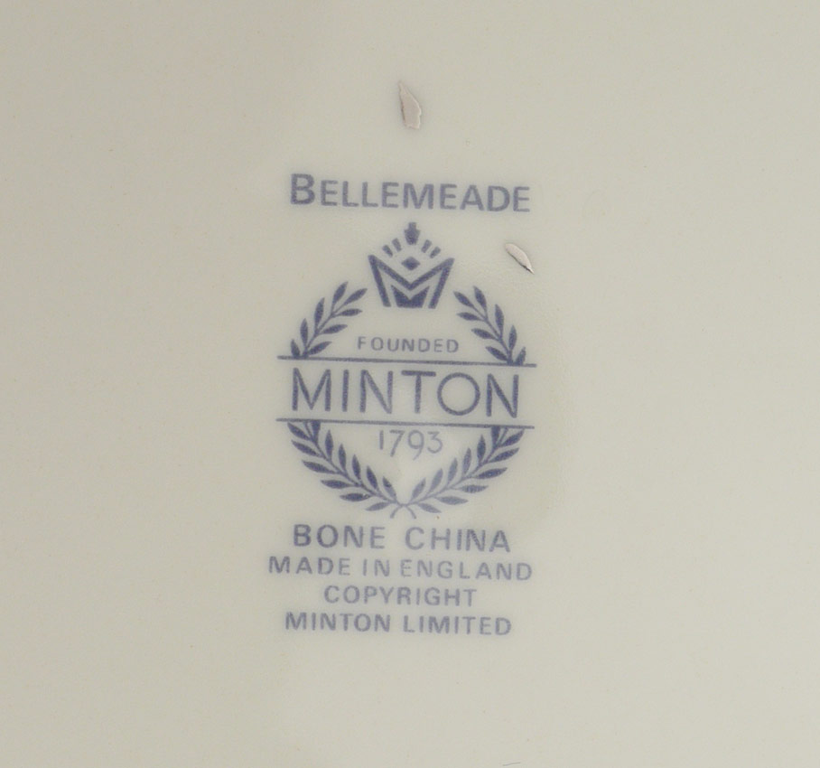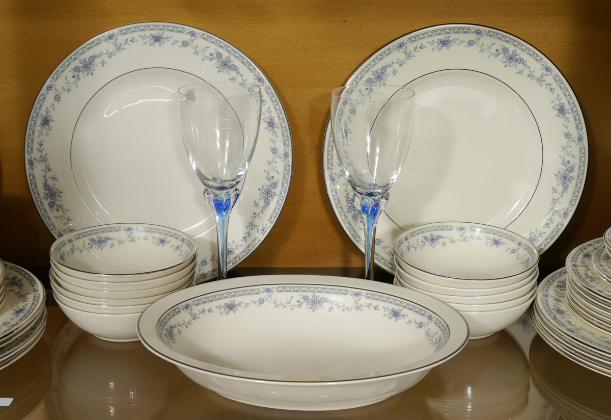 MINTON BELLEMEADE FINE CHINA SERVICE: Approx. 74 pieces to include 12 dinner plates, 11 salad plates, 12 bread plates, 11 dessert bowls, 12 teacups, 12 saucers, and a 13.5'' platter, open vegetable, creamer, and sugar. Sold with 12 blue stem crystal wine glasses.