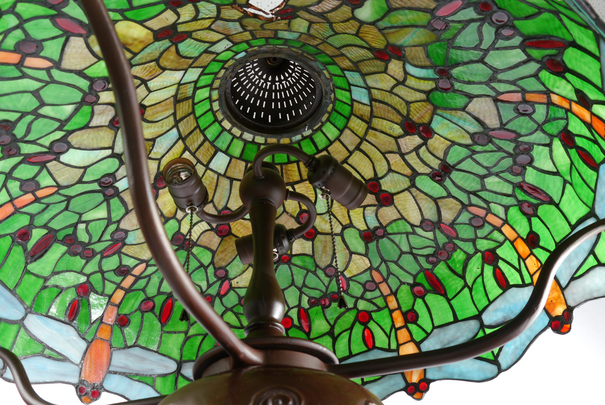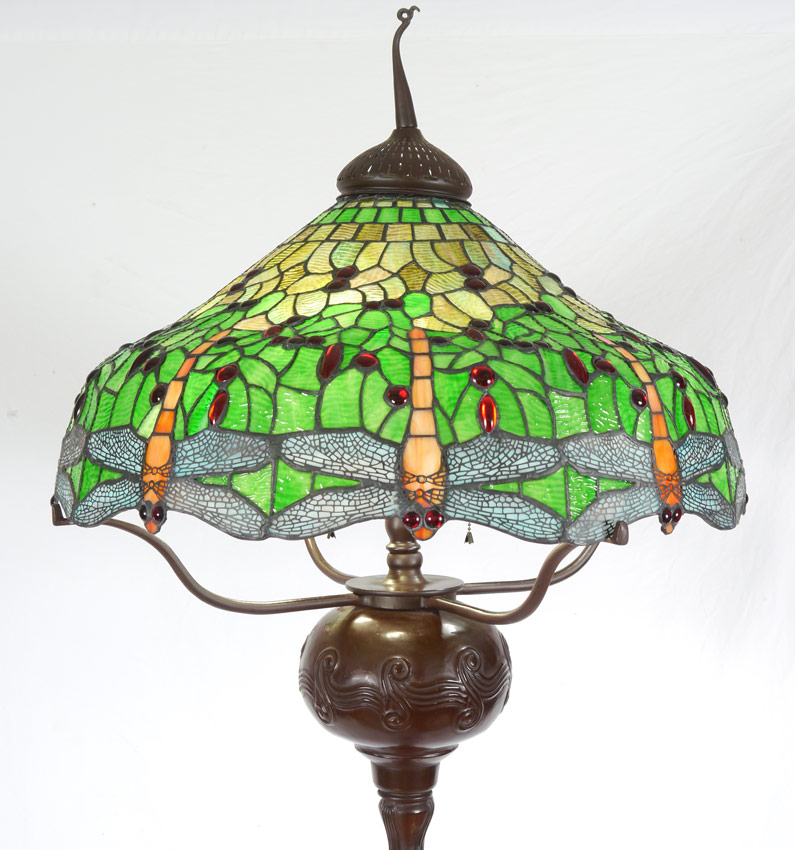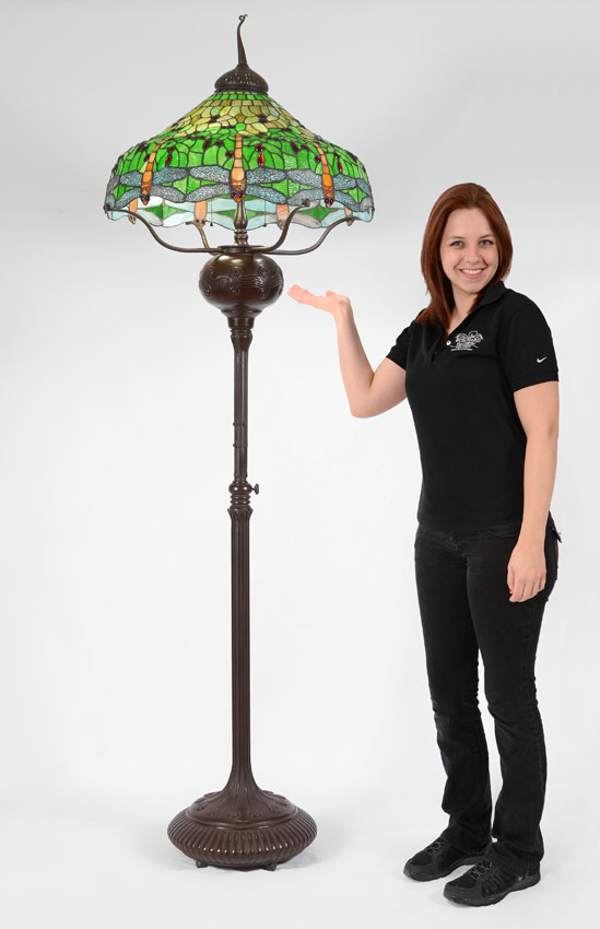 TIFFANY STYLE BRONZE & LEADED GLASS FLOOR LAMP: The shade in the dragonfly design. Measures approx. 7' tall, the shade 26'' diameter. Looking for a pair? View the previous lot 1229.