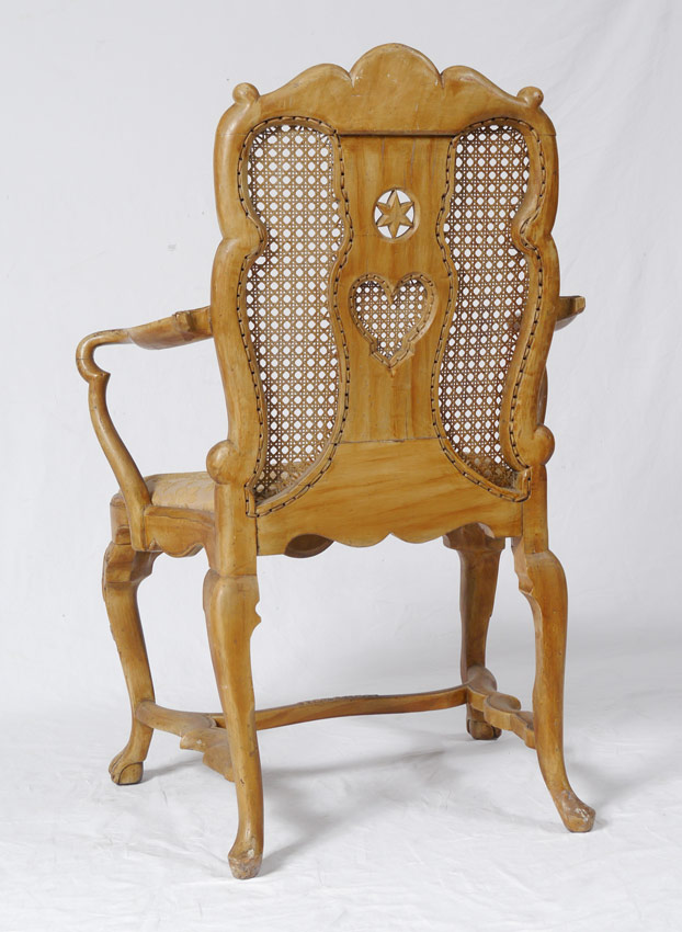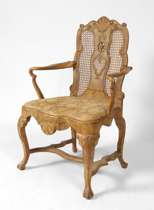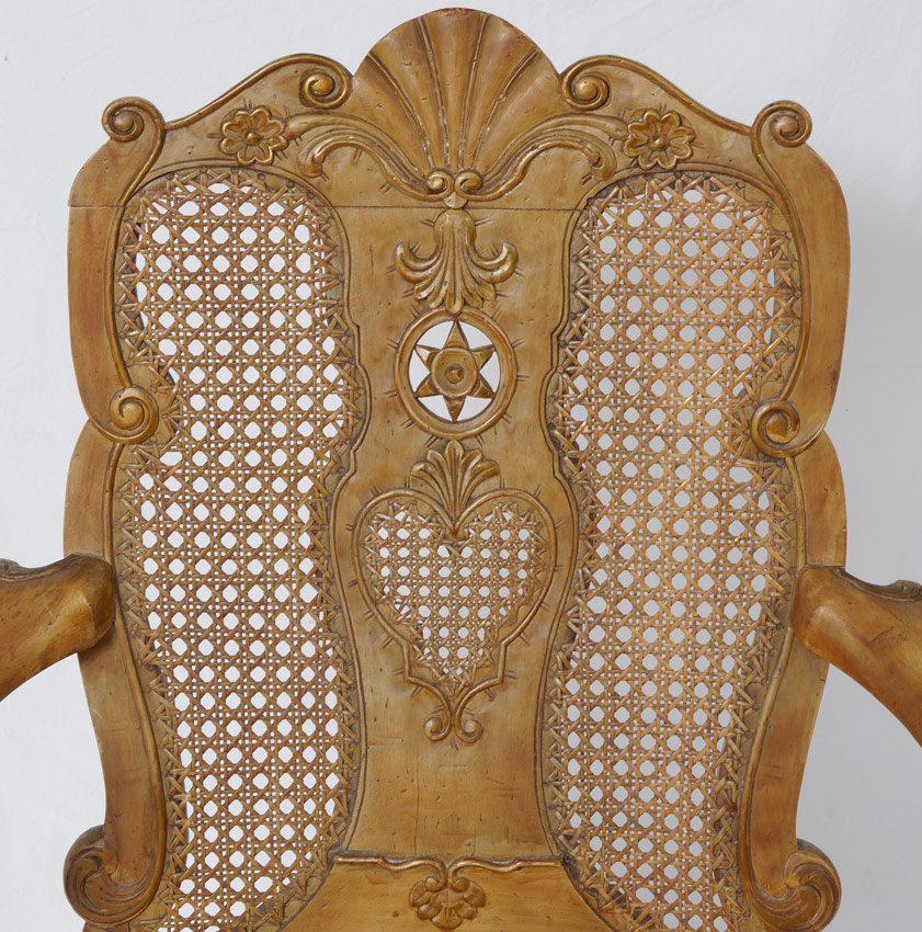 FRENCH STYLE CARVED ARM CHAIR: Carved, pierced, and caned back. Shaped arms, carved and shaped skirt, stretchers, and legs with front legs ending in paw feet. Tone on tone floral upholstery. 39 3/4'' h. x 27 1/2'' x 21 1/2''.