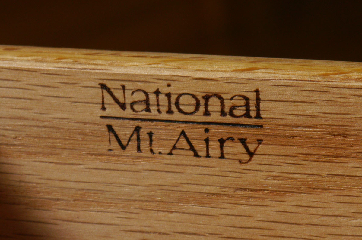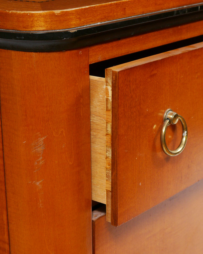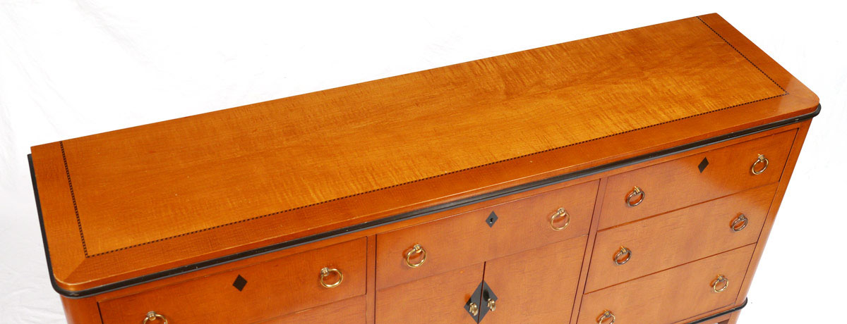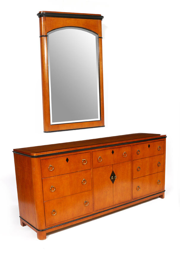 NATIONAL MT. AIRY DRESSER WITH MIRROR: Biedermeier style dresser with rope twist inlay. Central drawer over 2 doors with 2 interior drawers, surmounted by 3 drawers either side, brass pulls. 32'' h. x 71 1/2'' x 18 1/2''. Beveled glass mirror 51 1/2'' h. x 32'' x 3''.