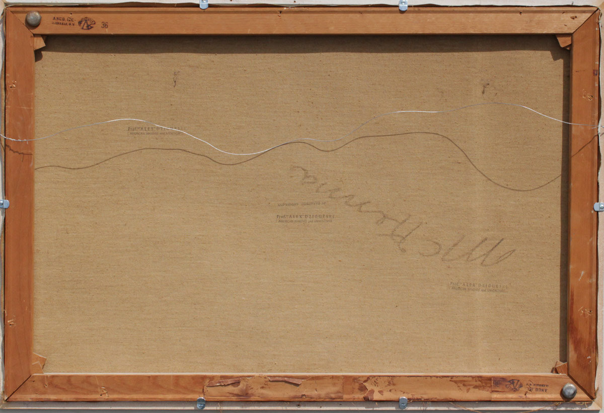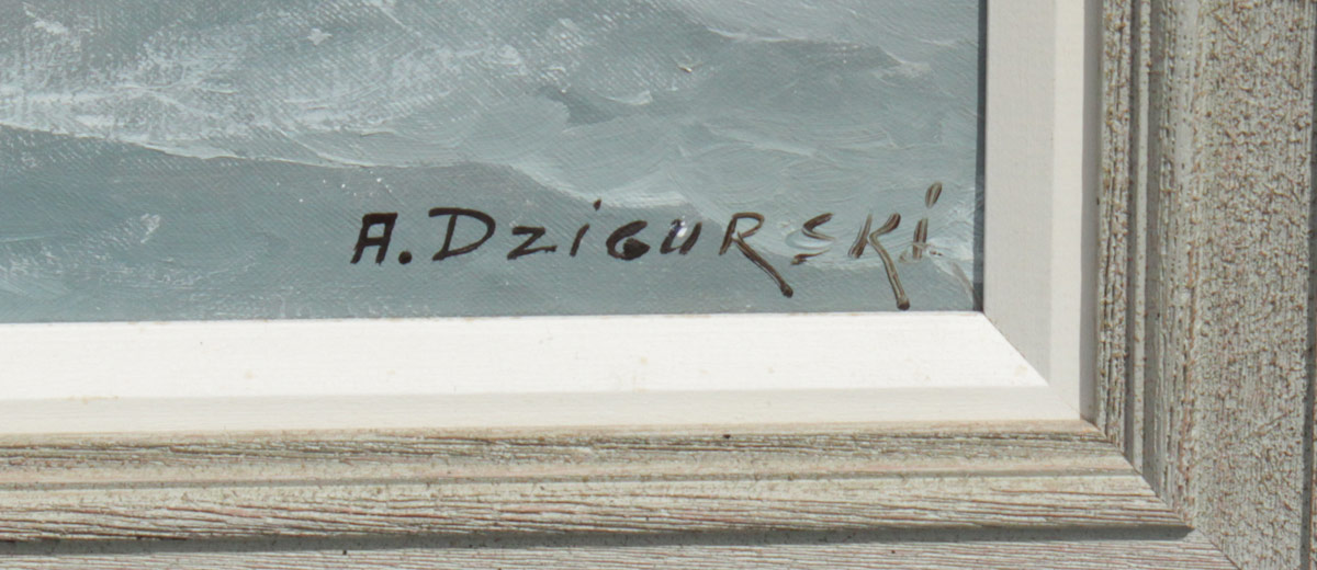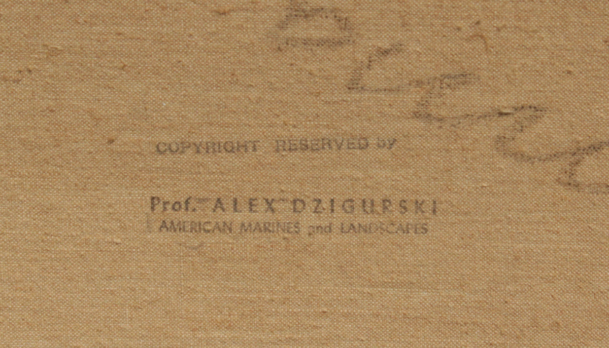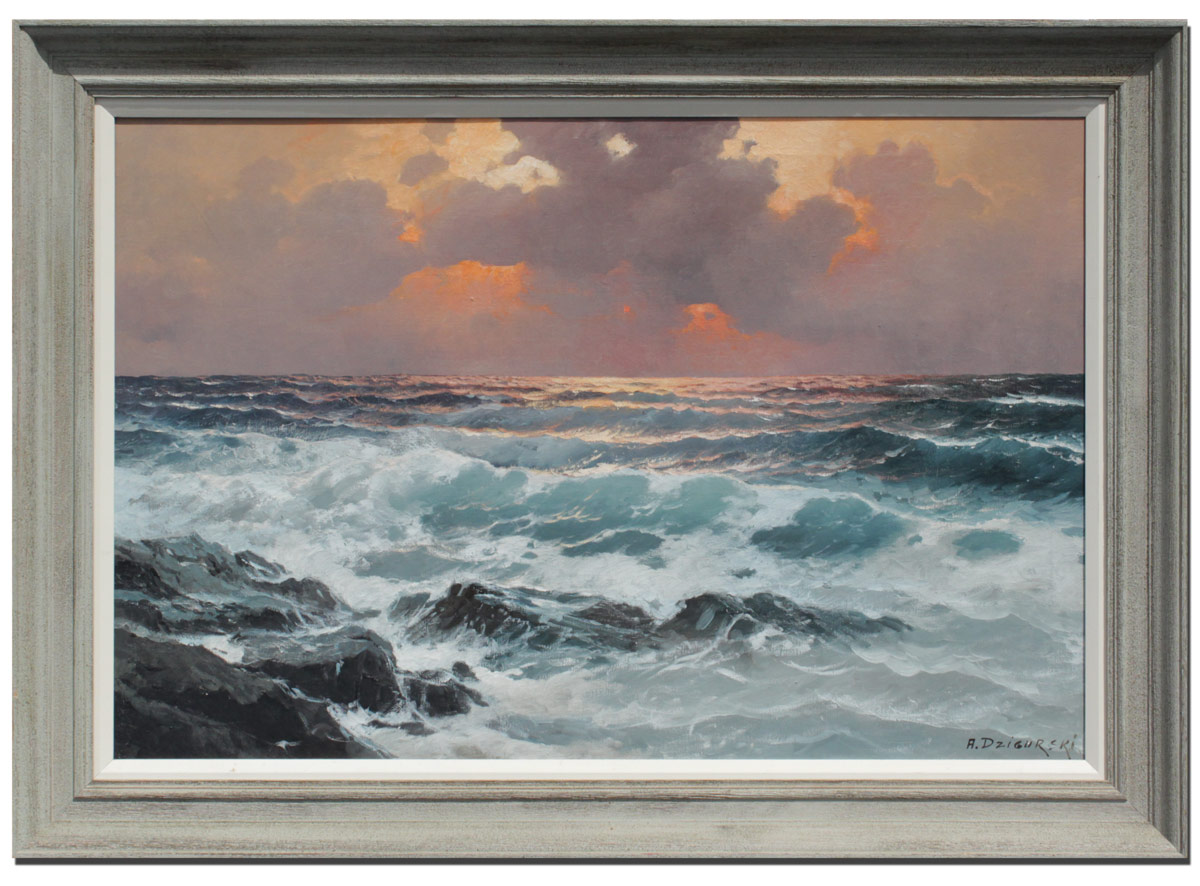 DZIGURSKI, Alexander A., (American, 1911-1995): Sunset Seascape, Oil/Canvas, 24'' x 36'', signed lower right, original painted frame measures 30'' x 42'', artist's stencil is stamped several times on the canvas, Prof. Alex Dzigurski Marines & Landscapes.
