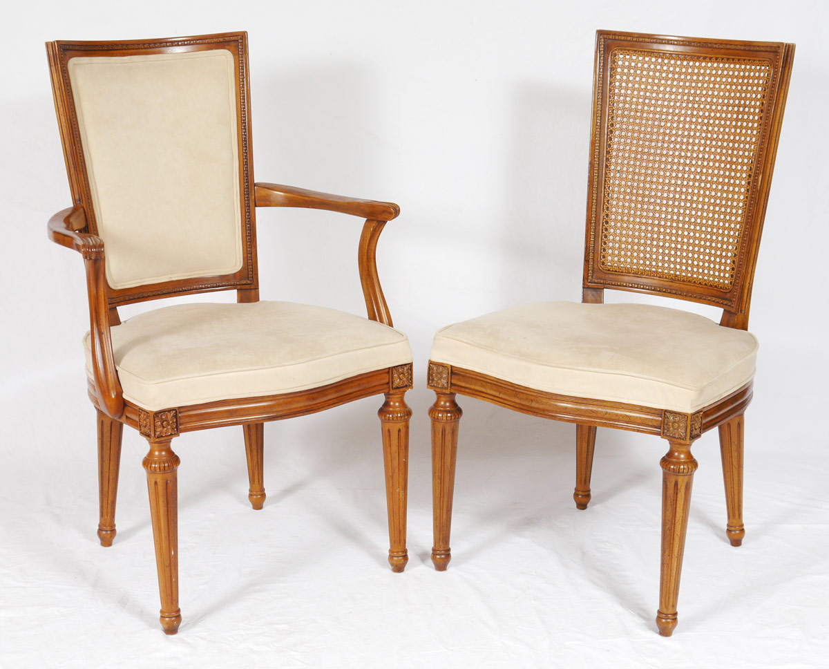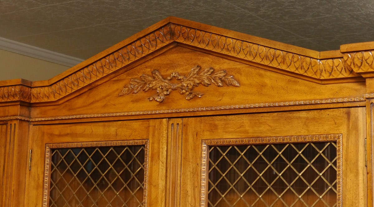 DAVIS CABINET COMPANY ITALIAN STYLE 10 PC DINING ROOM SET: Includes the glass and mesh wire front china cabinet, table with 2 leaves and 6 chairs. The cabinet measures approx. 79'' h. x 79 1/4'' x 20'', table 30'' h. x 64'' x 44'', leaves each 16'', arm chair 38'' h. x 24 3/4'' x 23''.