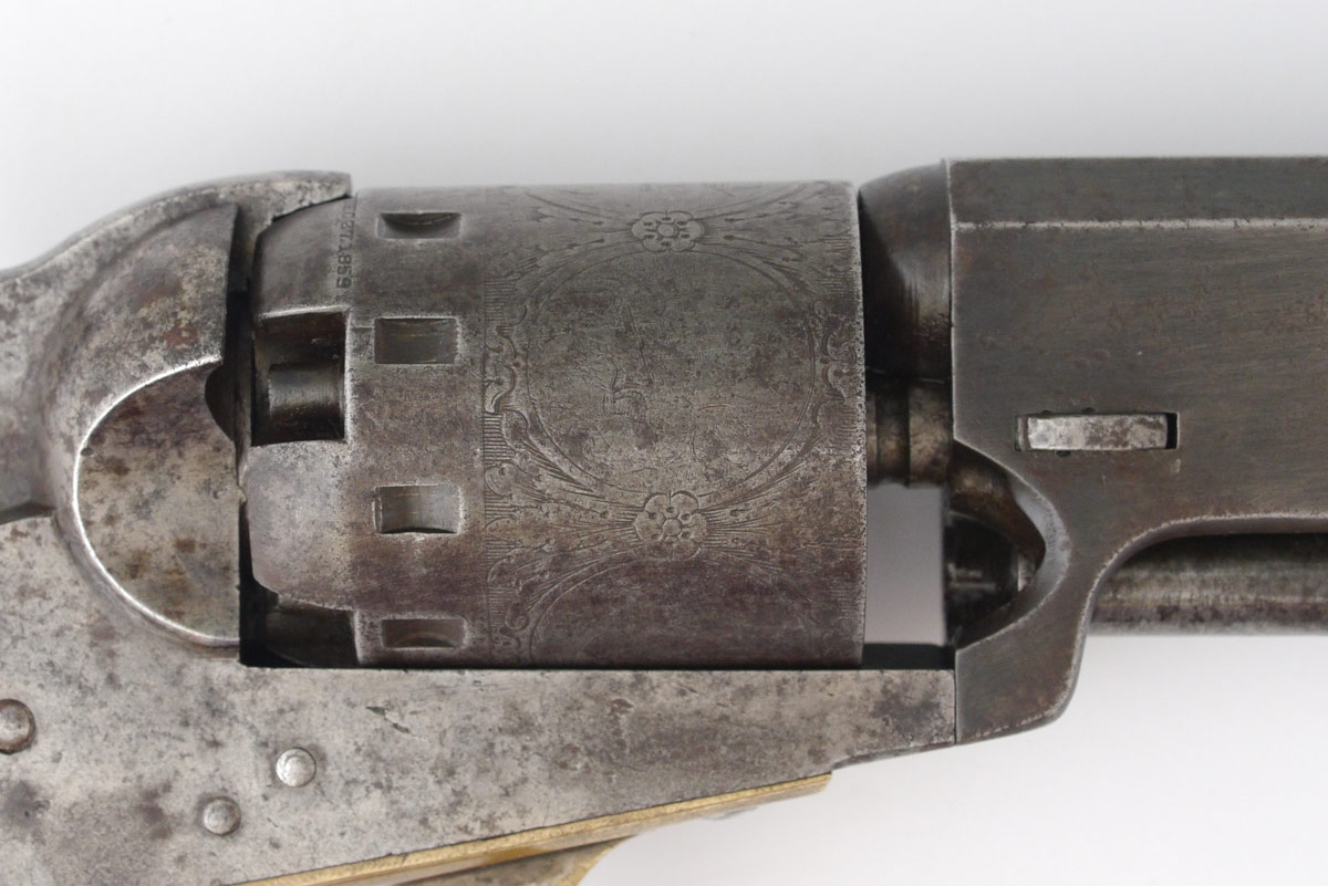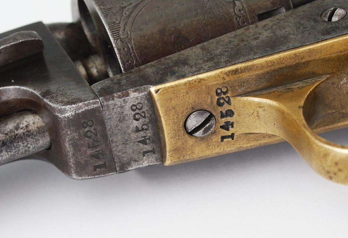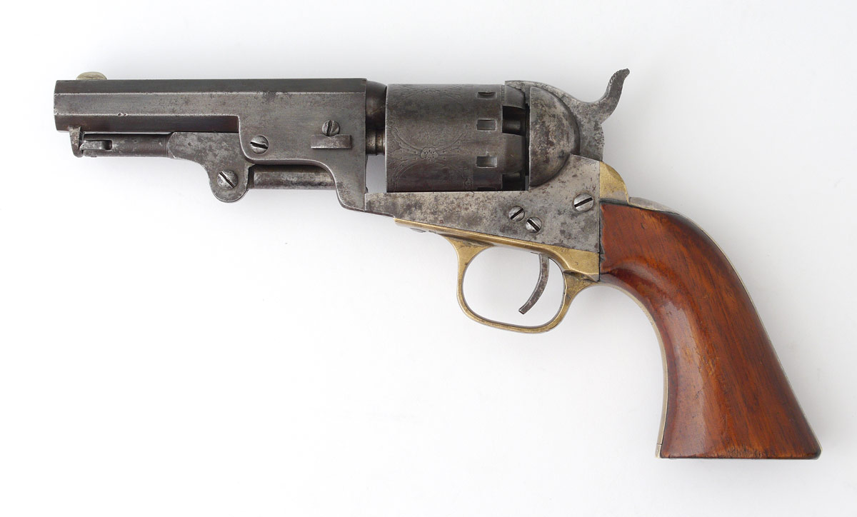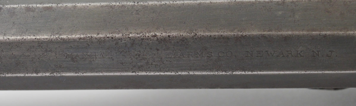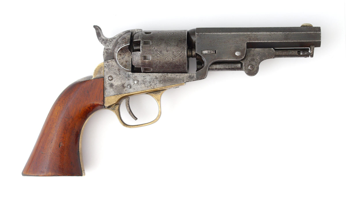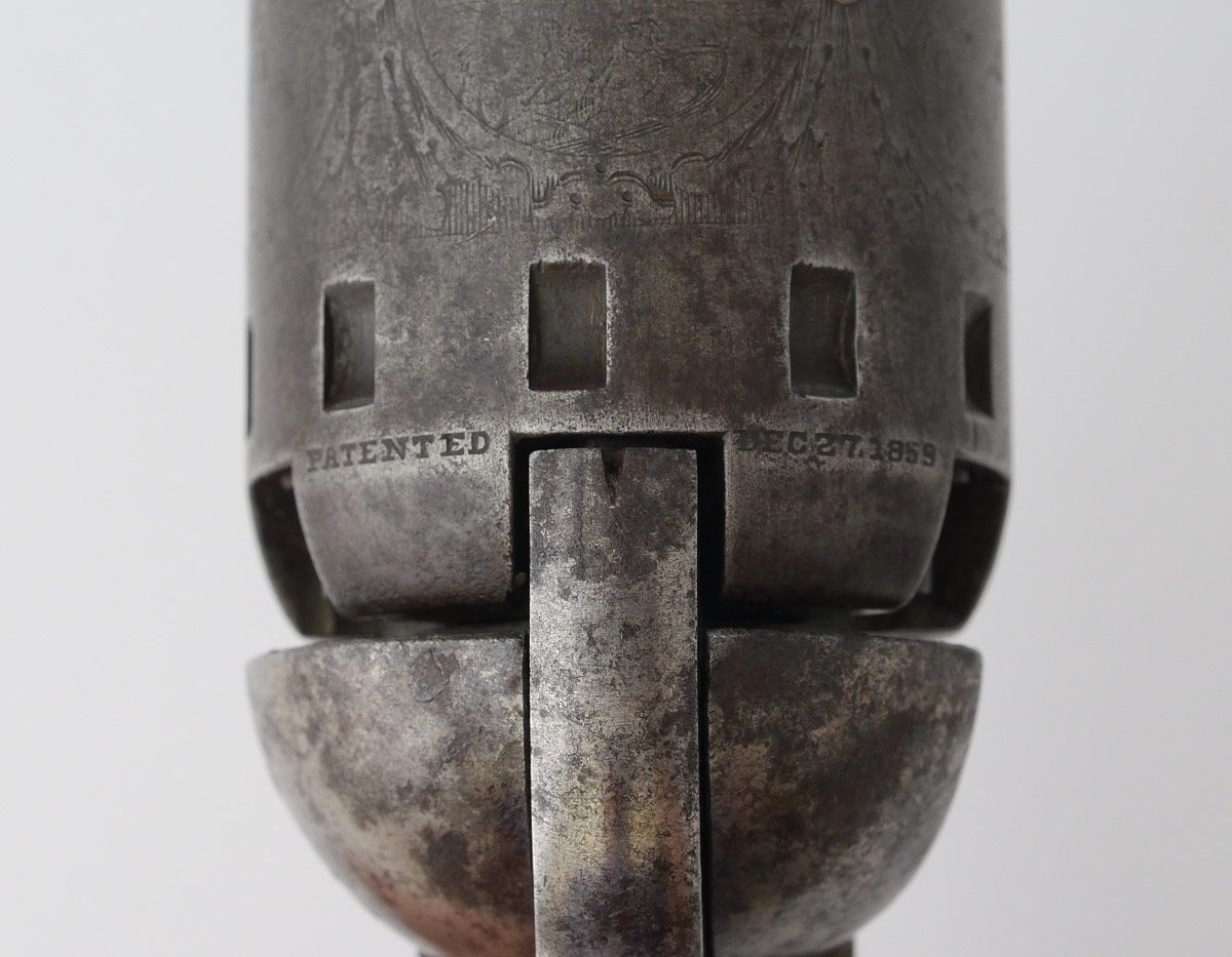 ID'D CIVIL WAR ERA MANHATTAN NAVY REVOLVER: Series III Manhattan ''Navy'' percussion pistol with owners name engraved on back of the period, ''A. Cuningham''. A quick search reveals 23 Civil War soldiers with that first initial and last name, more research will be required. 4'' barrel, serial number 14,528, indicating one of the first appearance of the spring plate mounted on the recoil shield. Partial cylinder scene, action nice and tight. Marked with 1859 patent on cylinder, ''Manhattan Firearms Co. Newark NJ'' on barrel. 50-60% blue and patina remains, 95% varnish on walnut grips. Overall 9''.