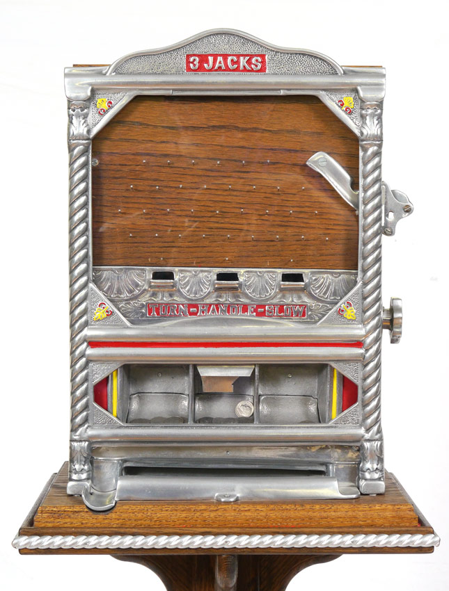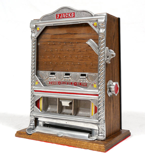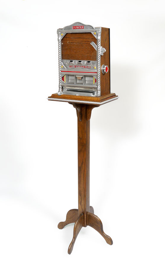 FLOOR MOUNT ROYAL BELL 3 JACKS TRADE STIMULATOR: Dime coin operated ''3 Jacks'' trade stimulator, coin flip action. Remanufactured by Royal Bell, serial number 35200. Oak case, stimulator measures 17 1/2'' h. x 13 1/4'' x 9''. Sold with an oak base, 40'' h. x 17 1/2''.