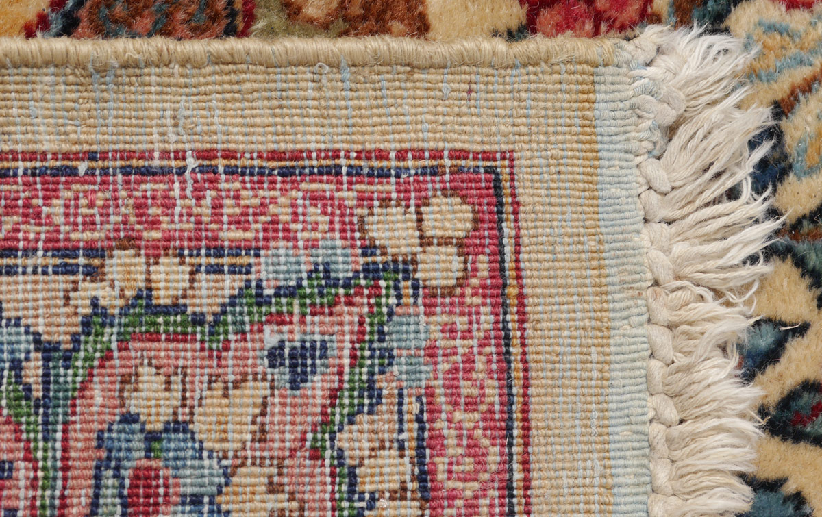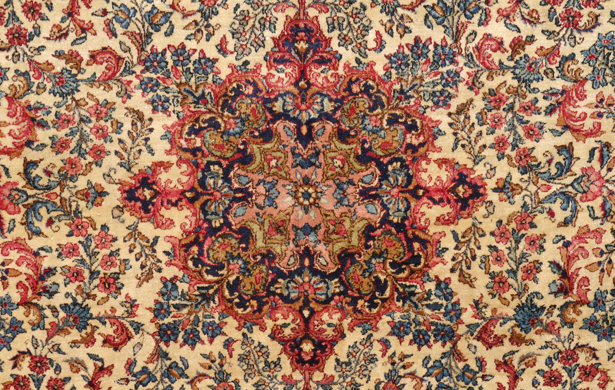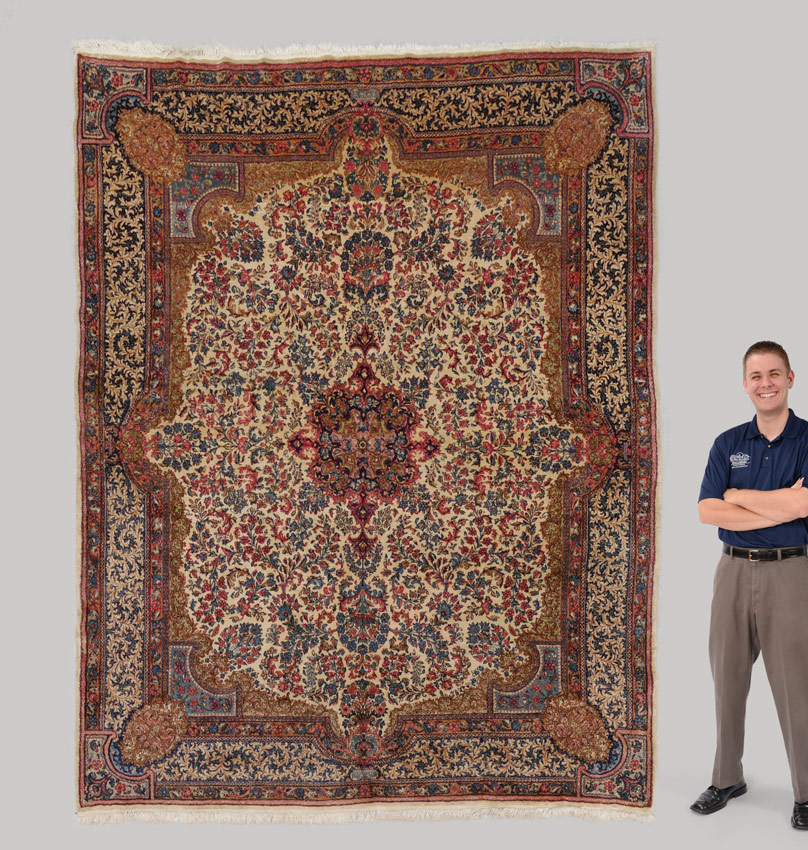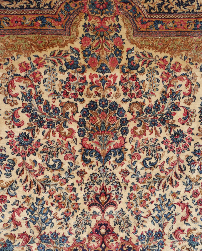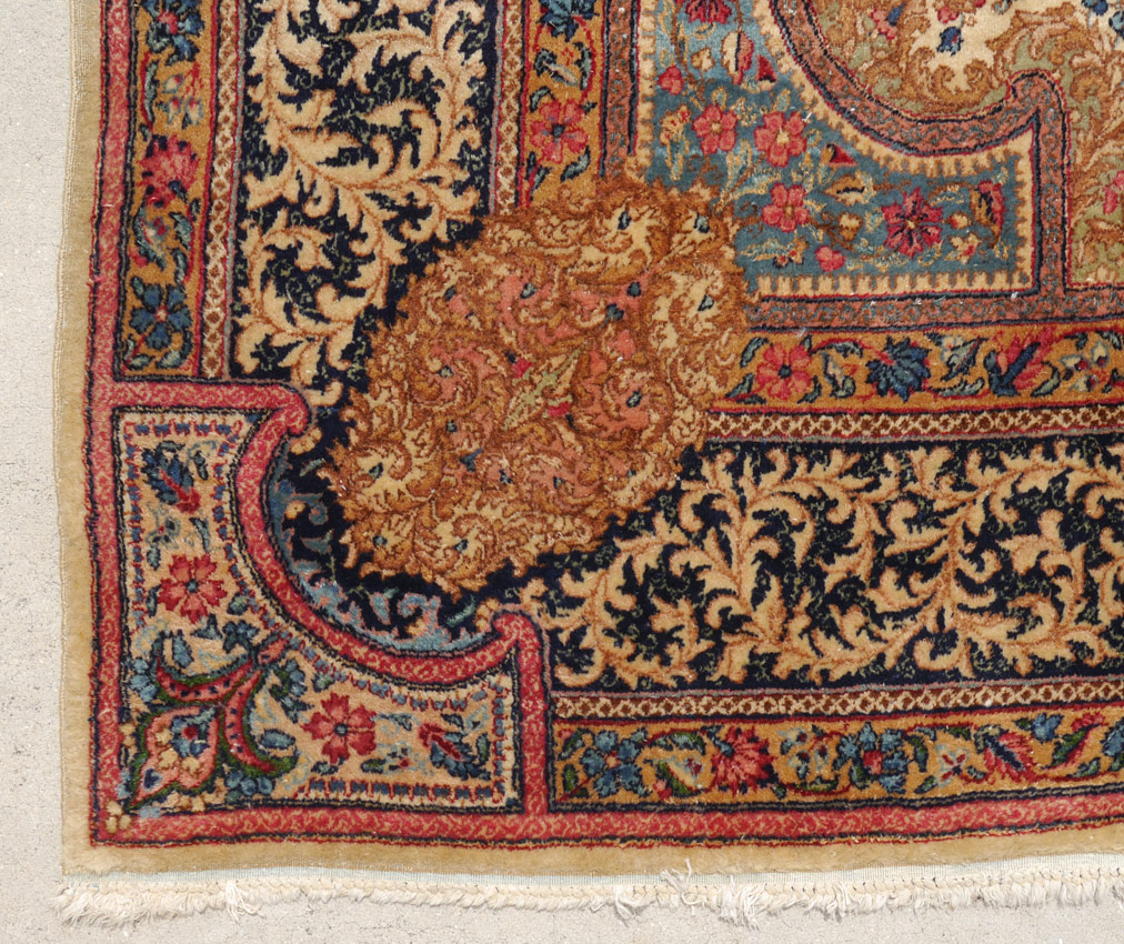 SEMI-ANTIQUE PERSIAN KERMAN HAND KNOTTED WOOL RUG, 7'11'' x 9'6'': This pretty rug has the more desirable overall pattern found in quality Kerman rugs. There is a central medallion but it is surrounded by an ivory field that is covered with sprays of flowers done in shades of blue, green, pink, beige, and black. The corners and middle of the sides of the field of the rug are scalloped and motifs from the field go in the border. This broken border is an asset to the overall look of the rug and shows the complexity of the design. Condition is good.