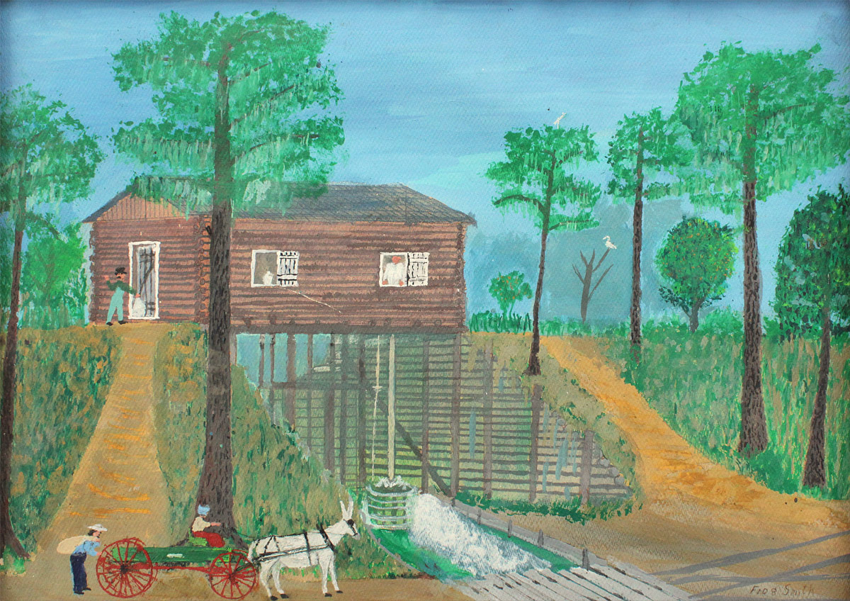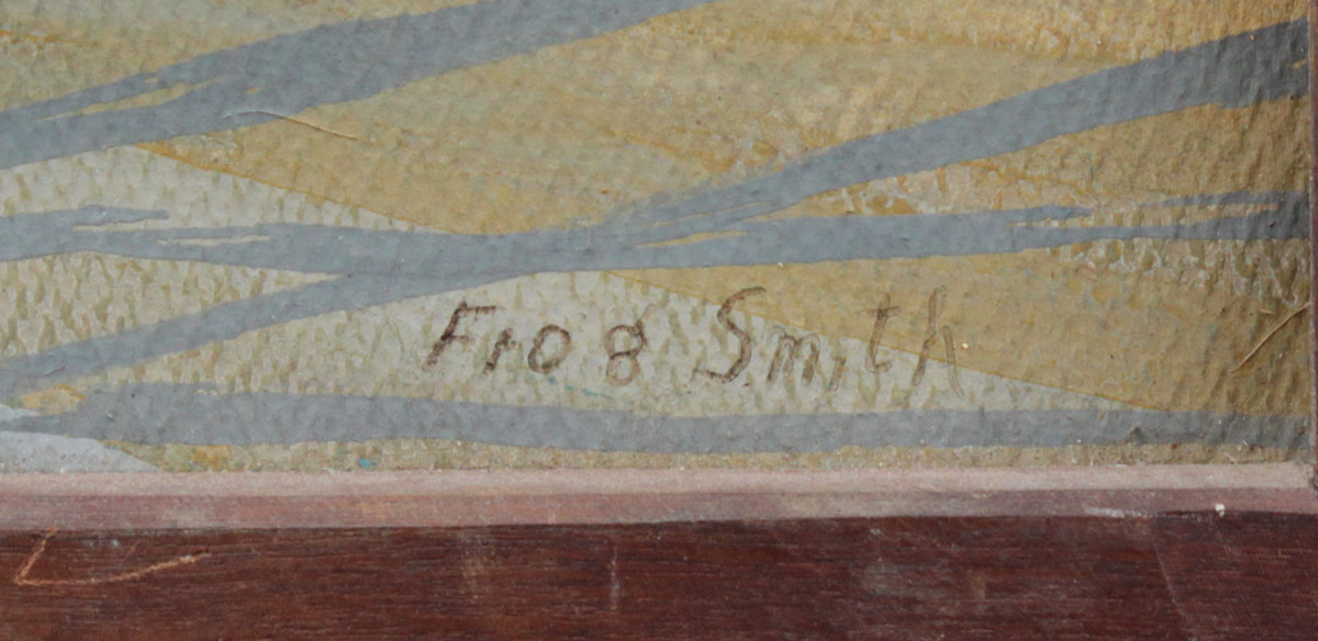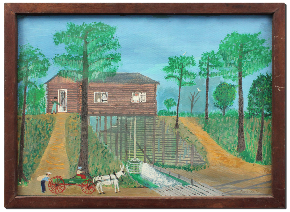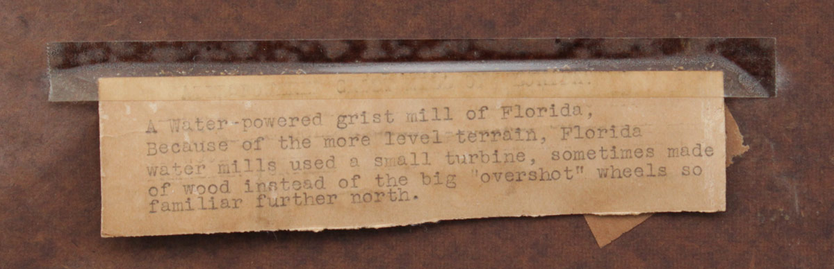 SMITH, Frog, (American, 1928-1944): Landscape with Grist Mill, Watercolor, Sight size 17 1/4'' x 24'', signed lower right, wooden frame 19 1/4'' x 25 1/2'', original typewritten information verso reads ''A Water powered grist mill of Florida. Because of the more level terrain, Florida water mills used a small turbine, sometimes made of wood instead of the big ''overshot'' wheels so familiar further north.''