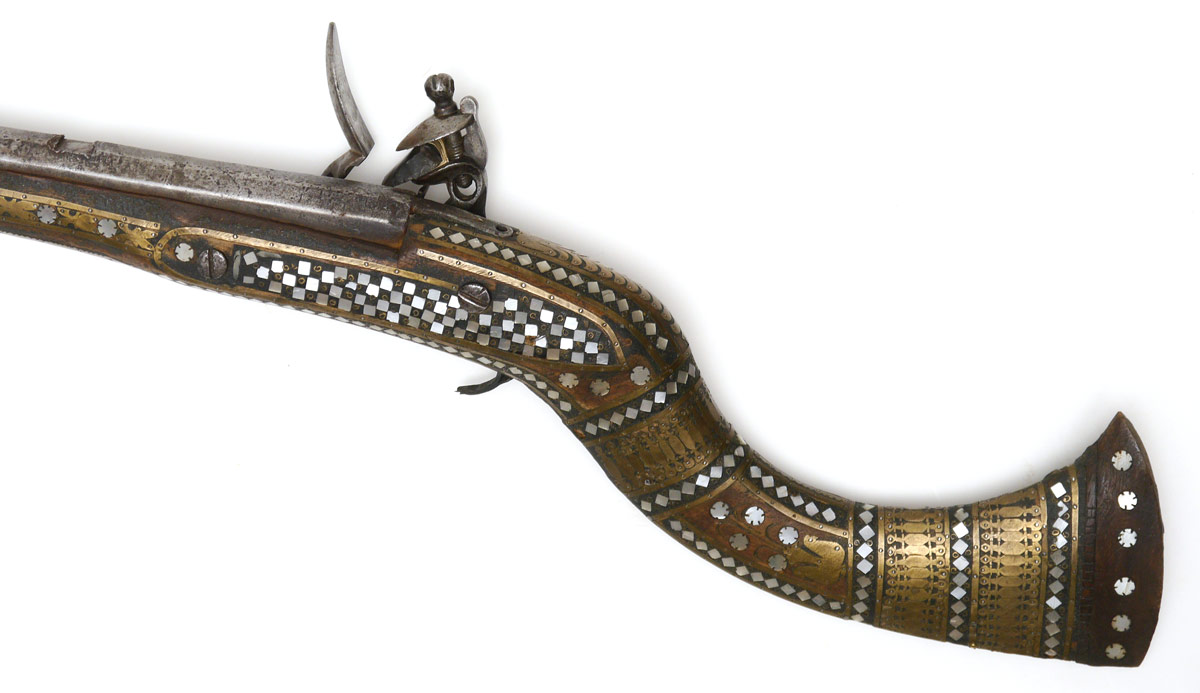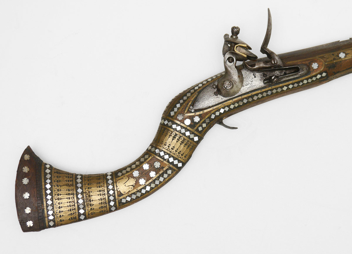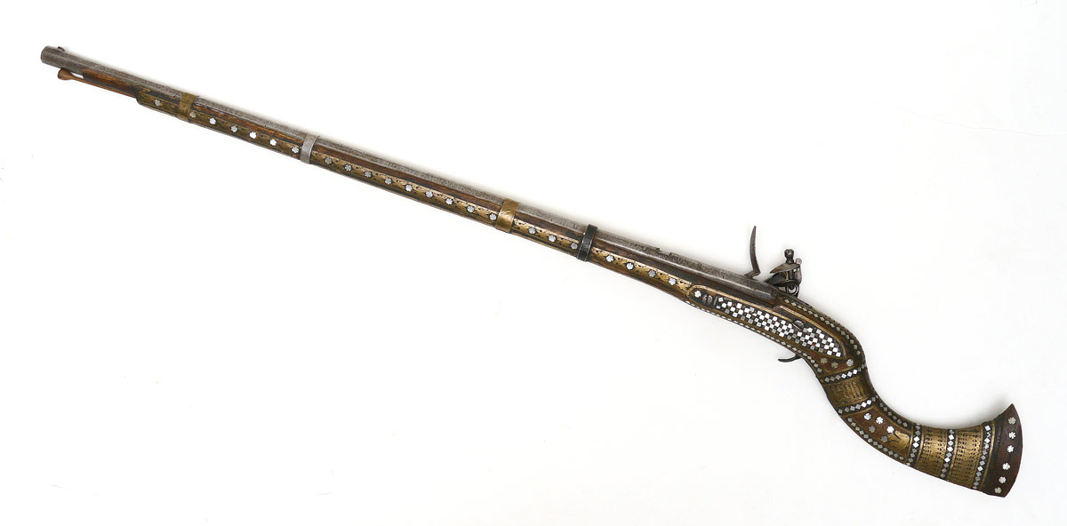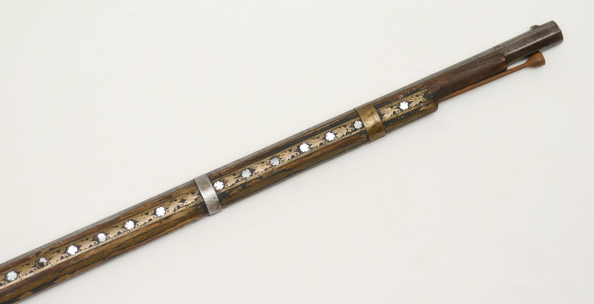 BRASS & MOTHER OF PEARL INLAID JEZAIL RIFLE: 19th century Persian or Afghan flintlock full stock with intricate brass and mother of pearl inlay. 39'' octagonal barrel missing rear site. Lockplate marked with crown over 8, engraved rampant lion. Action sticks and hammer does not hold in cocked position. Overall 52 1/2'' long.