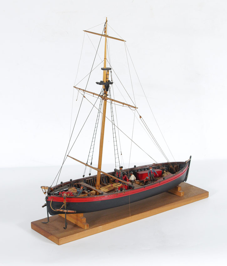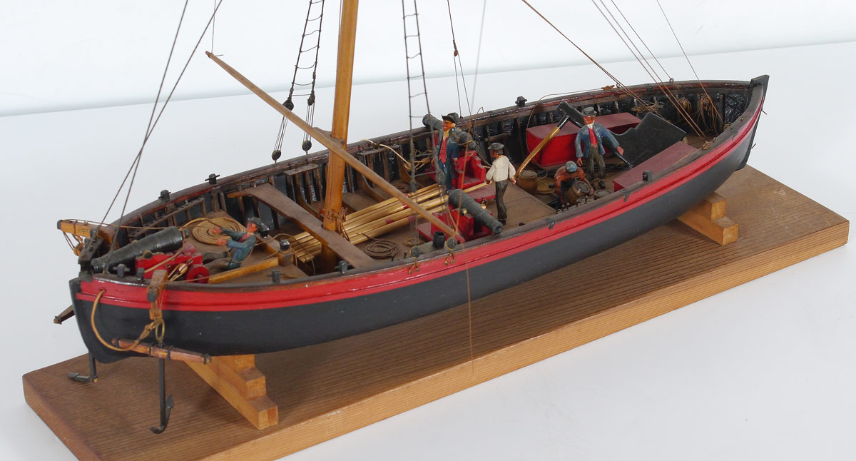 SHIP'S MODEL HANDMADE BY FREDRICK W. SHAFFER: Detailed carving of an unnamed single mast ship with figures dressed in seafaring garb, 3 cannons, brick oven, ropes and other riggings. Hand carved and built by noted pre-Columbian author Fredrick W. Shaffer. Measures 22 1/4'' h. x 11 3/4'' x 21'' overall. Sold with Lexan cover, 24'' x 14'' x 24''.