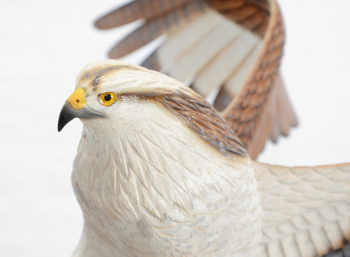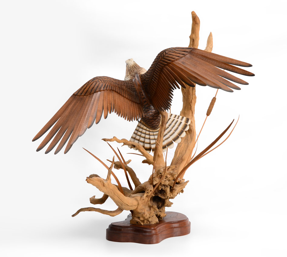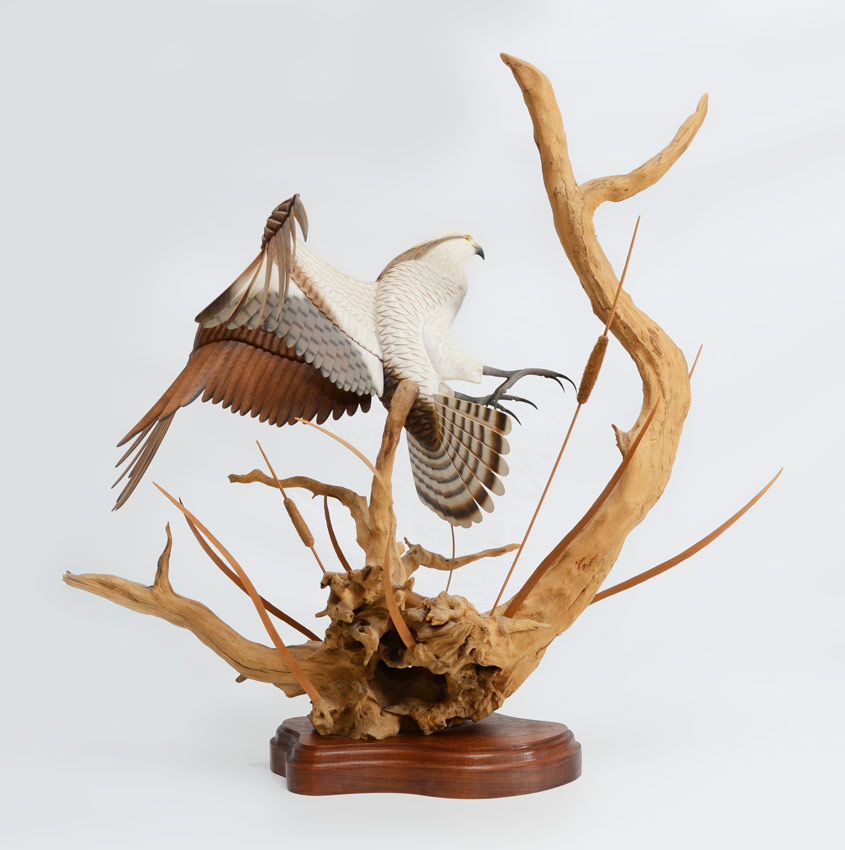 OWENS, Jim, (American, 20th Century): Detailed wood carving of an osprey in flight with talons extended from Florida base carver Jim Owens. Mounted to driftwood, shaped wood base. Brass plaque on base title ''Osprey'', artists name. Overall measures 28'' h. x 29'' x 23''.