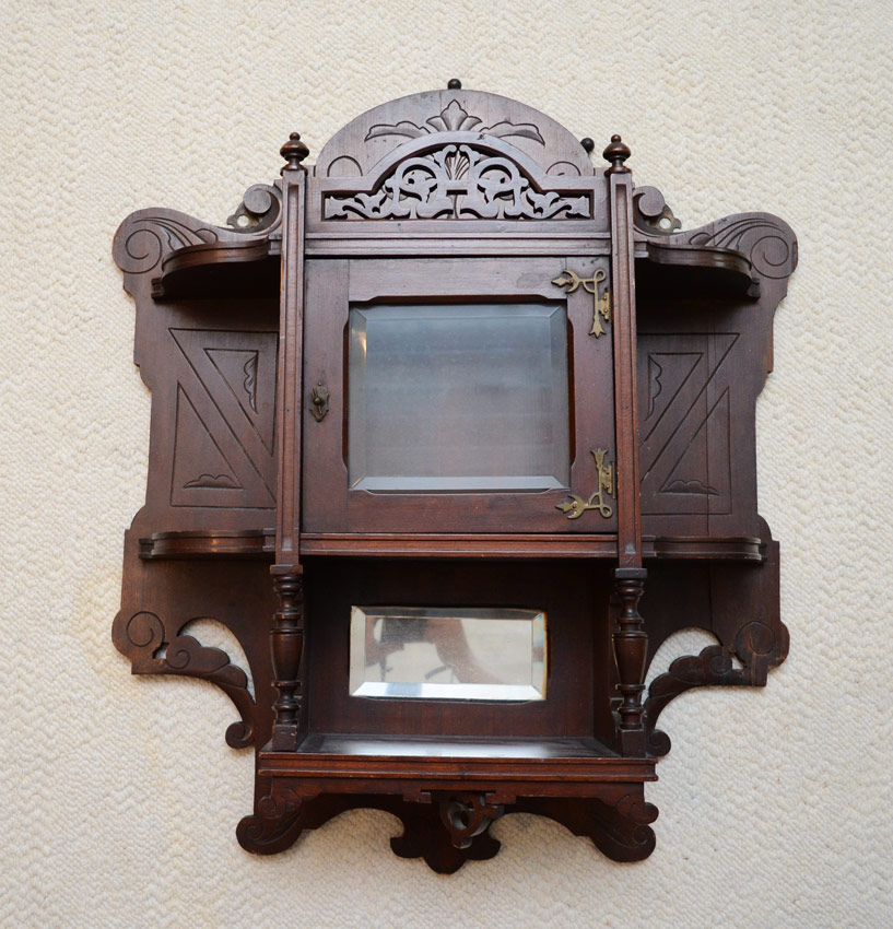 VICTORIAN WALL HANGING CUPBOARD: Carved back and side panels, pierced top front gallery. Single door with ornate hinges, beveled glass front over open shelf with beveled glass mirror back. 2 side shelves, turned column supports. 32 1/2'' h. x 27 3/4'' x 8''.