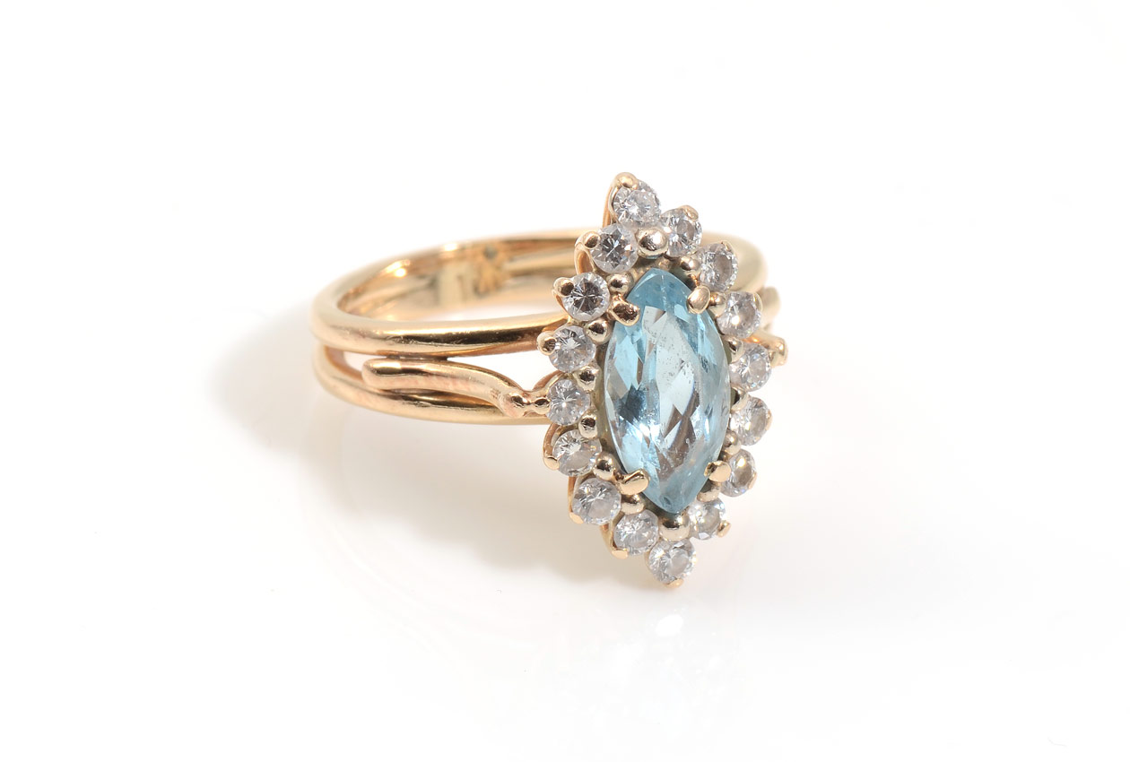 AQUAMARINE & DIAMOND RING: 14K yellow gold ring centers an approx 1.50 Ct marquise mixed cut aquamarine, rated VS in clarity (Type I), slgB in Hue, 2-3 in Tone and 2-3 in Saturation. Framed by 16 round brilliant cut diamonds totaling approx. .50 Ct., rated VS in clarity and G-H in color. The aquamarine and diamonds are prong set. Weight: 4.2 grams. Size: 5