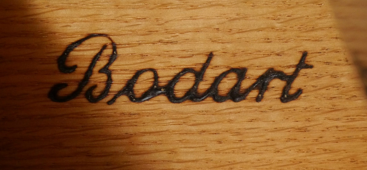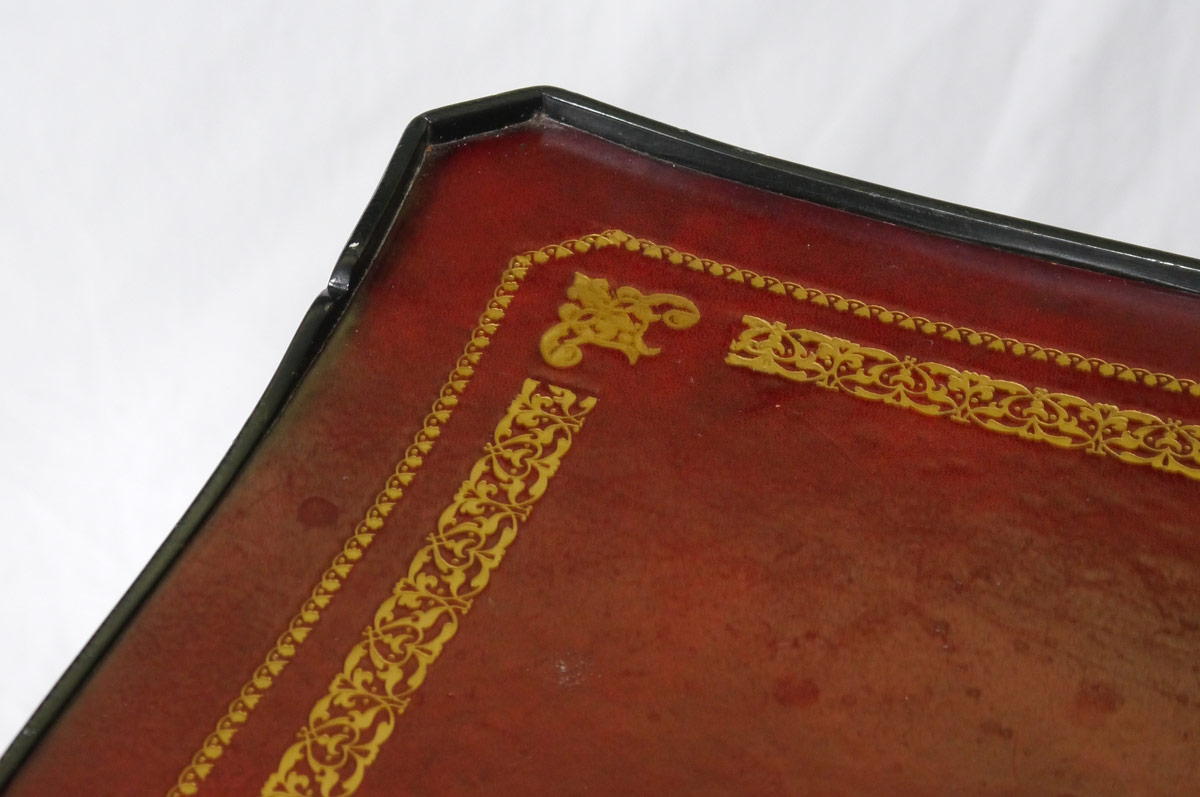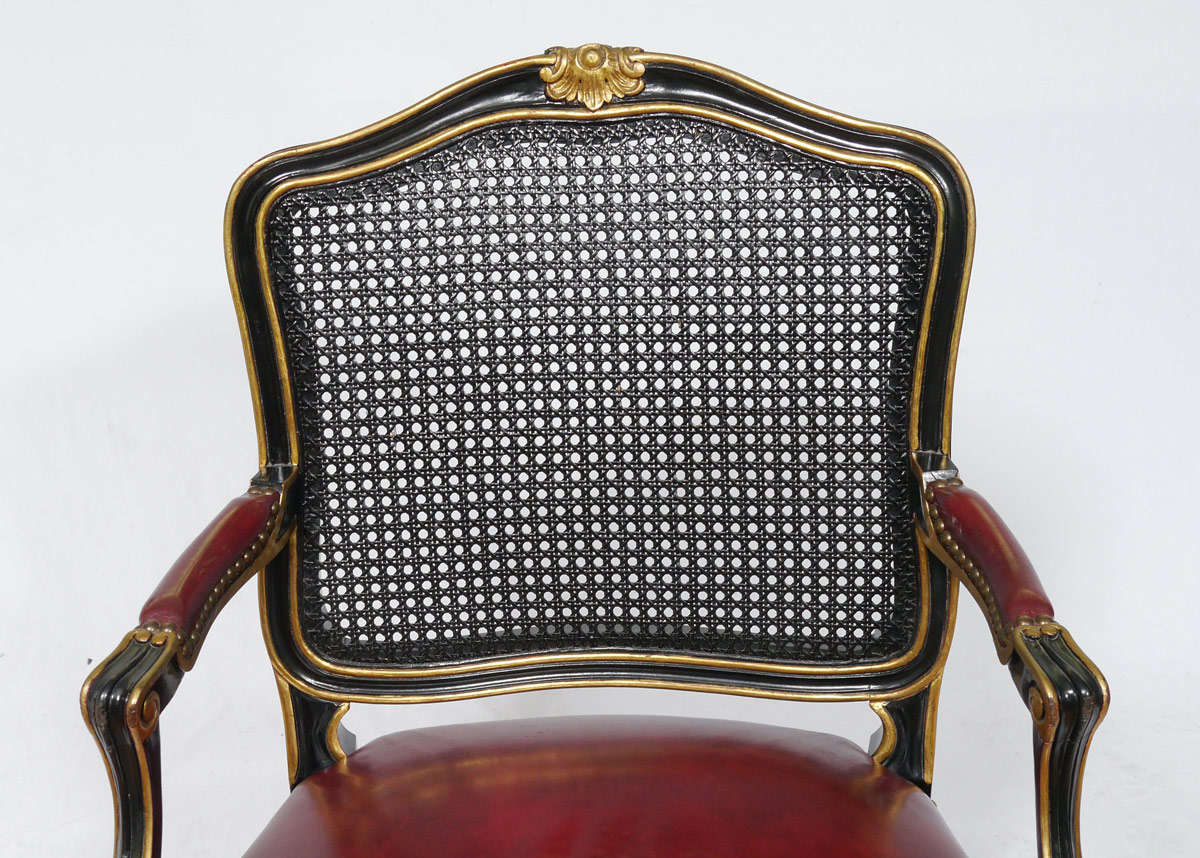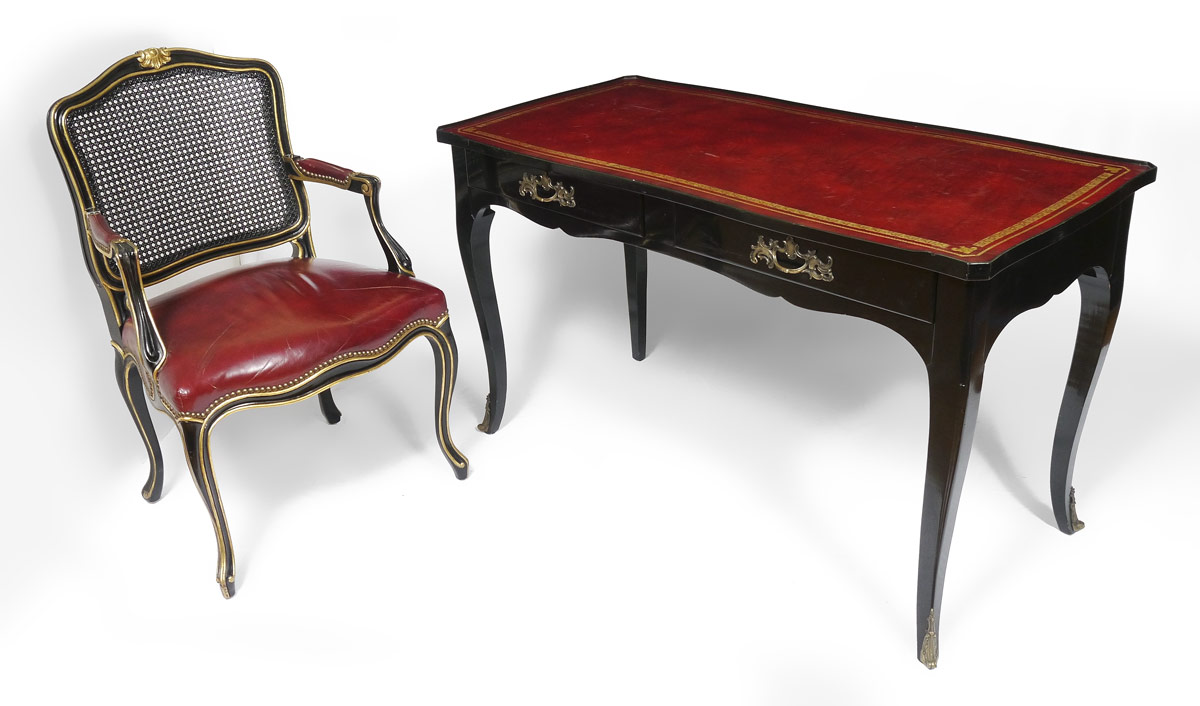 BODART FRENCH STYLE LEATHER TOP DESK & CHAIR: Inset embossed red leather top, ebony finish, 2 drawers, shaped legs. 30'' h. x 50 3/4'' x 25''. Chair with caned back, tacked red leather seat and arm rests. 38'' h. x 24 1/2'' x 21 3/4''.